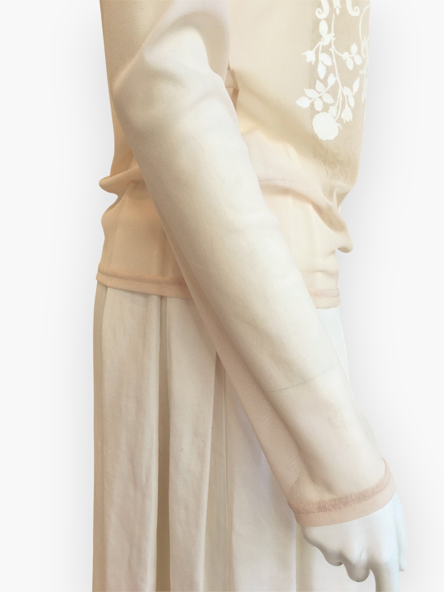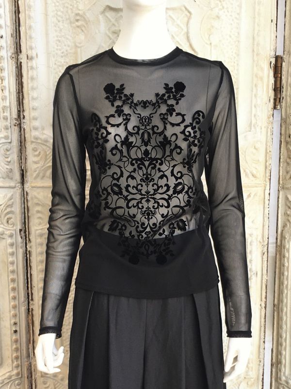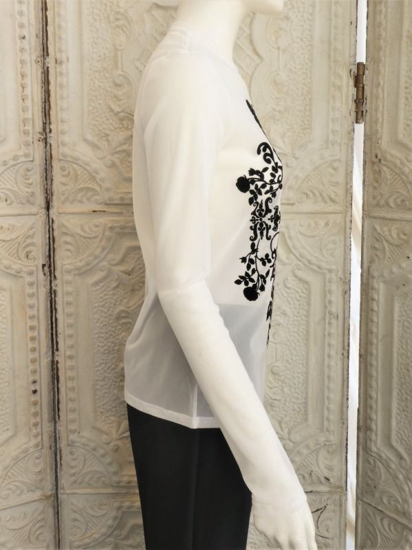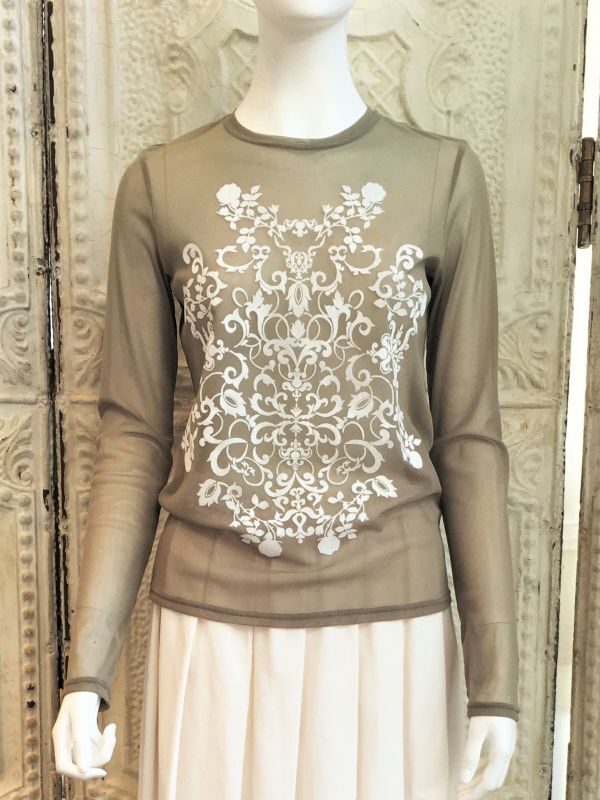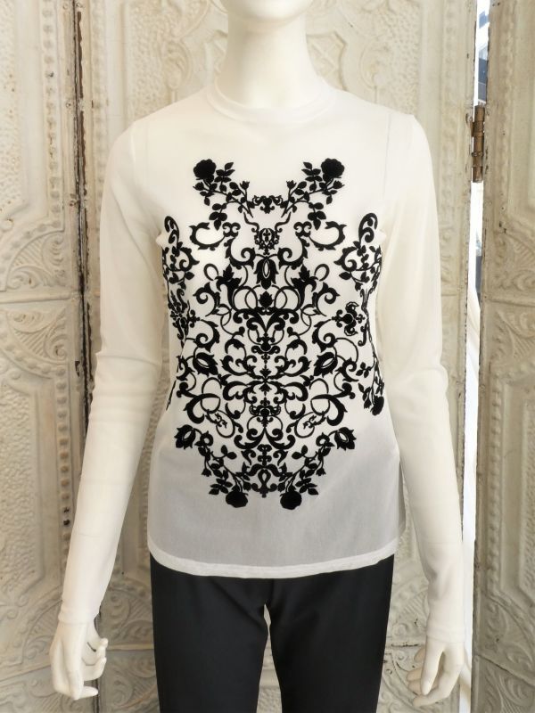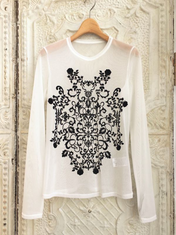 ヨーロッパの紋章の様な柄にトロンプルイユローズ柄を飛ばしたオリジナルフロッキー加工ブラウス。