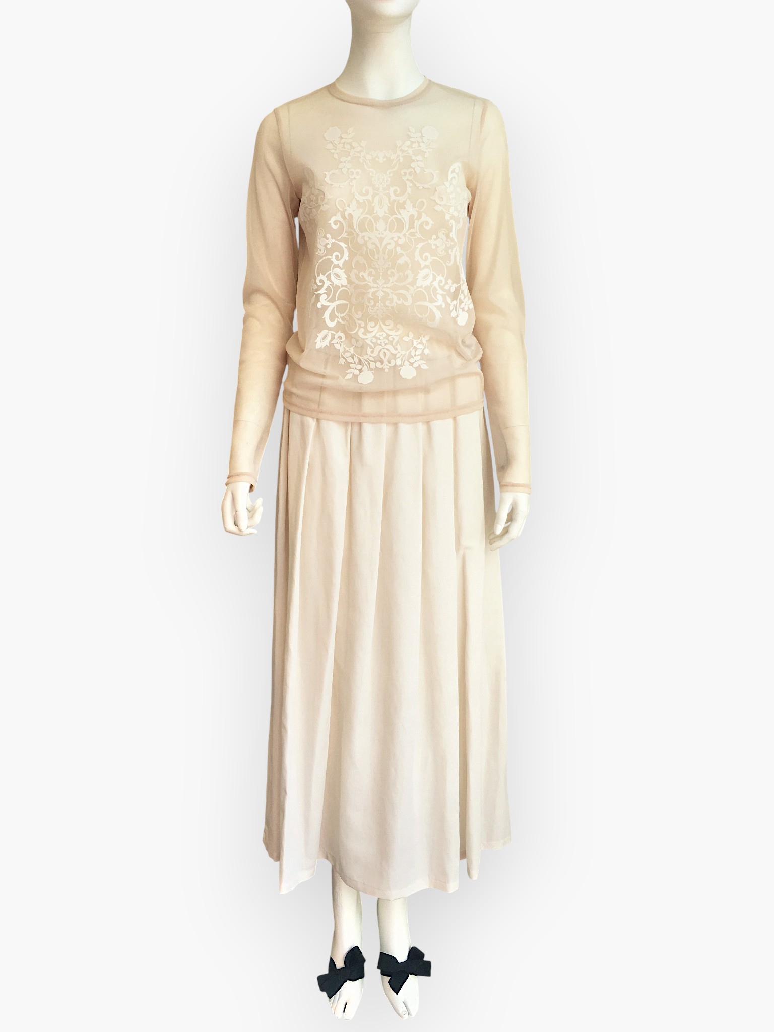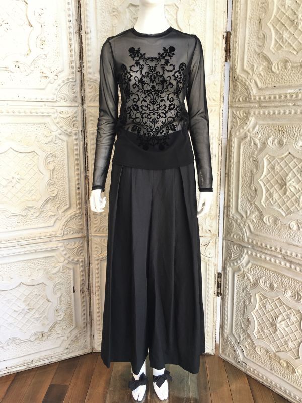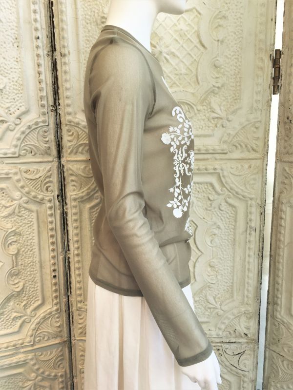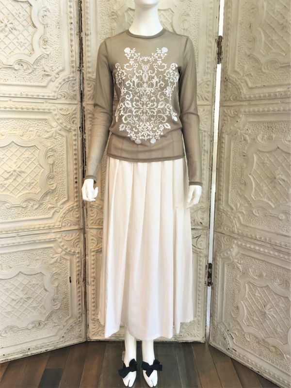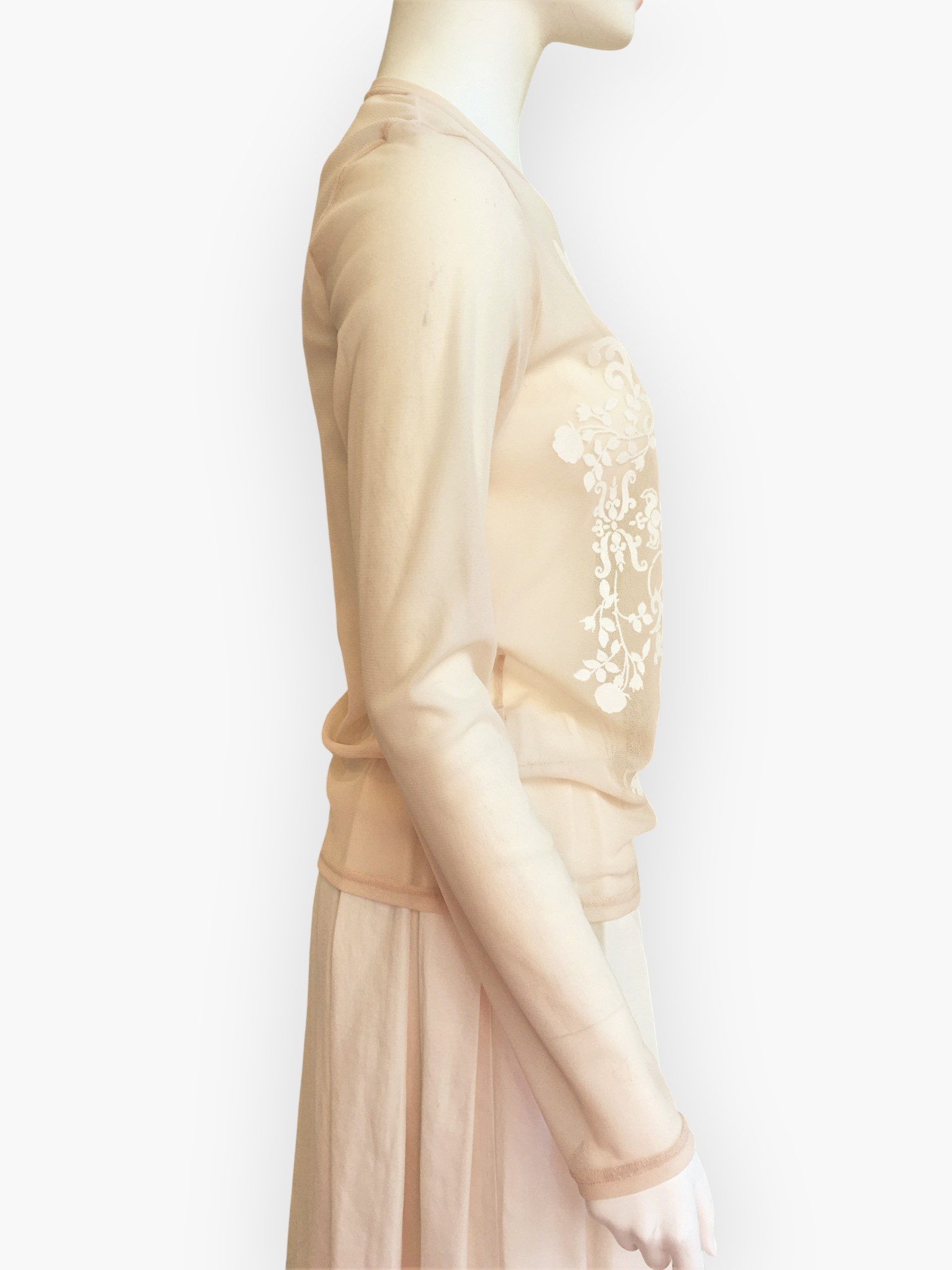ヨーロッパの紋章の様な柄にトロンプルイユローズ柄を飛ばしたオリジナルフロッキー加工ブラウス。