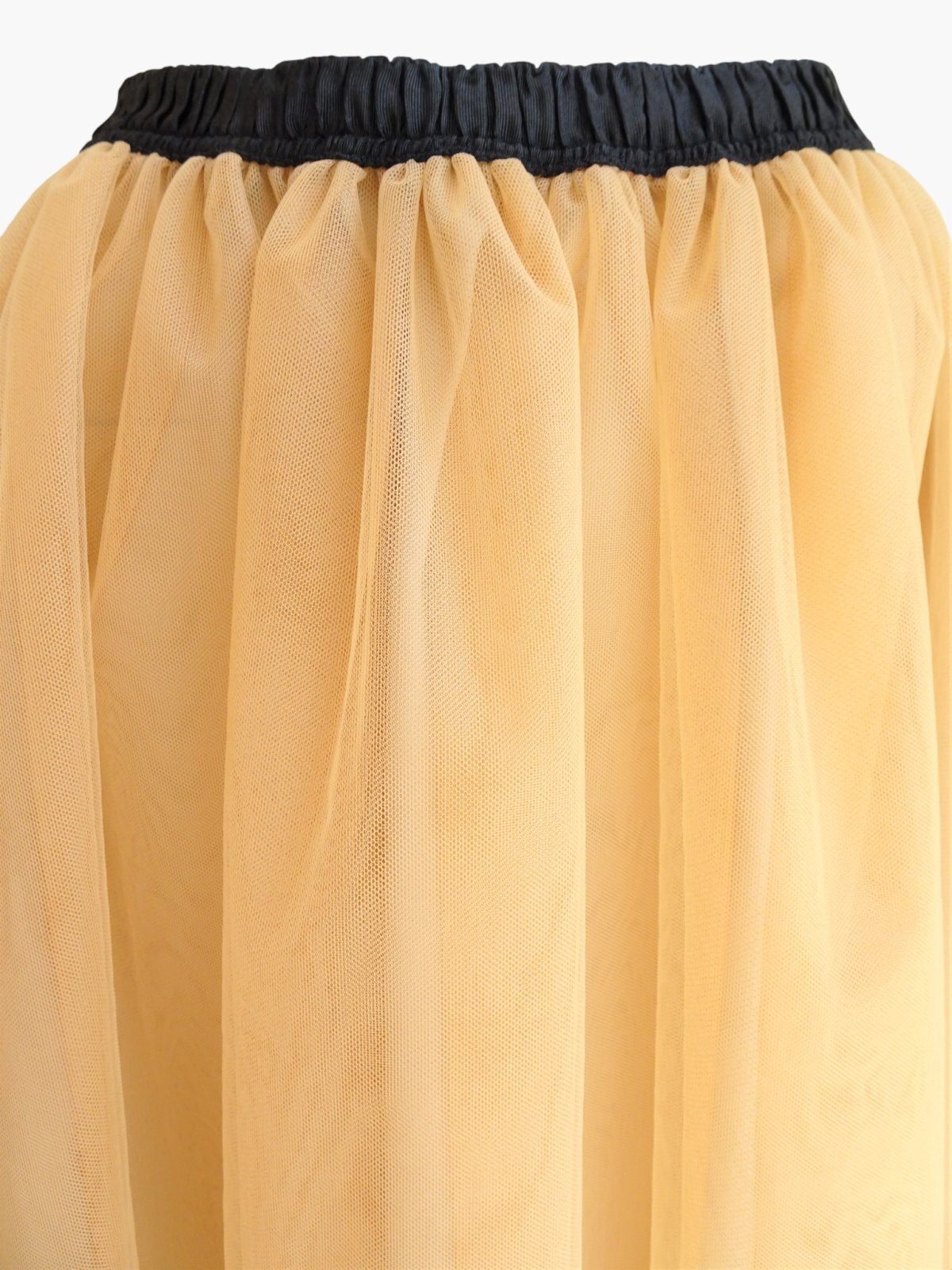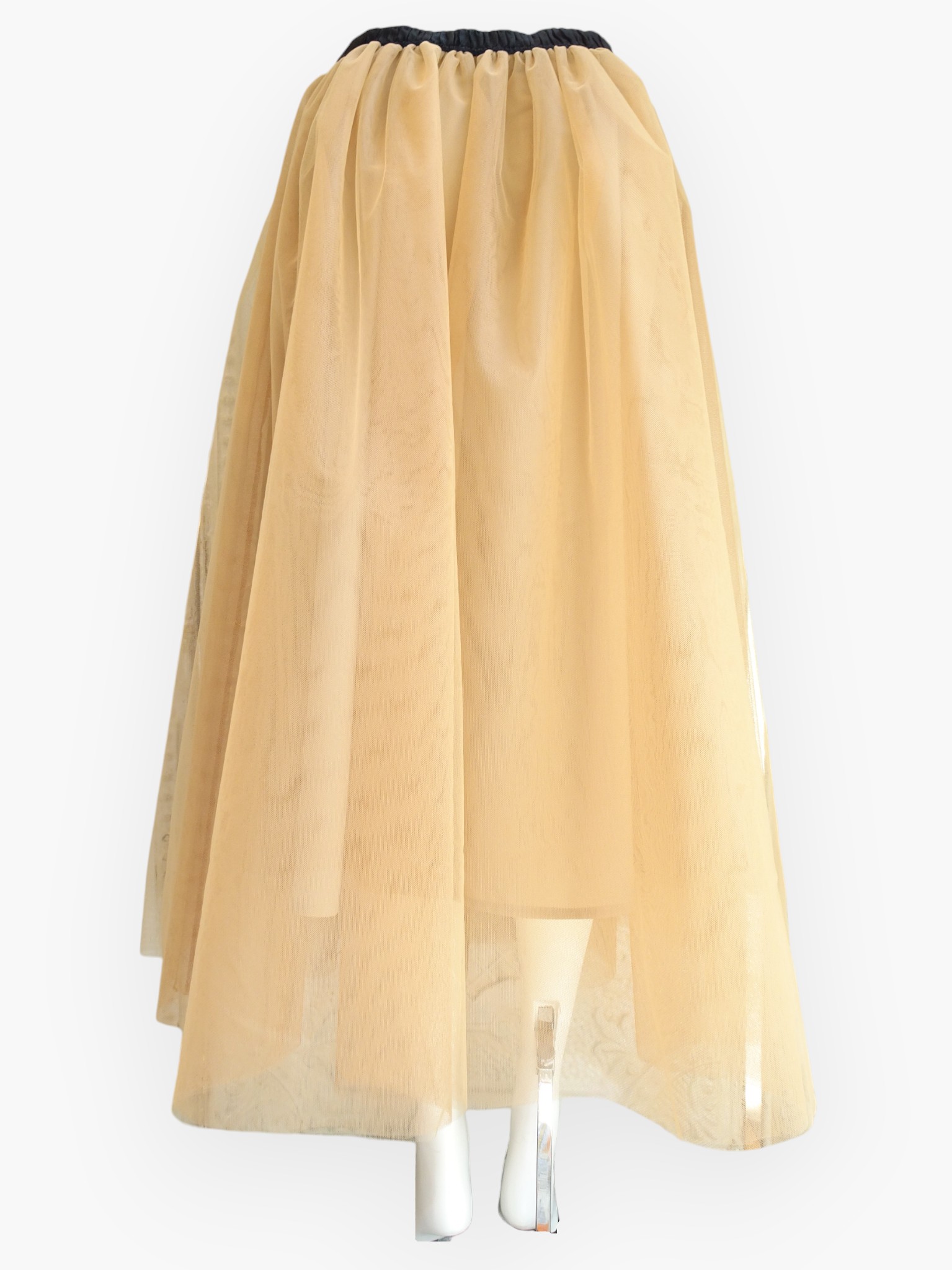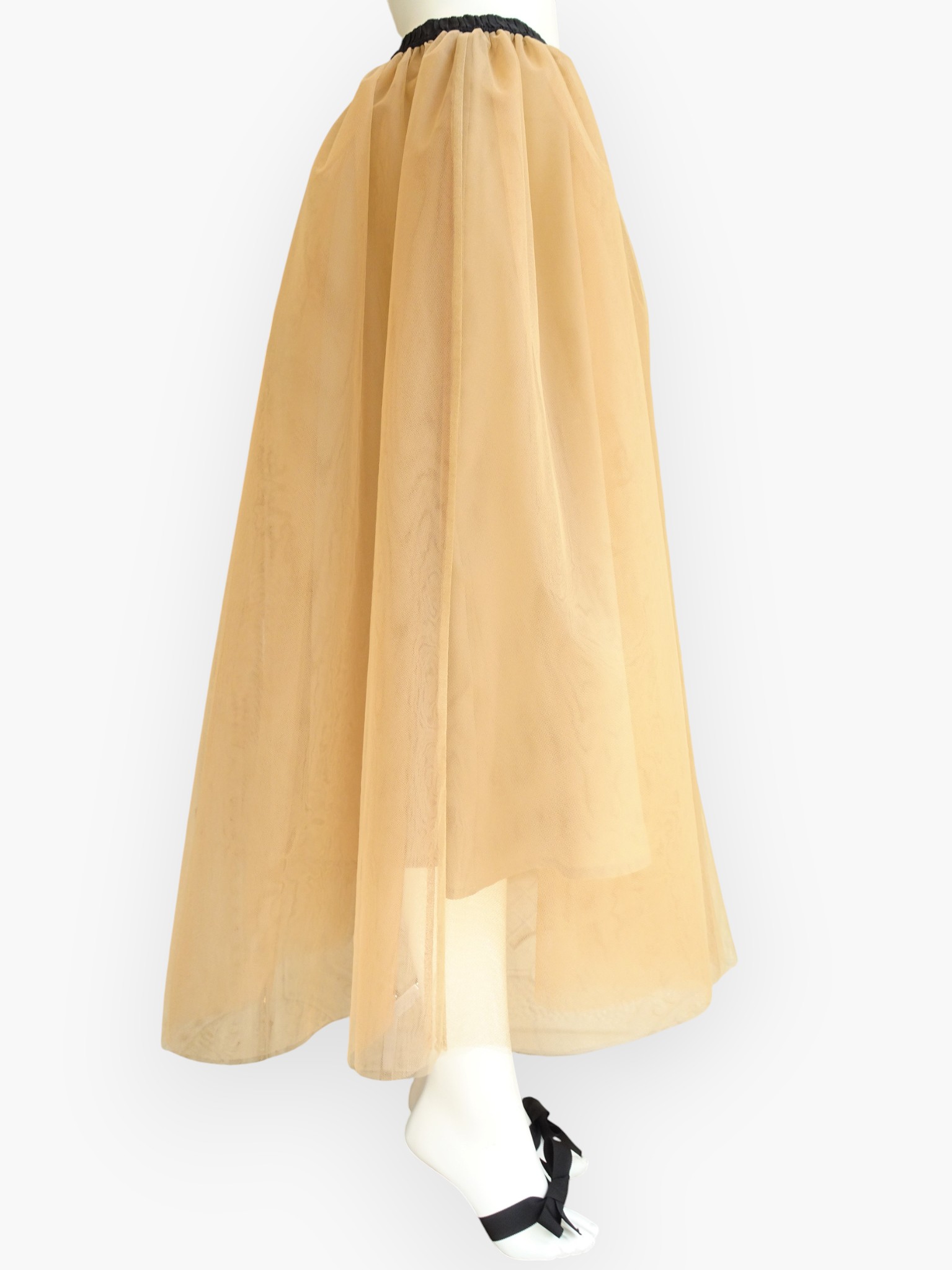 柔らかなチュールを2枚重ね、その下にハリ感があるチュールを重ねることでふわっとしたシルエットをキープ。