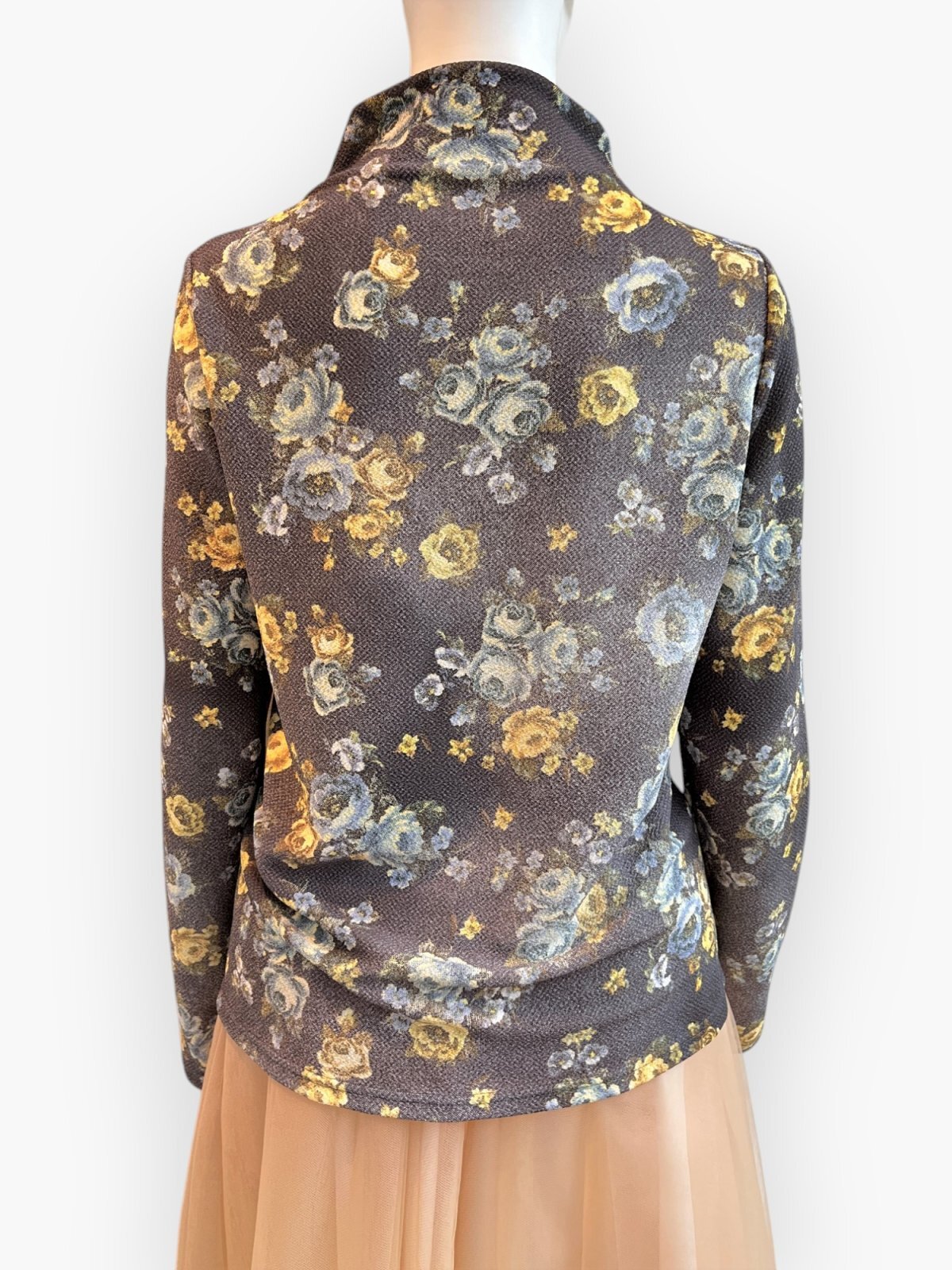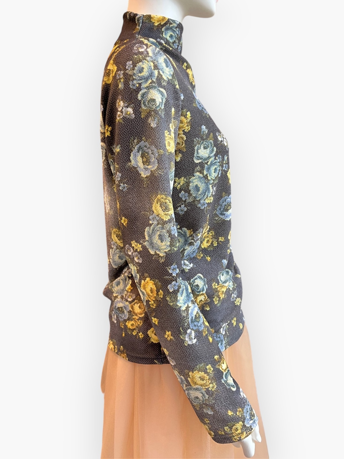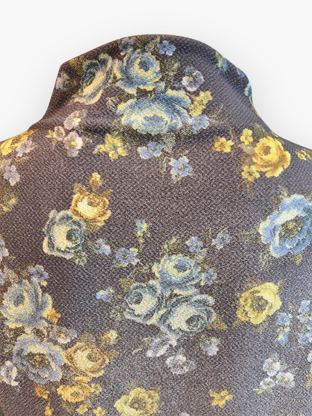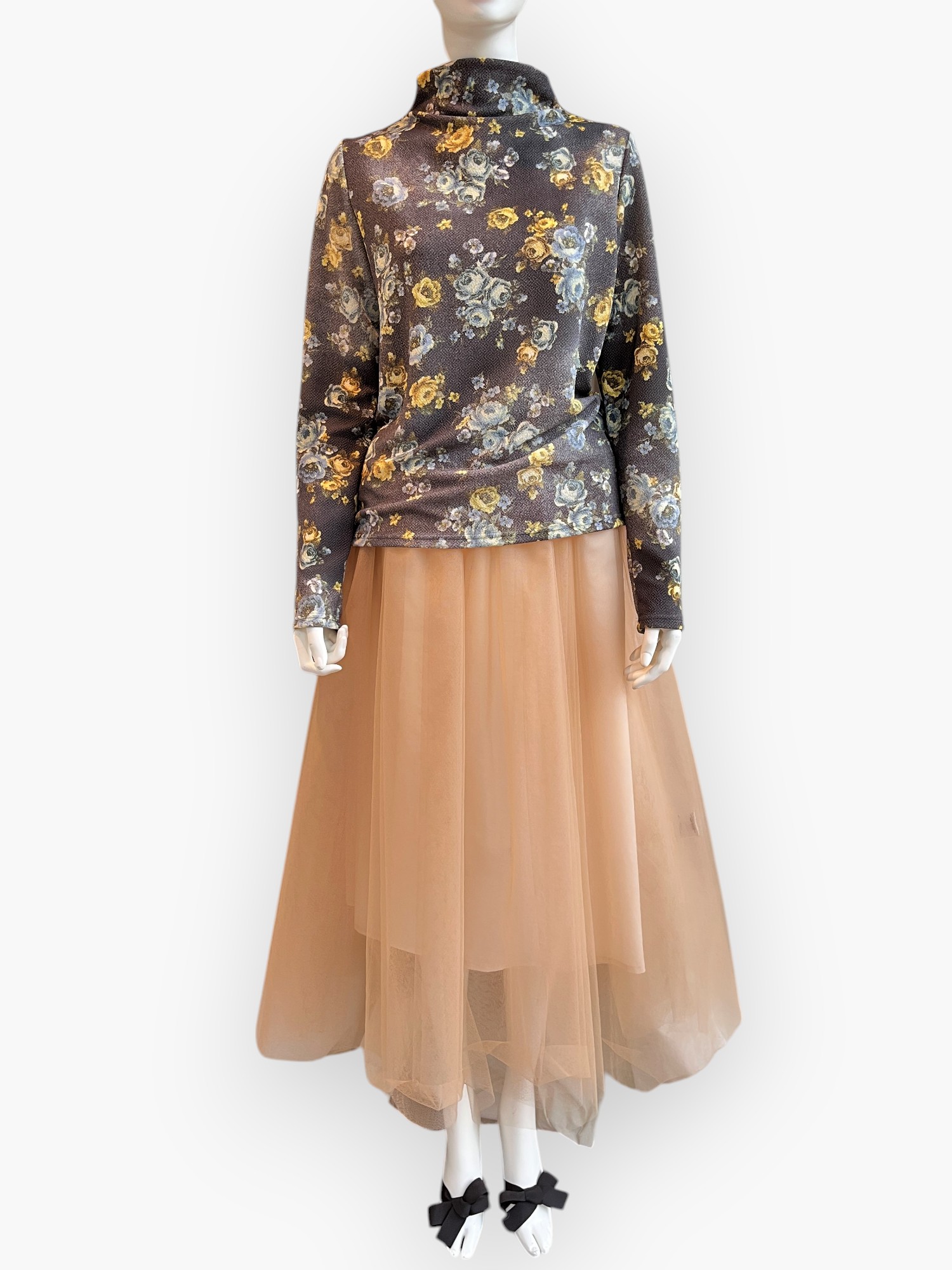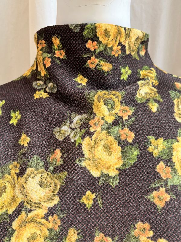 ふくらみと軽量感のある凸凹組織のアムンゼン素材に所々かすれたシャビ―感をだしたオリジナルフラワープリントカットソー。
