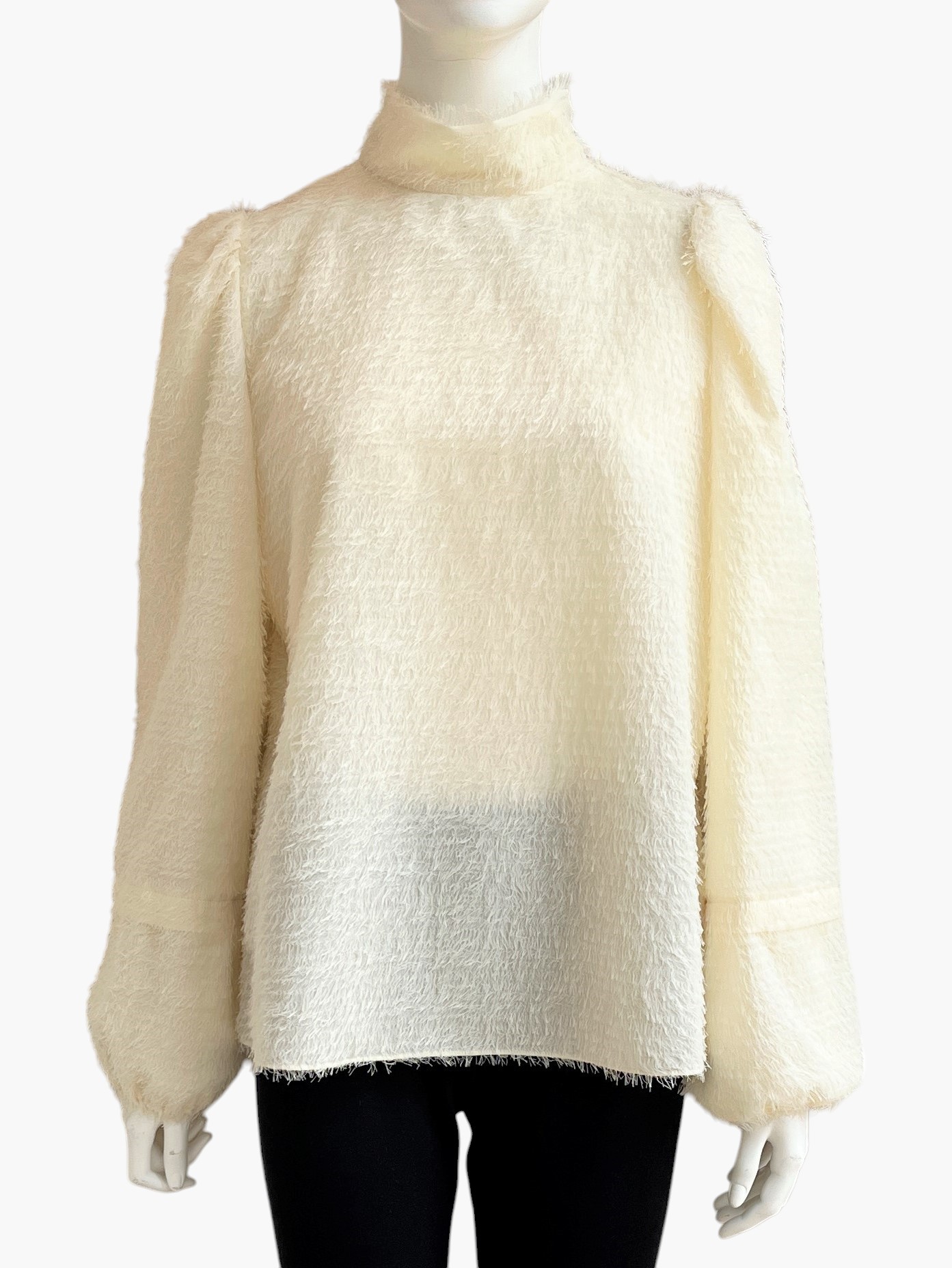 ループカットした毛先をトリアセテートにすることで上品な光沢感と風合いを表現したカットジャガード素材のブラウス。