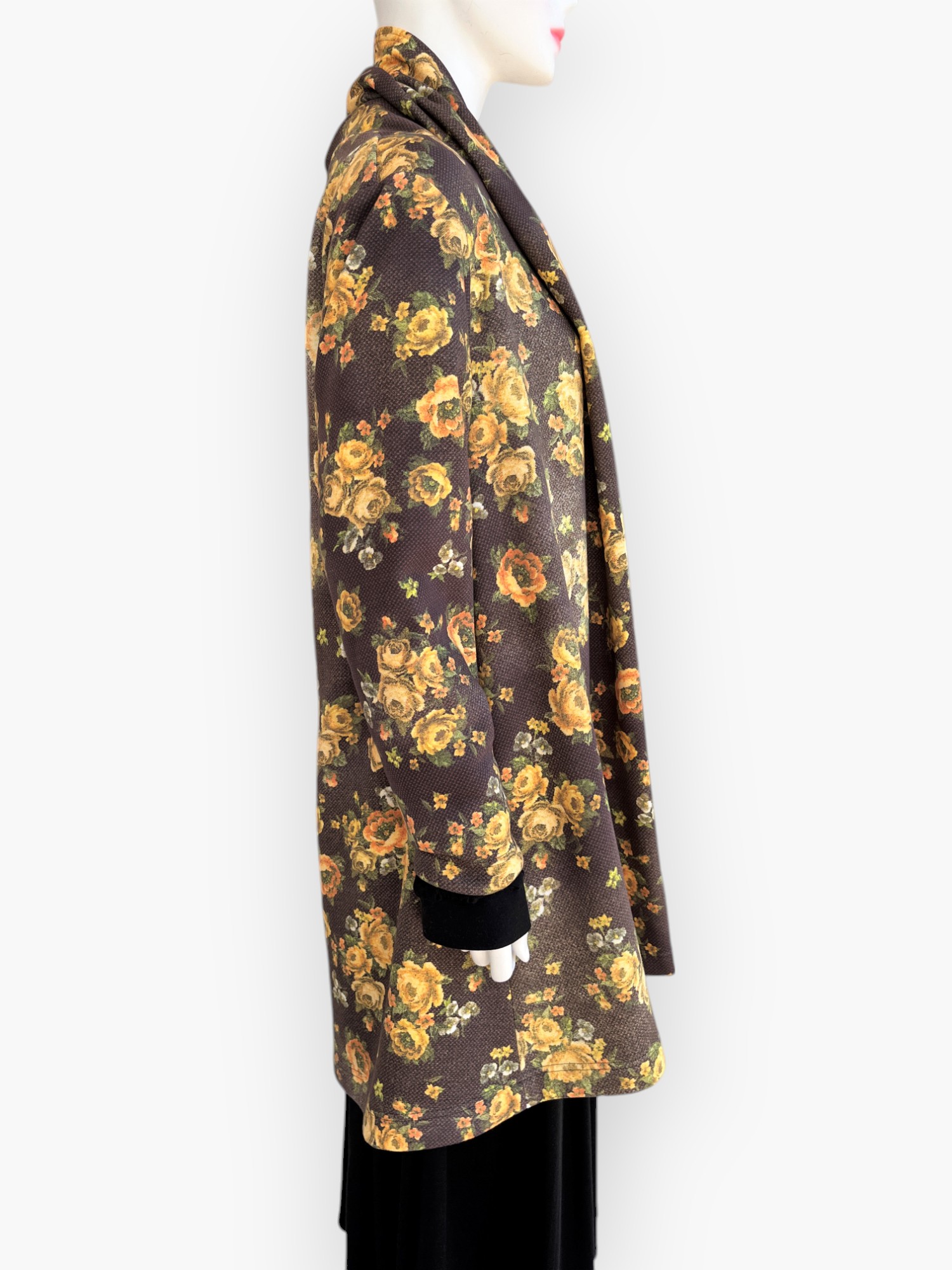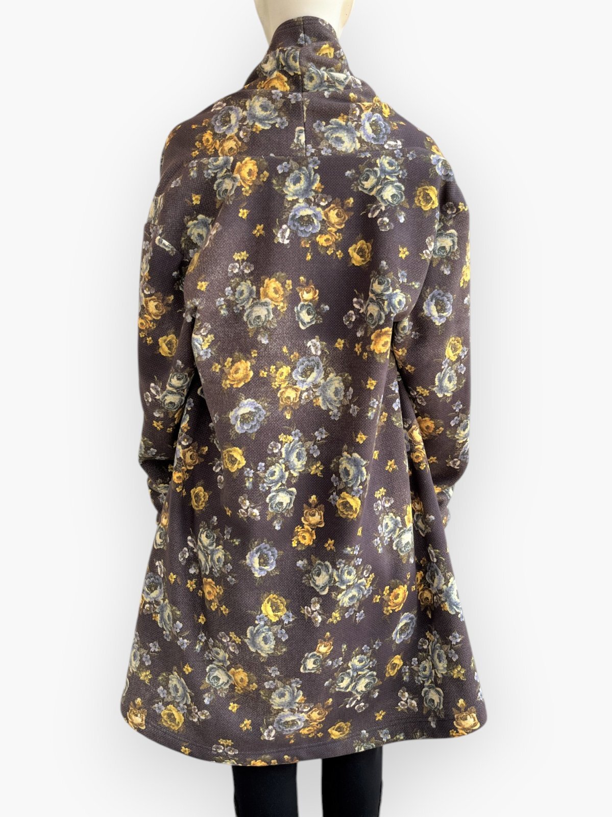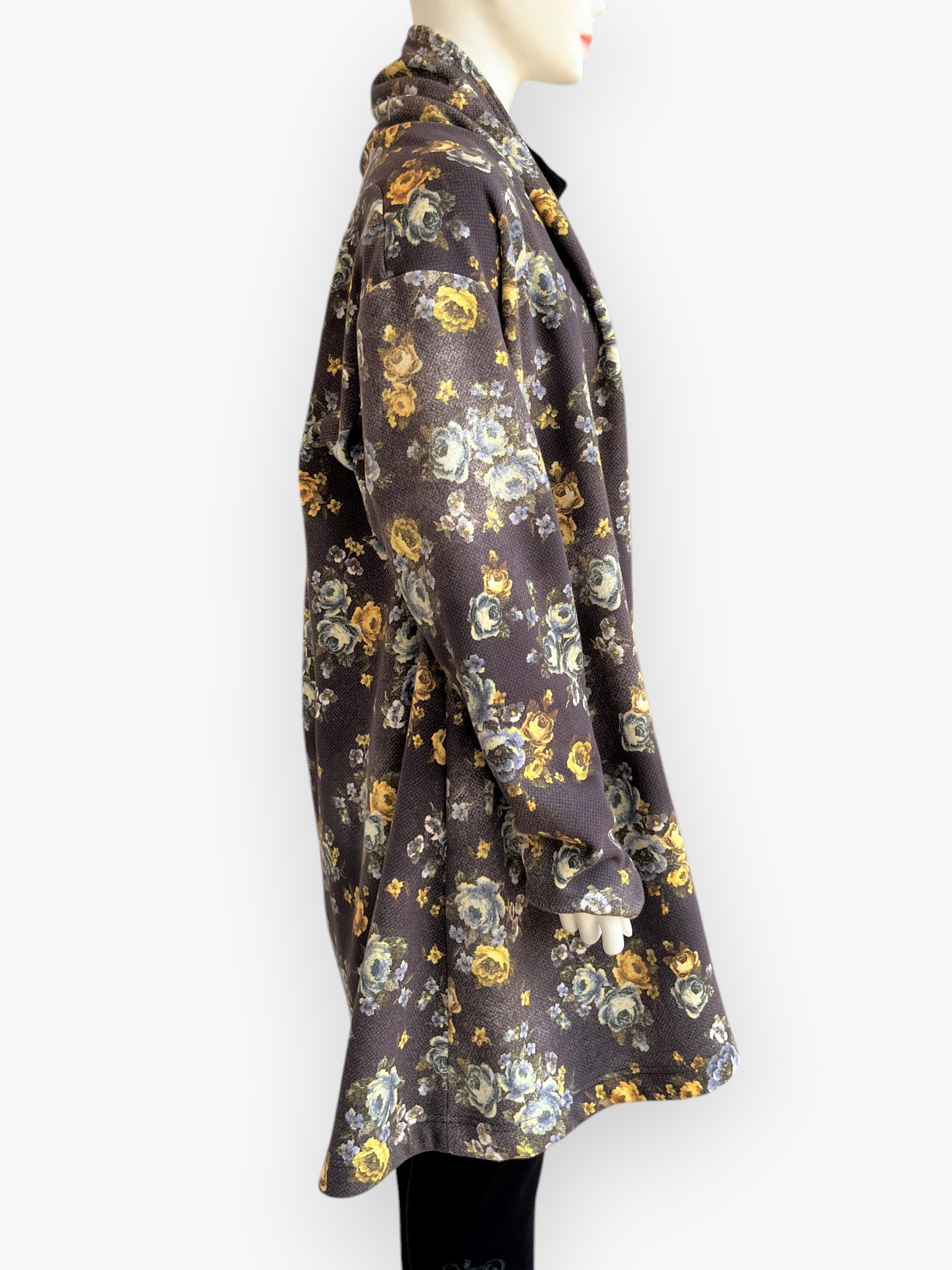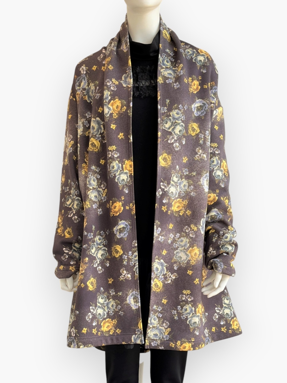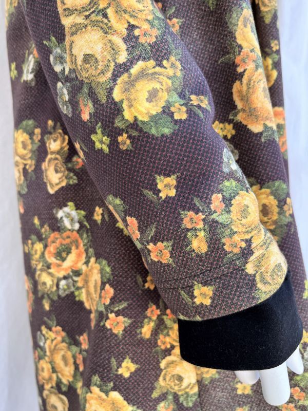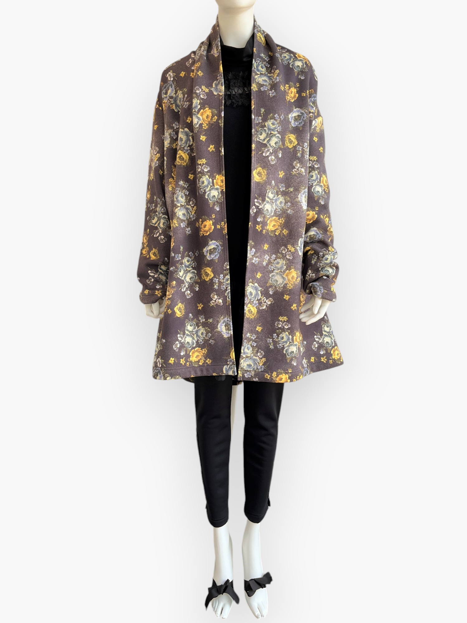 裏起毛のフリース素材に所々かすれたシャビ―感をだしたオリジナルフラワープリントロングジャケット。