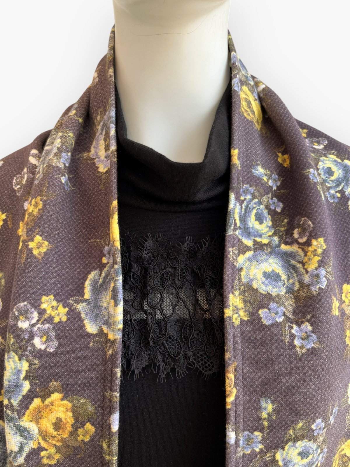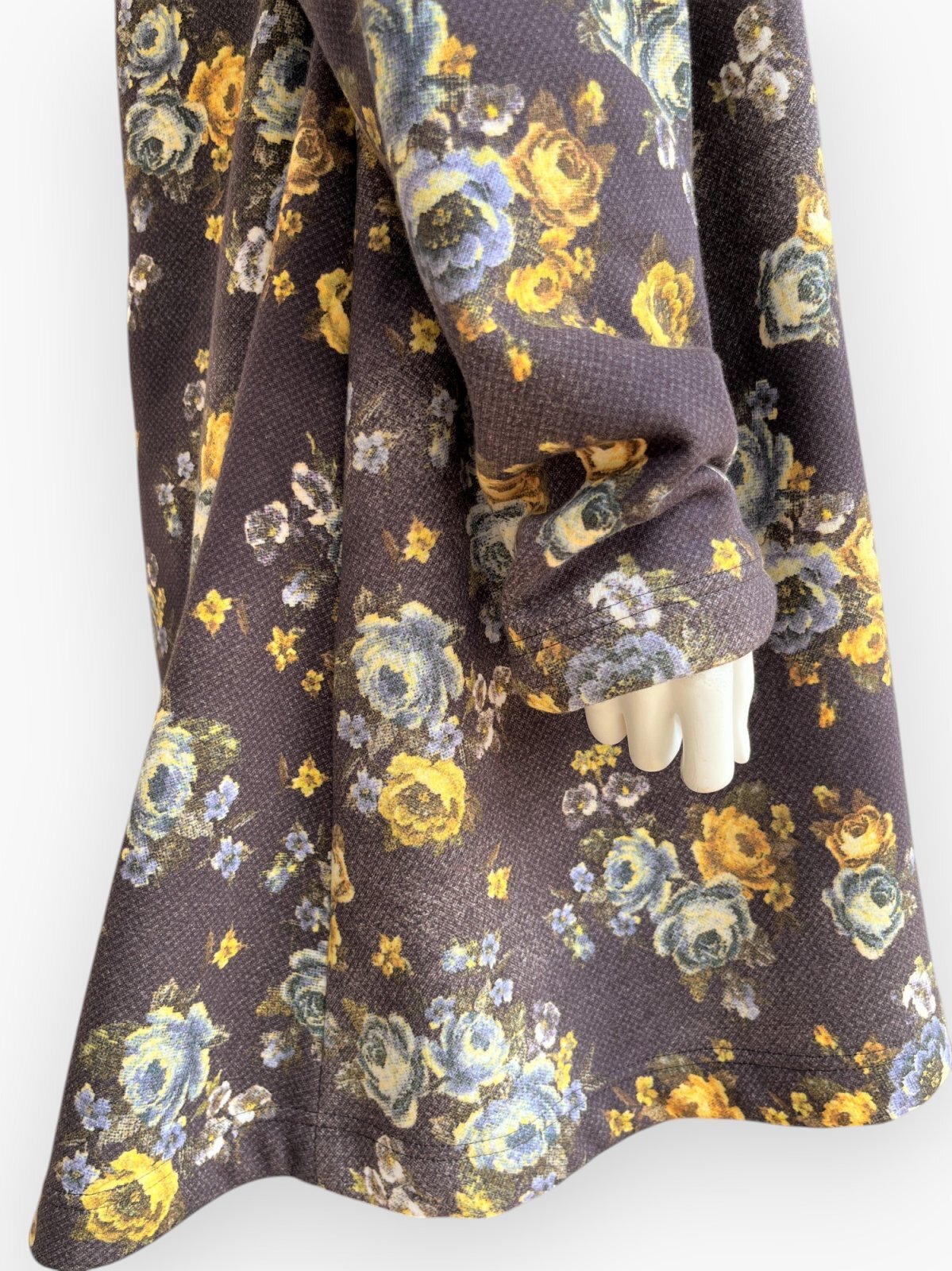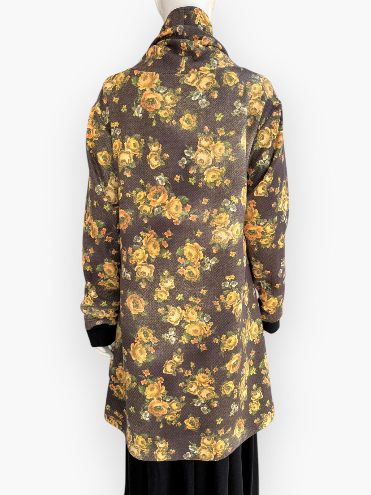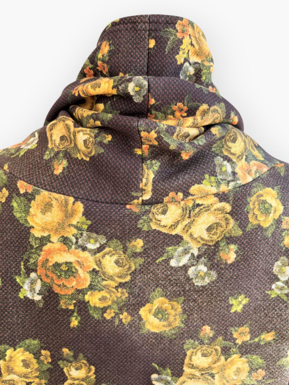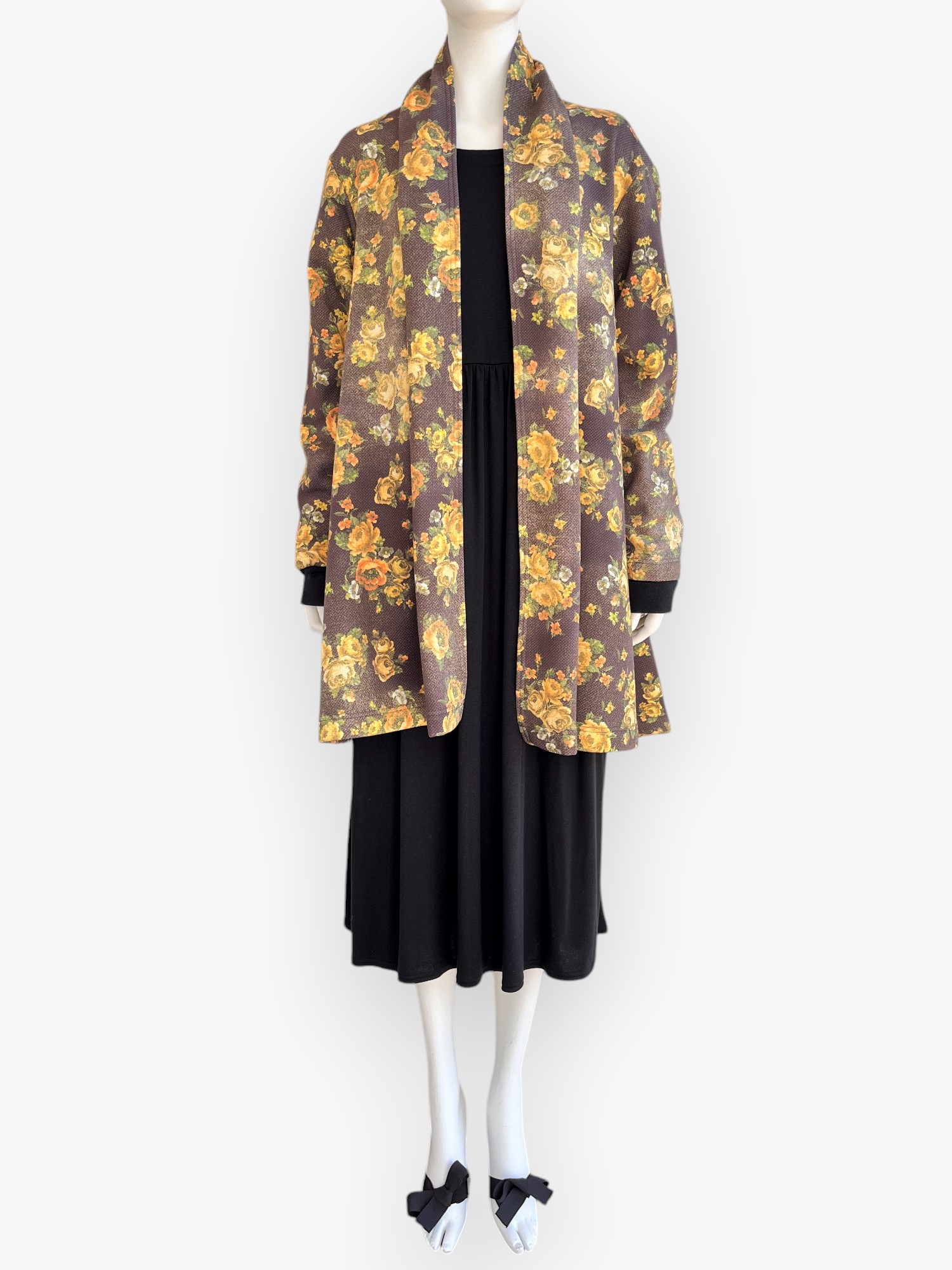 裏起毛のフリース素材に所々かすれたシャビ―感をだしたオリジナルフラワープリントロングジャケット。