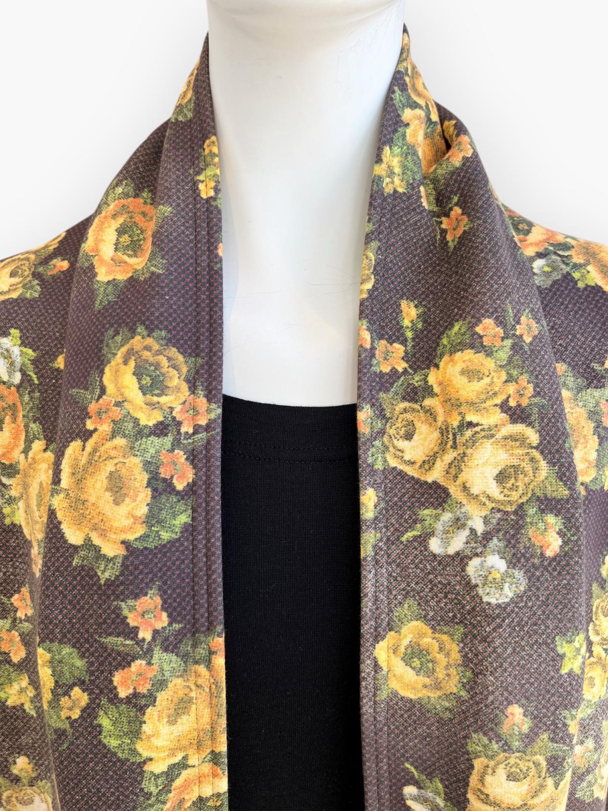 裾にかけてフレアーにひろがるシルエットでボリュームを付けたカーディガン風のジャケットは着回しやすい着流しタイプ。