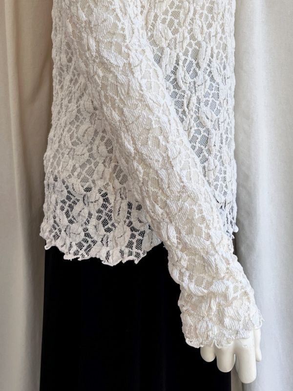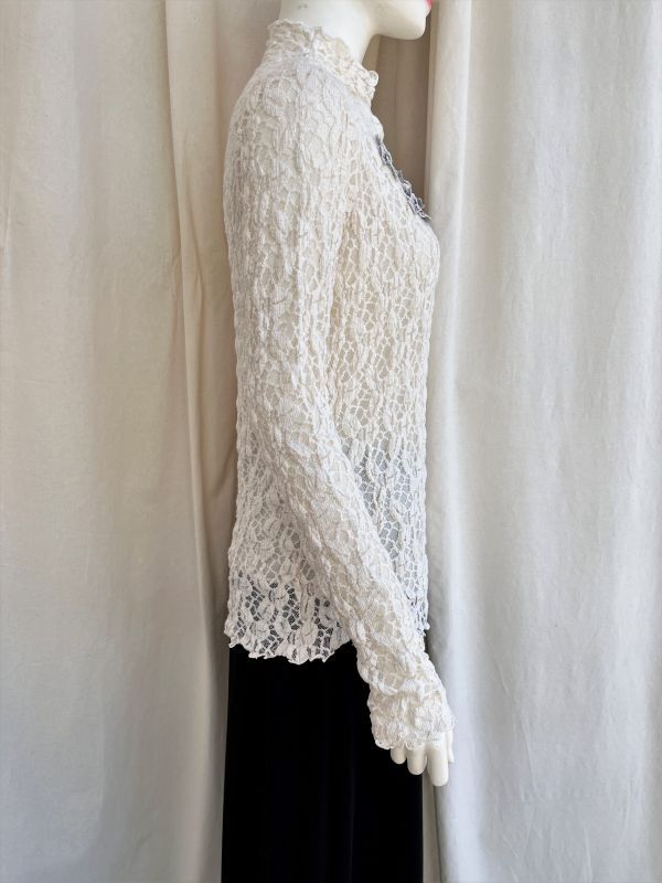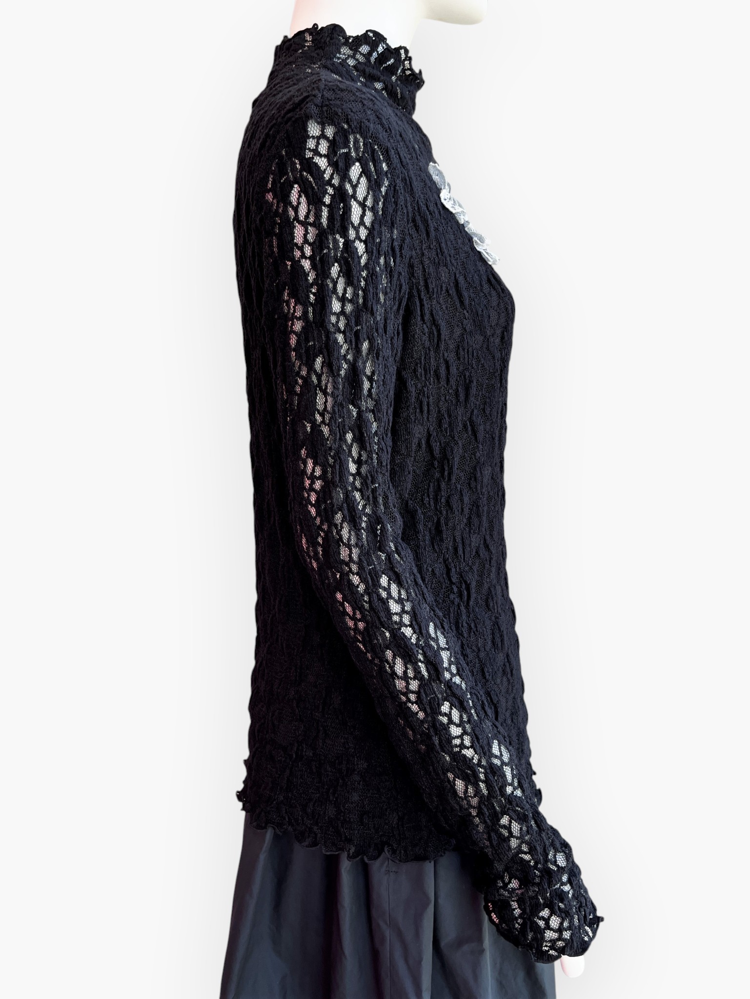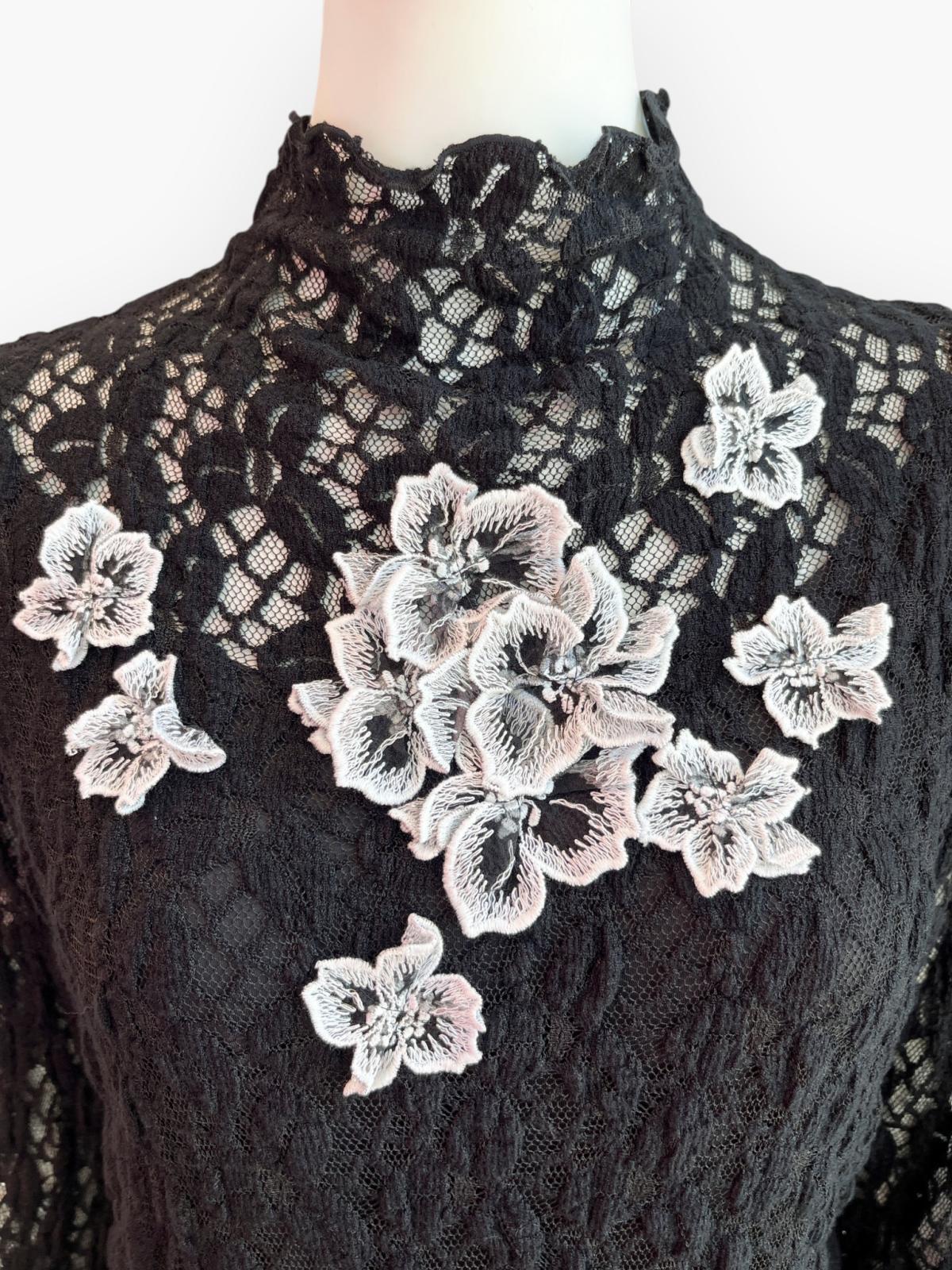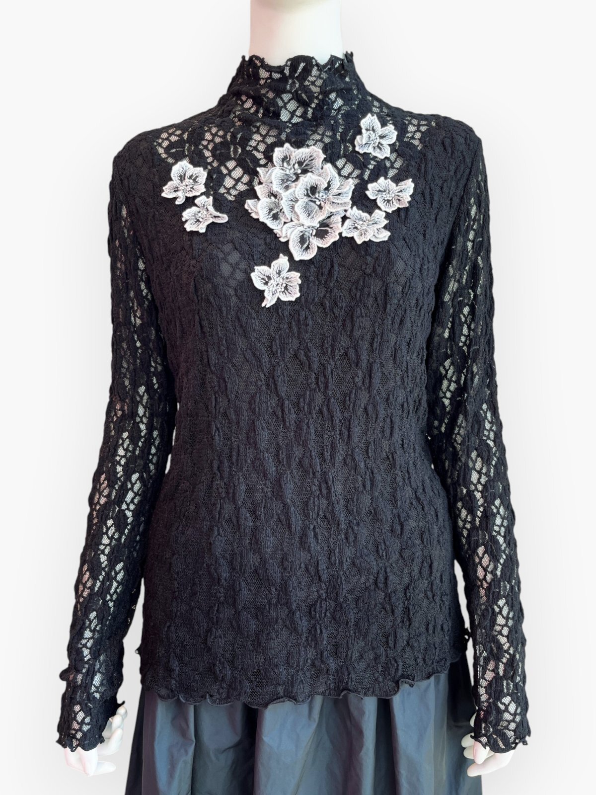 ブラックオーガンジーに白い刺繍を施した花モチーフレースがエレガントなブラウス。