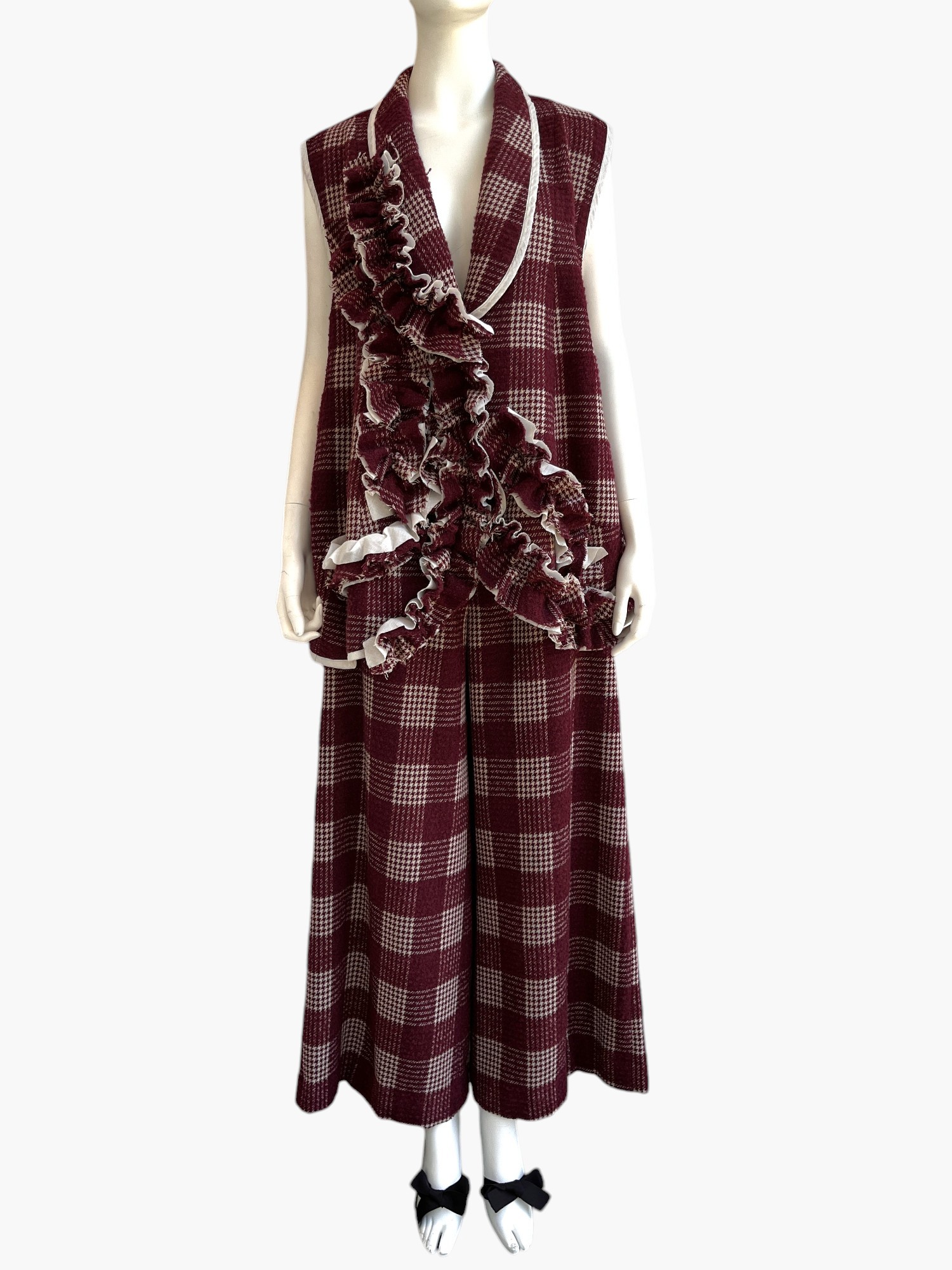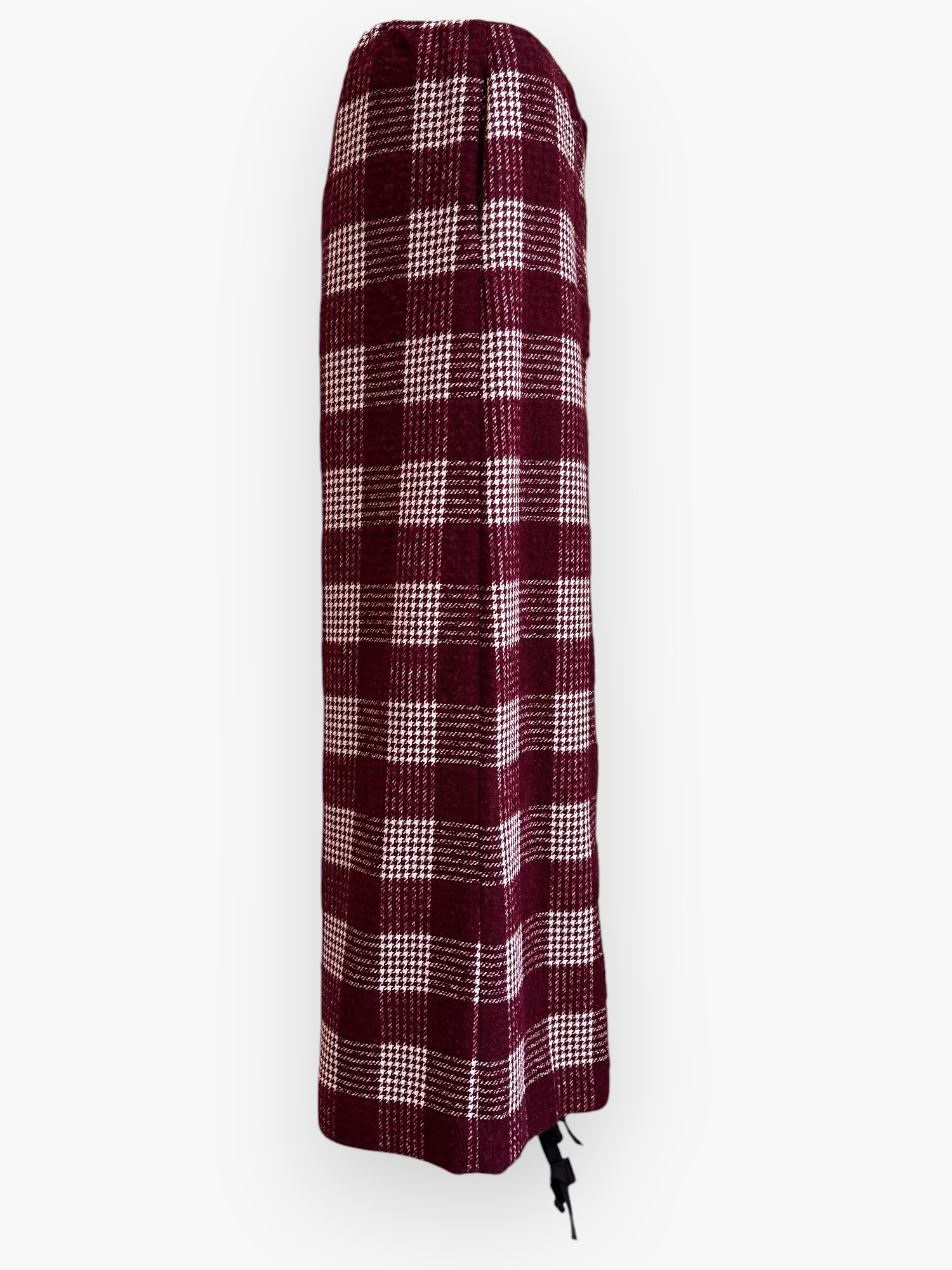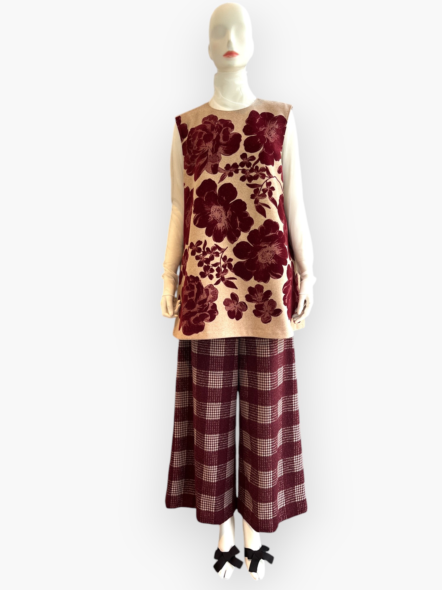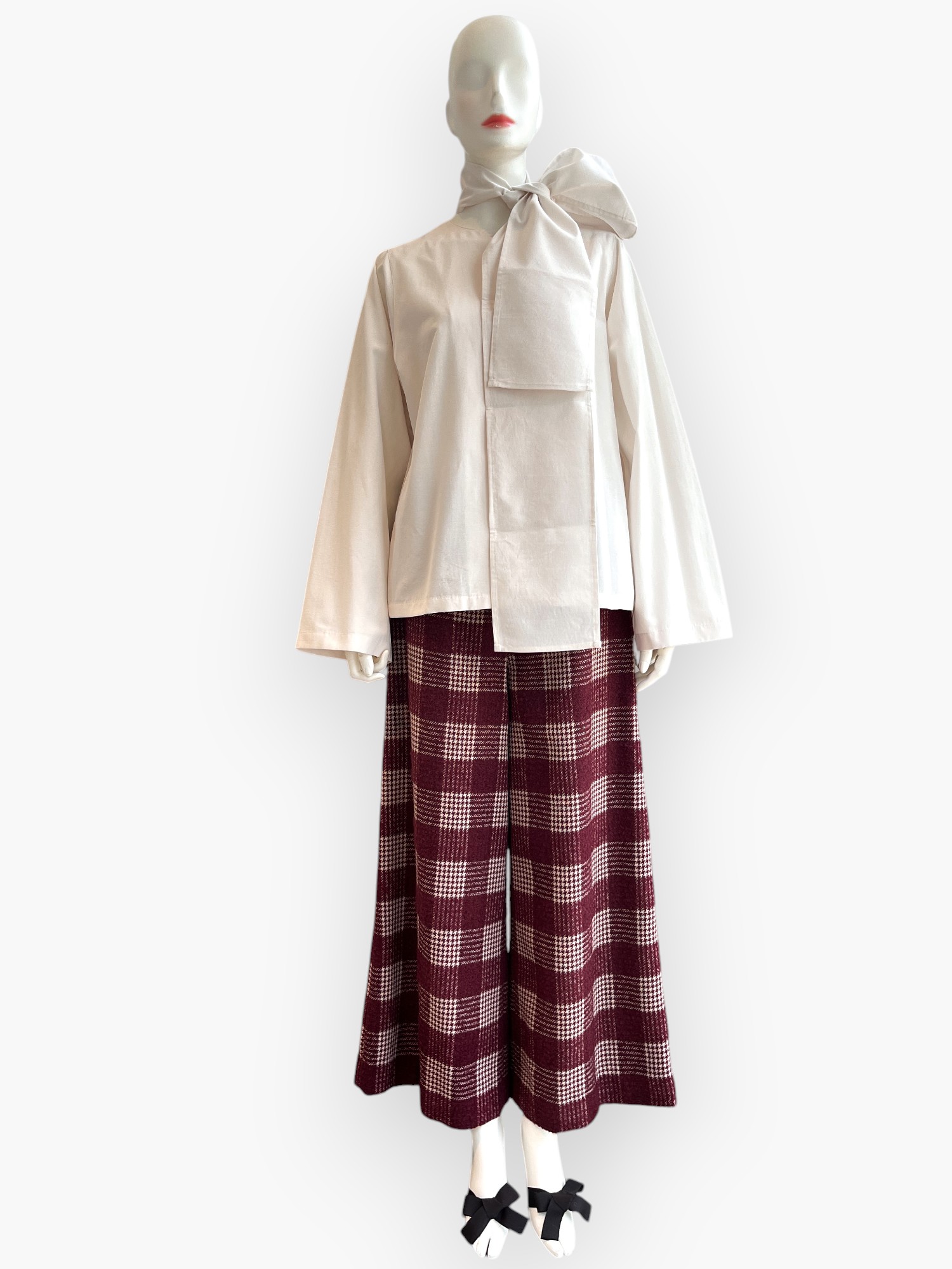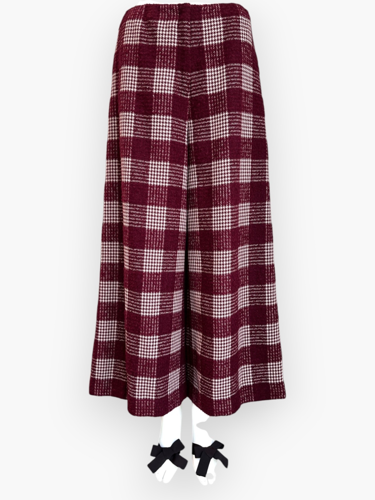 秋冬のムードを高めてくれるバーガンディーカラーが目を引くチェックパンツ。