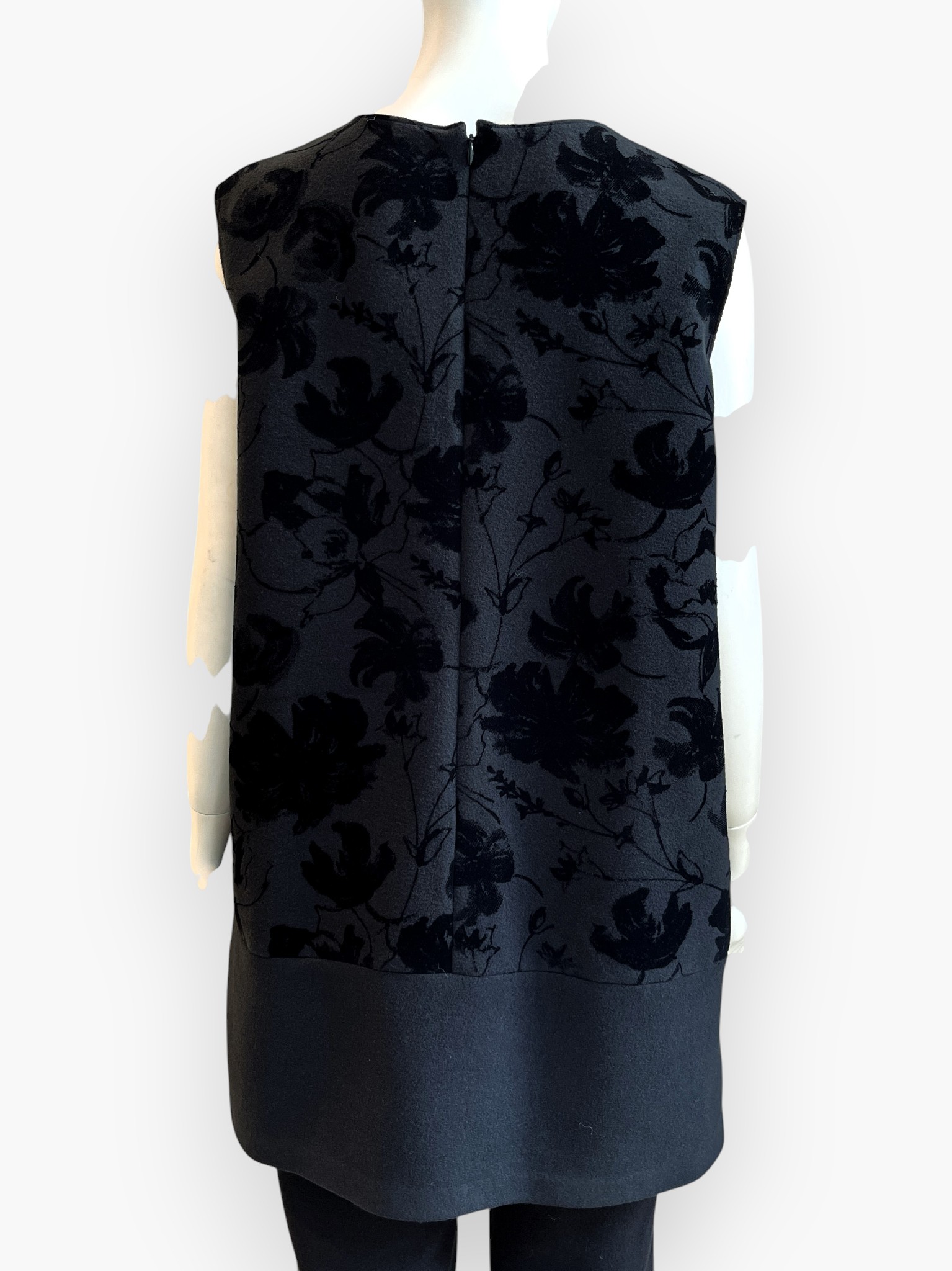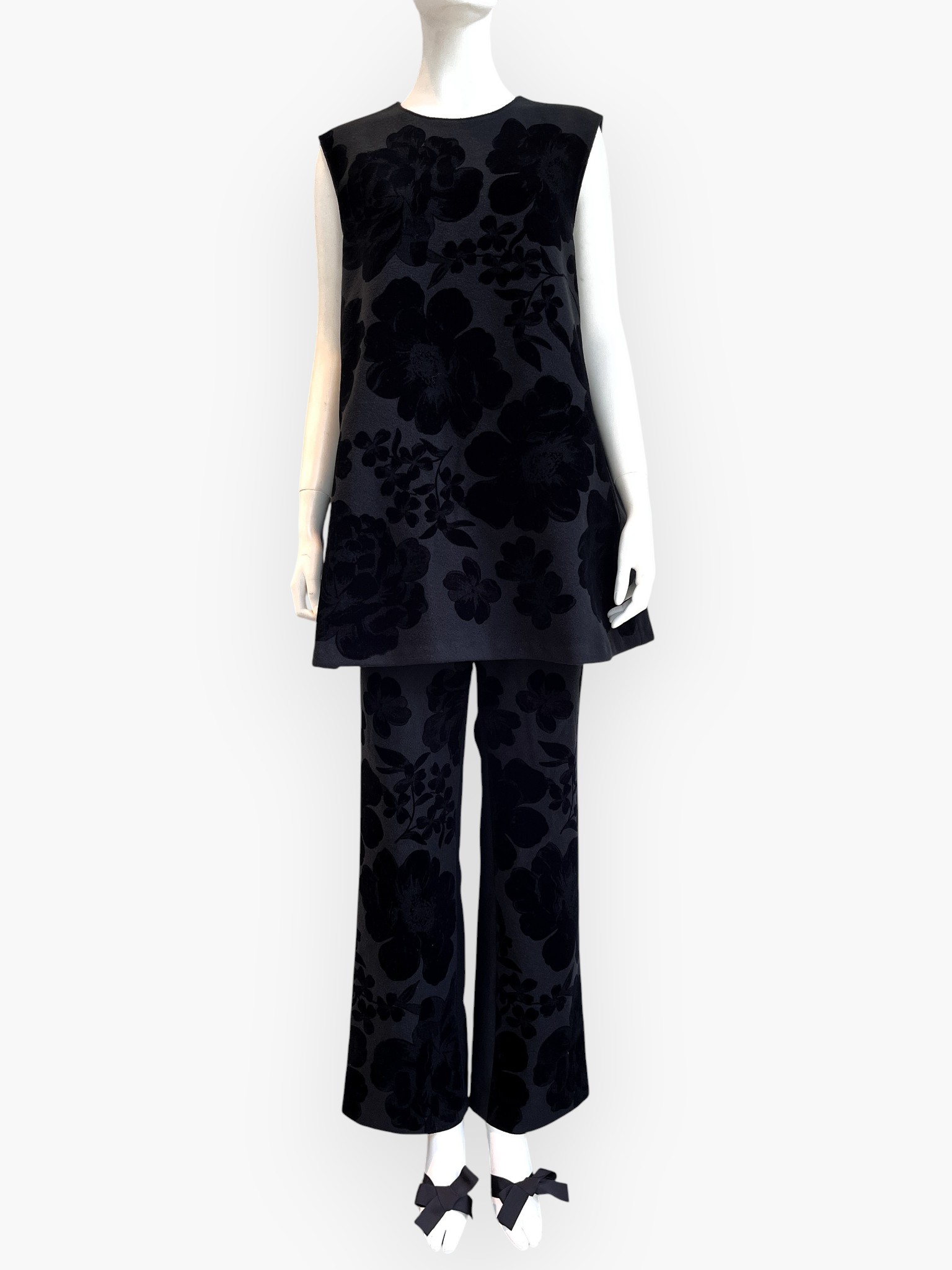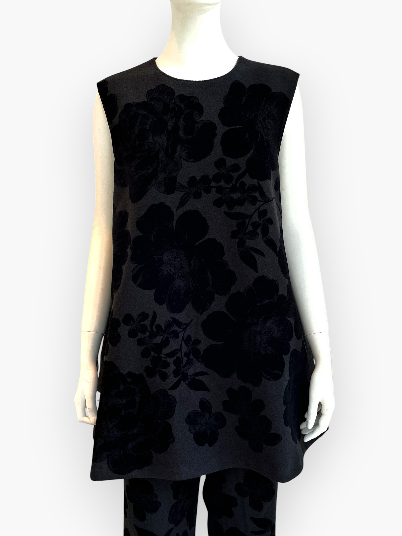 インパクトのある大柄フラワーと合わせやすい総柄フラワーをフロッキー加工したチュニック。