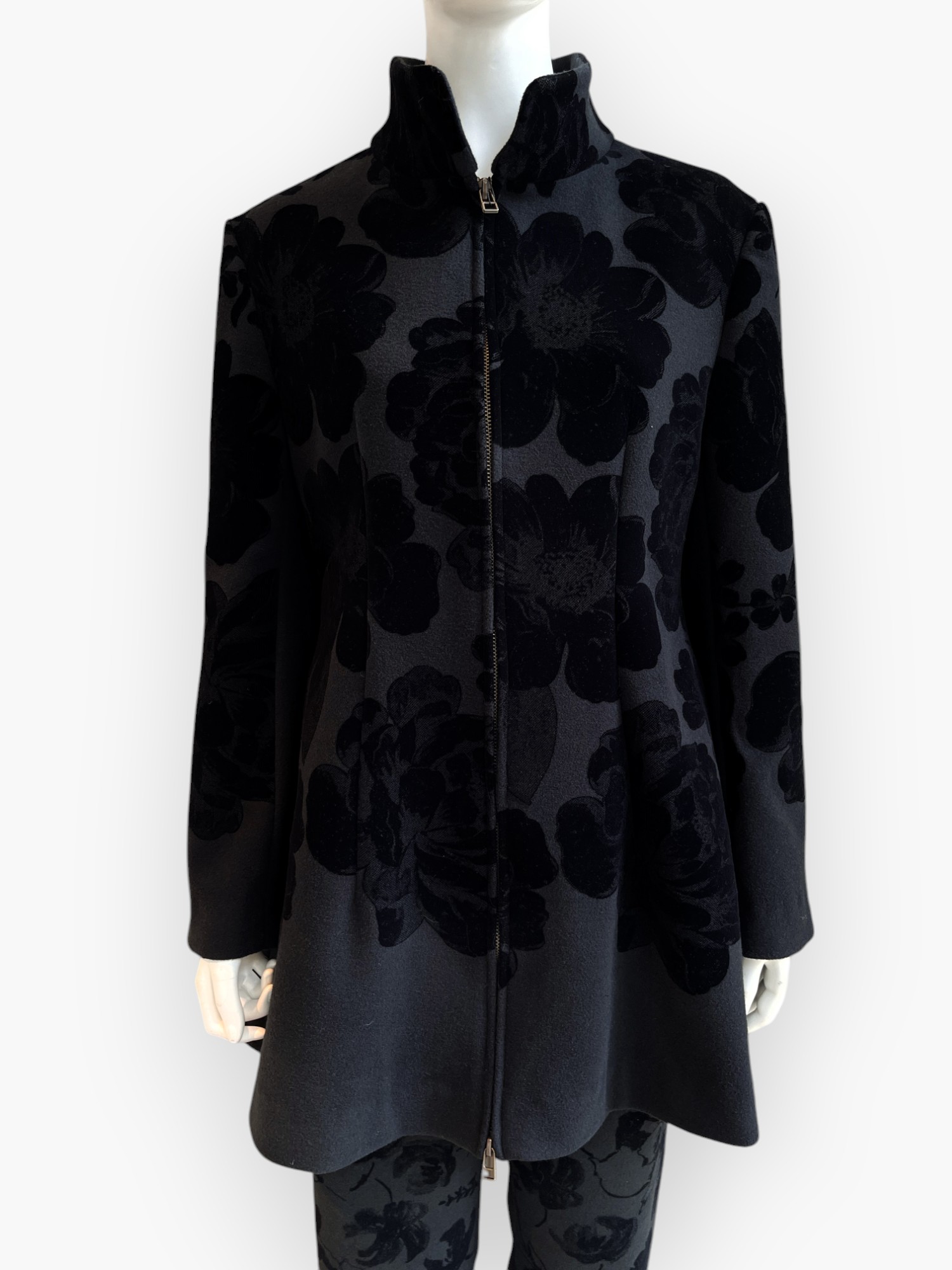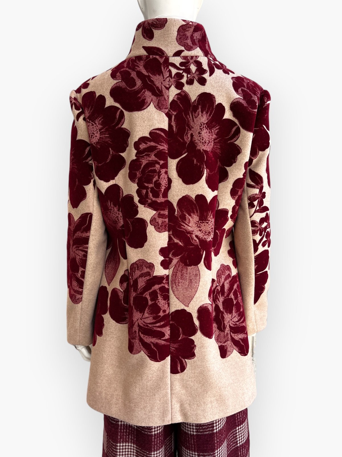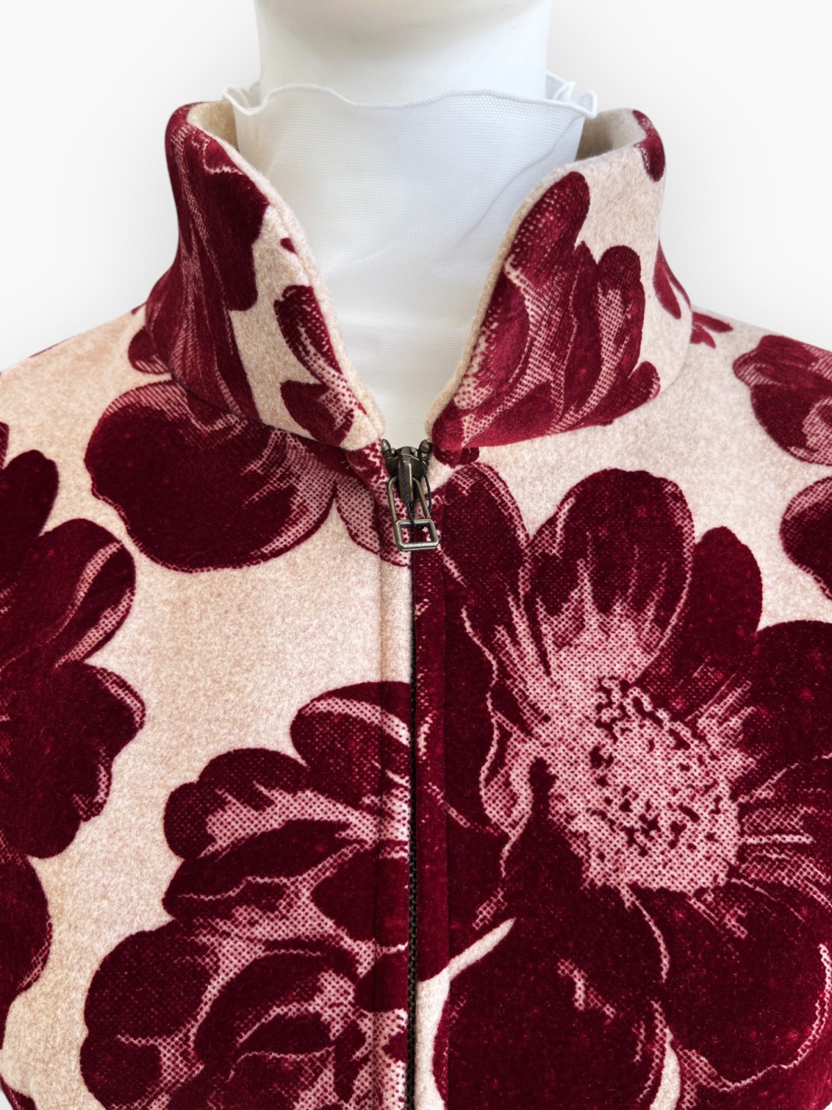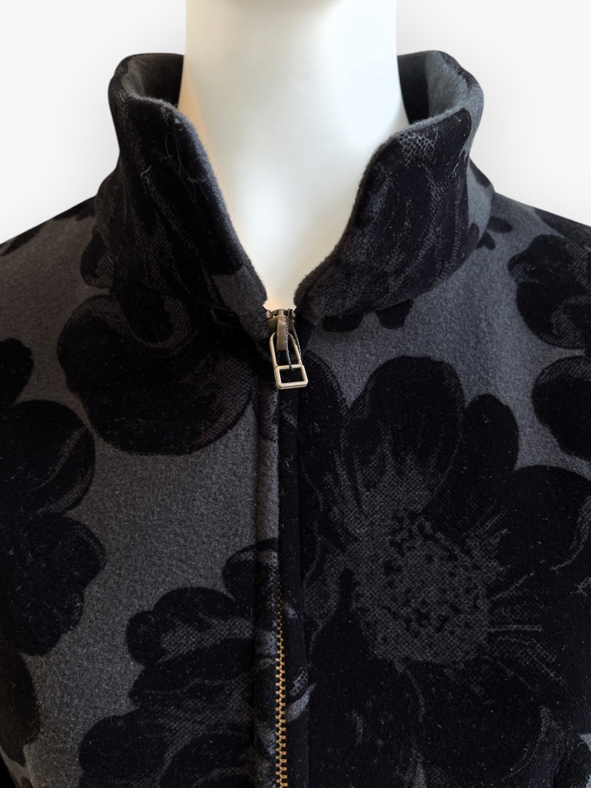 インパクトのある大柄フラワーと合わせやすい総柄フラワーをフロッキー加工したジャケット。<br表と裏を異なるポリエステル素材で編み上げた柔らかな風合いのウールライクな表情感が特徴です。