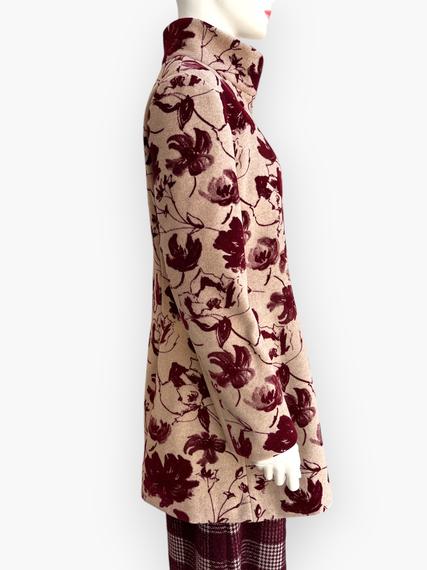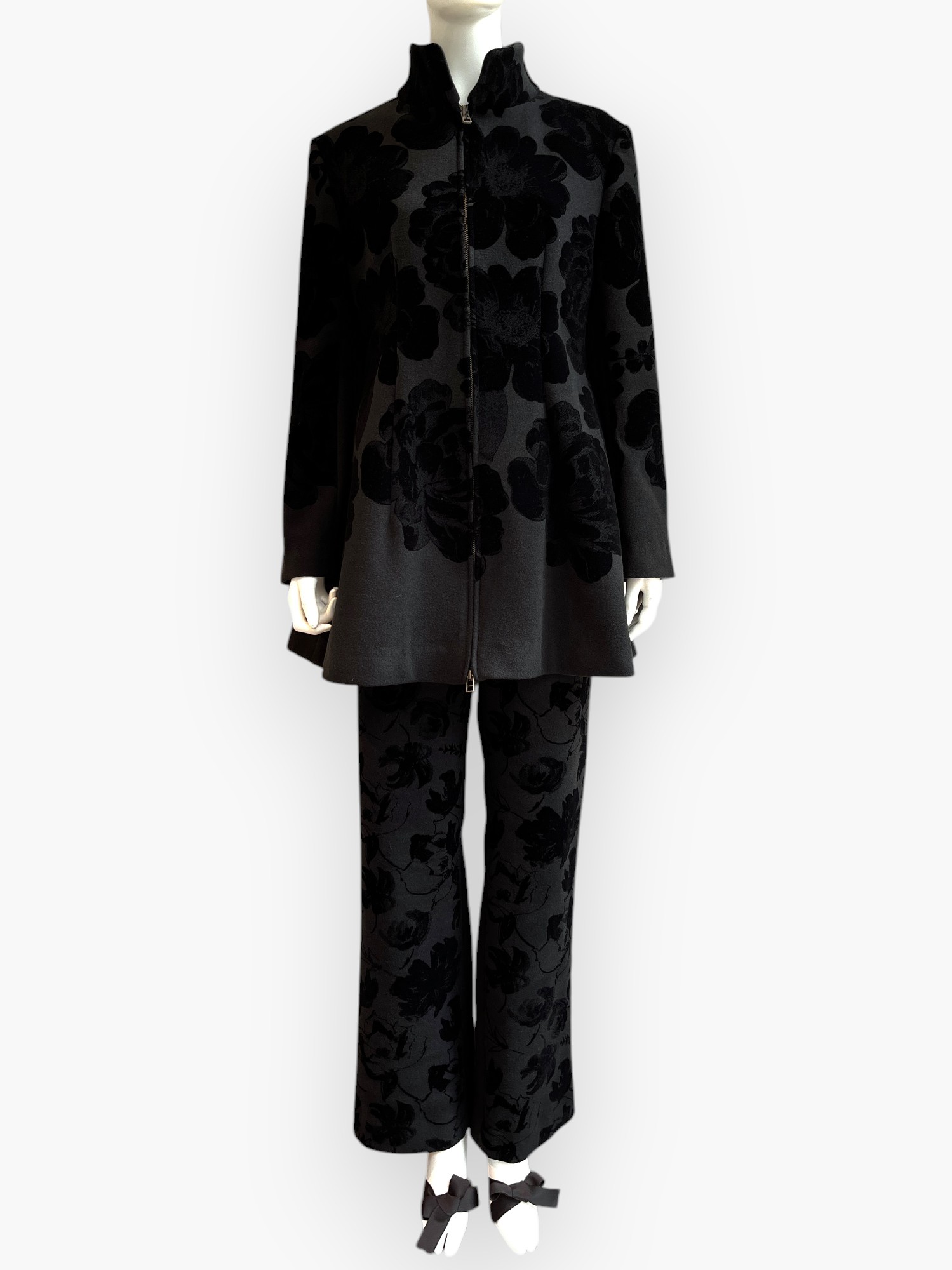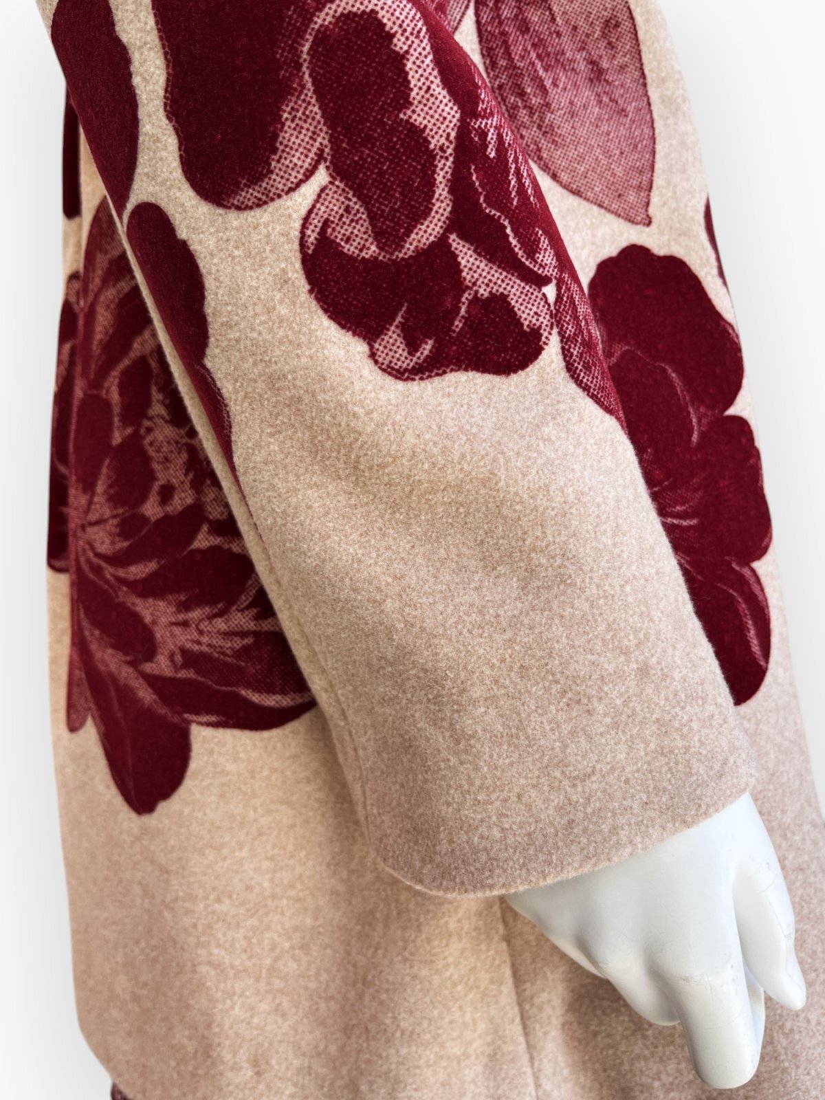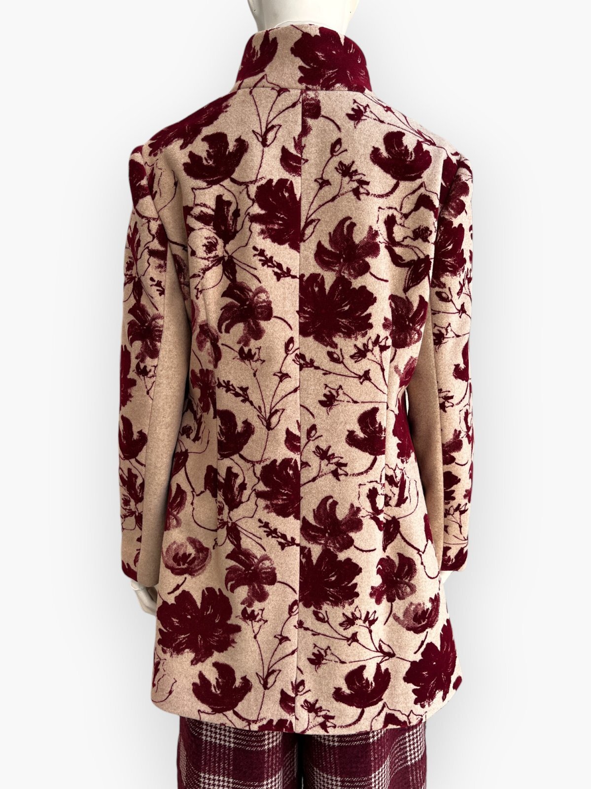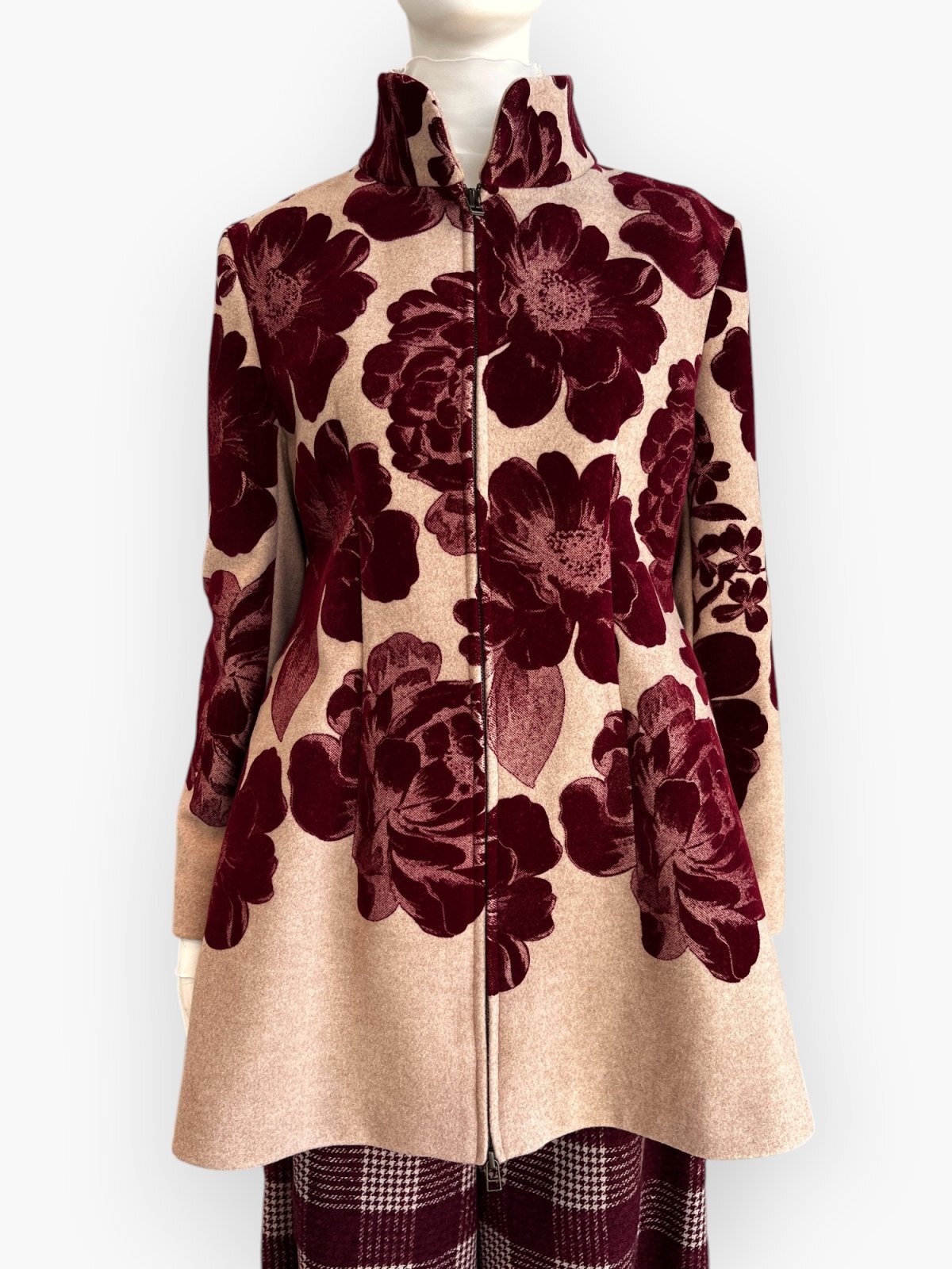 インパクトのある大柄フラワーと合わせやすい総柄フラワーをフロッキー加工したジャケット。<br表と裏を異なるポリエステル素材で編み上げた柔らかな風合いのウールライクな表情感が特徴です。