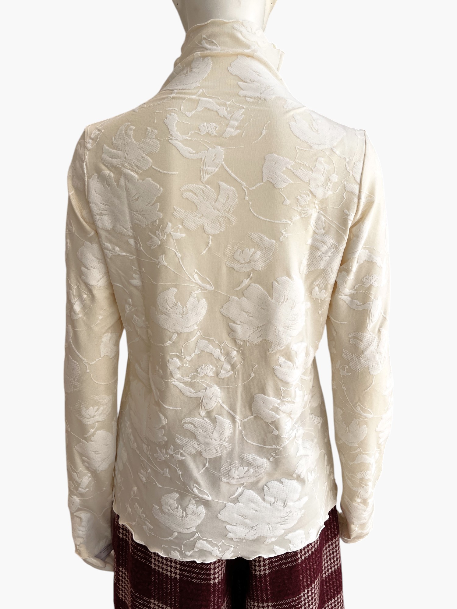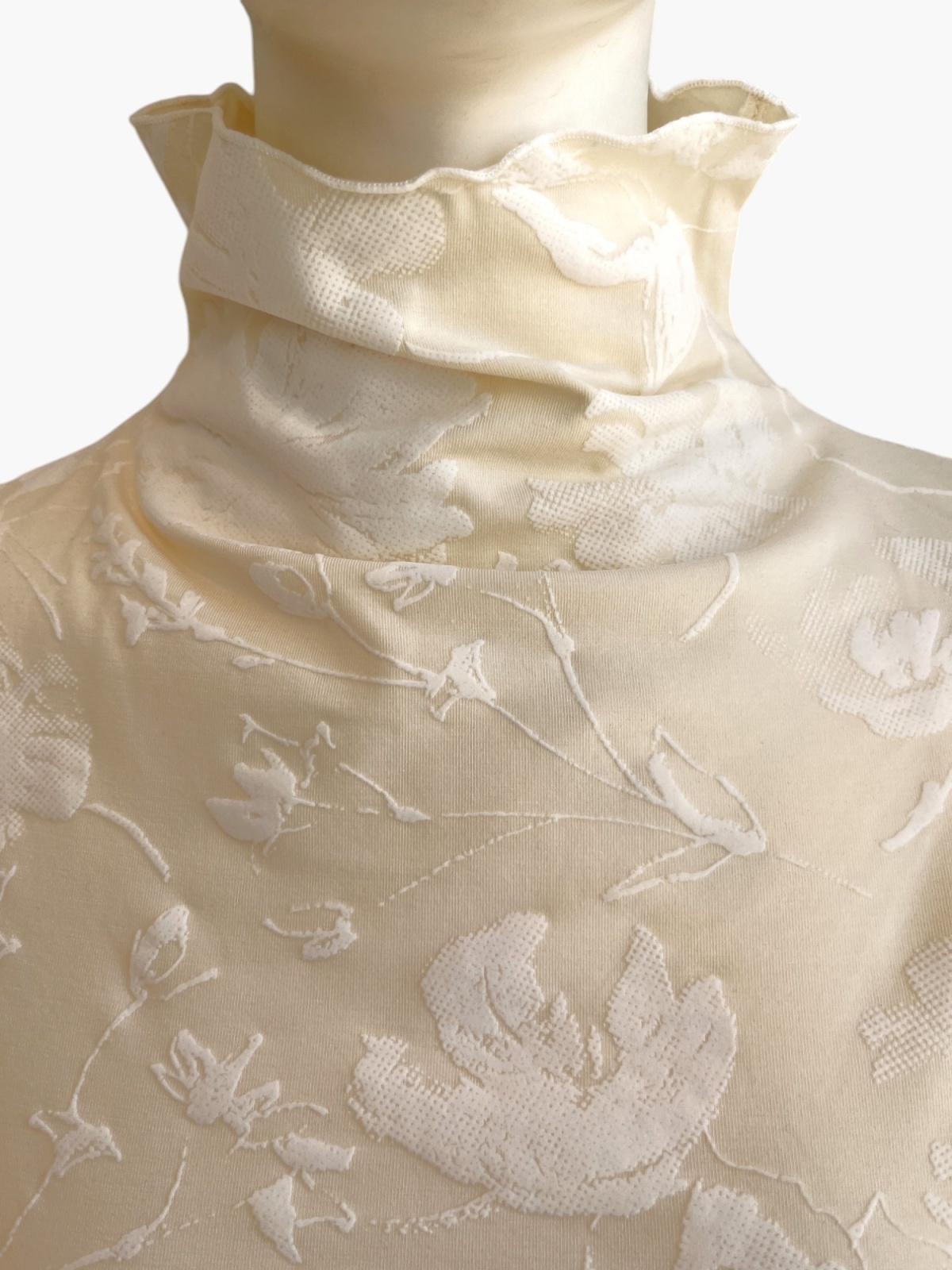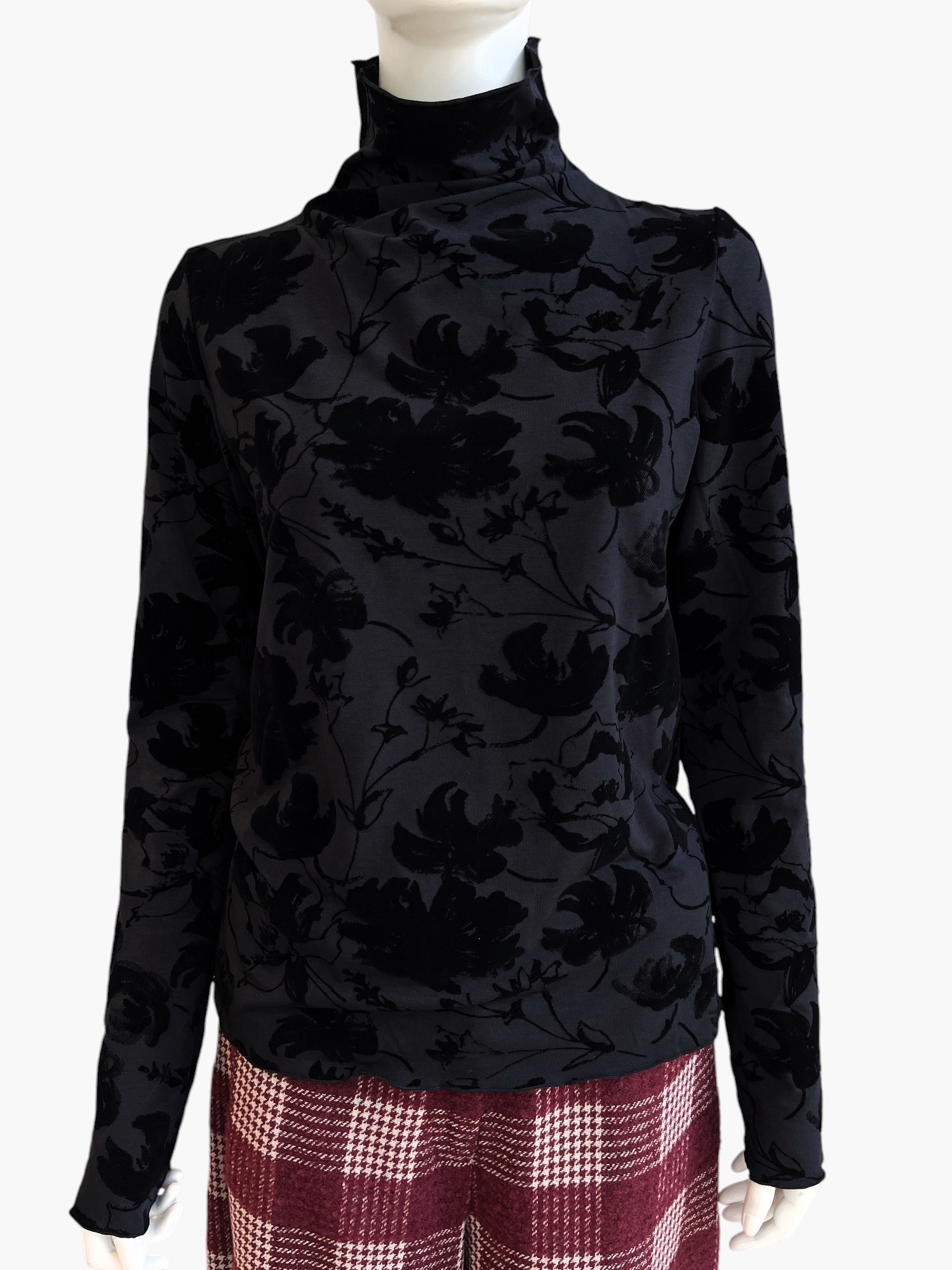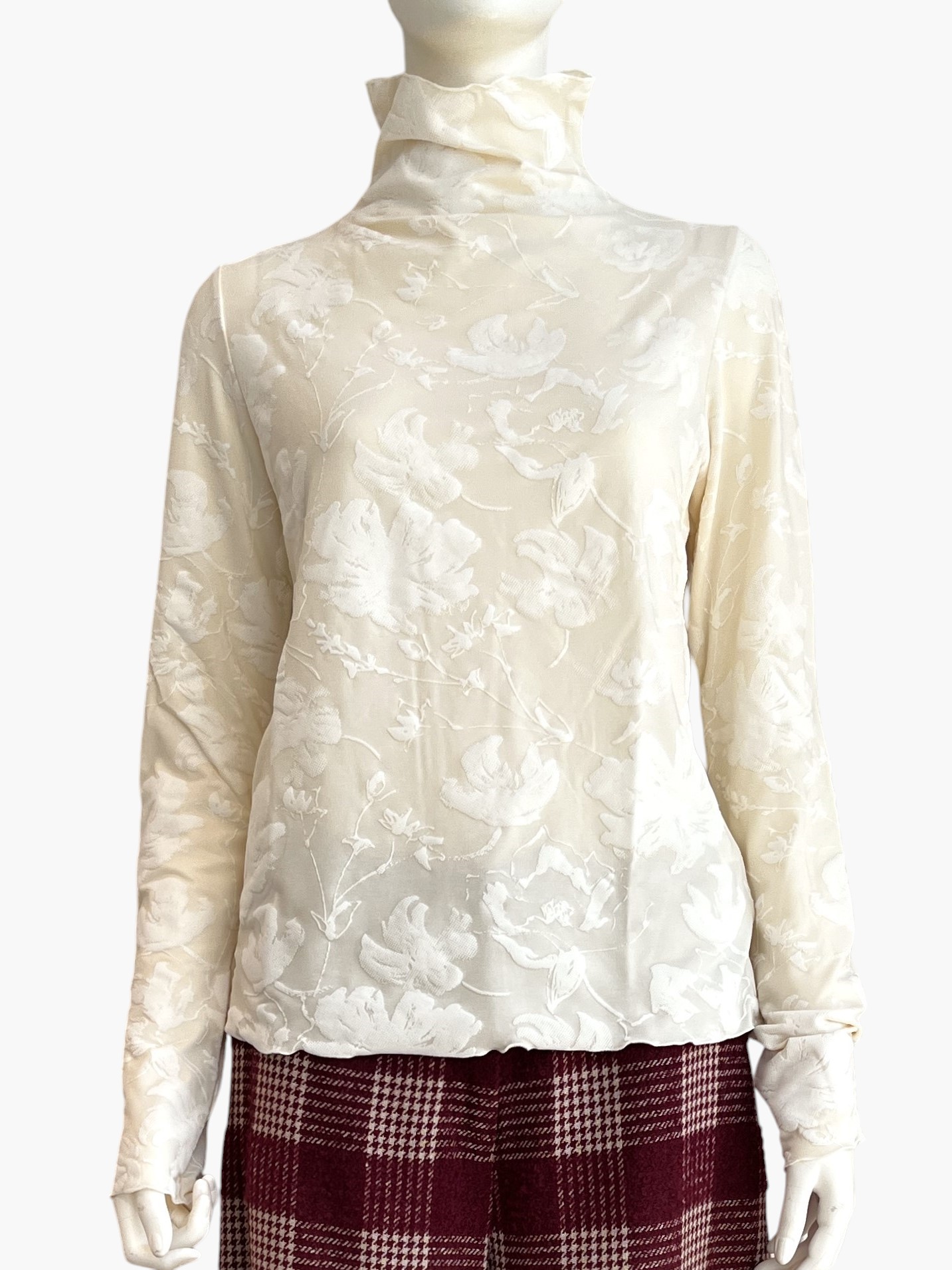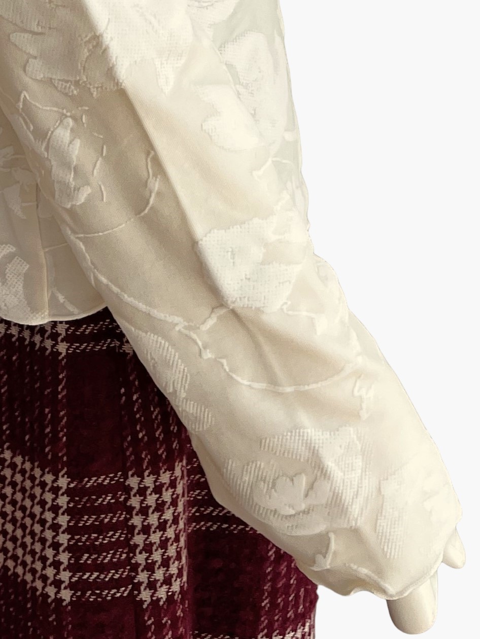 艶やかな表面感がある生地にフラワーモチーフ柄をフロッキー加工したブラウス。