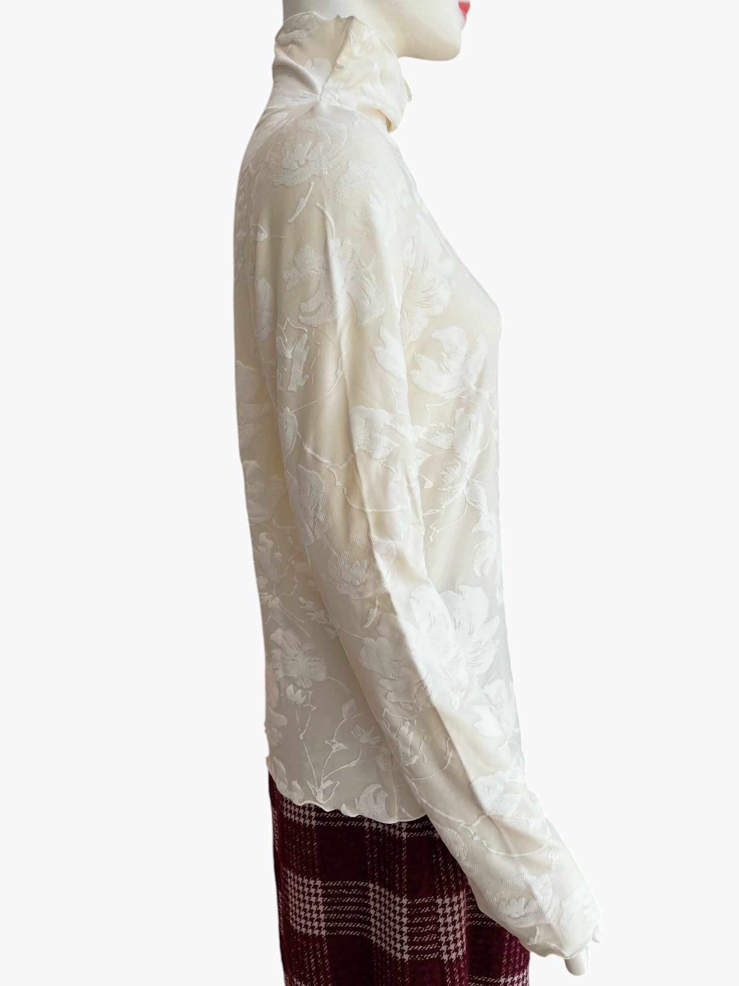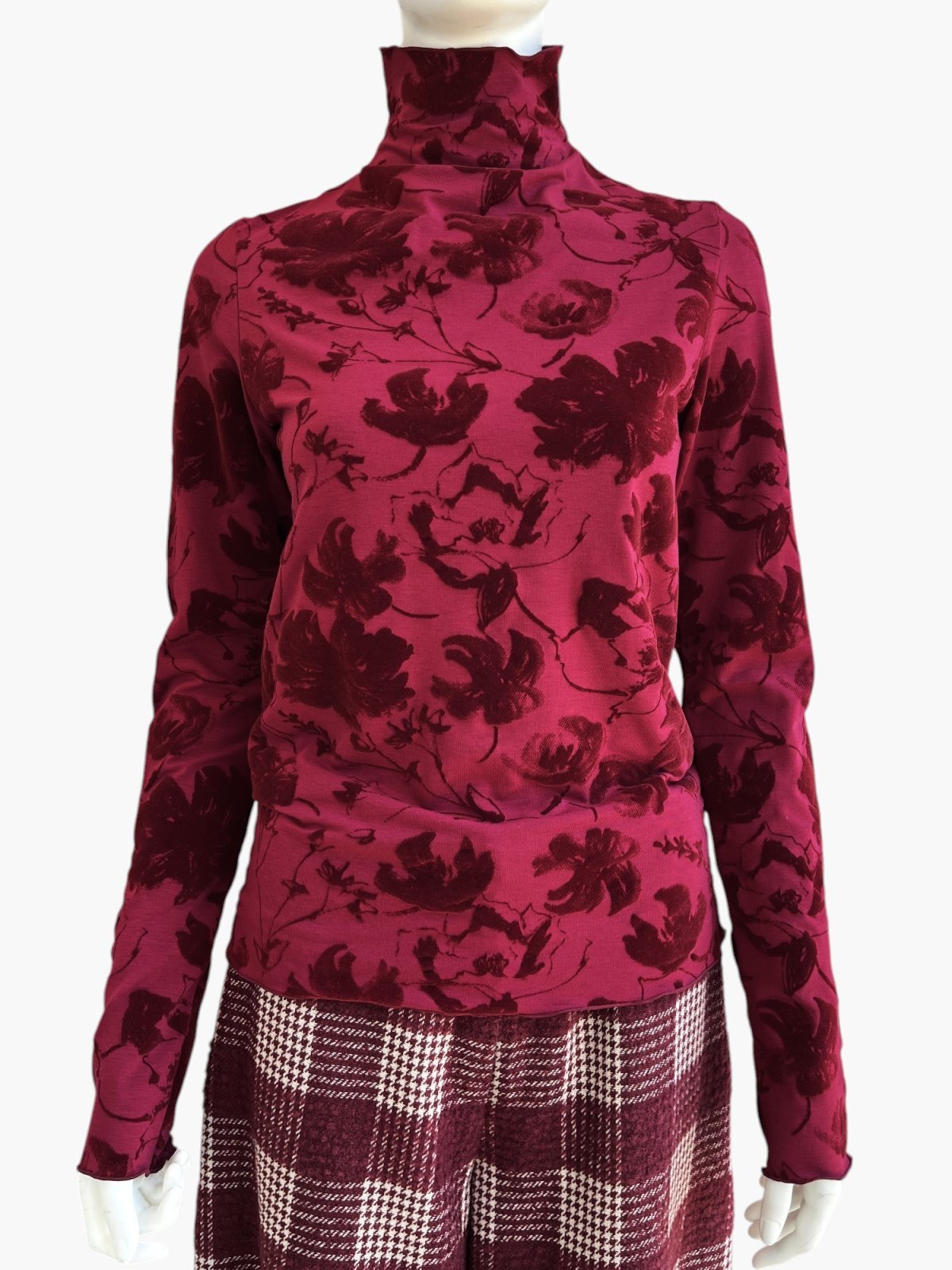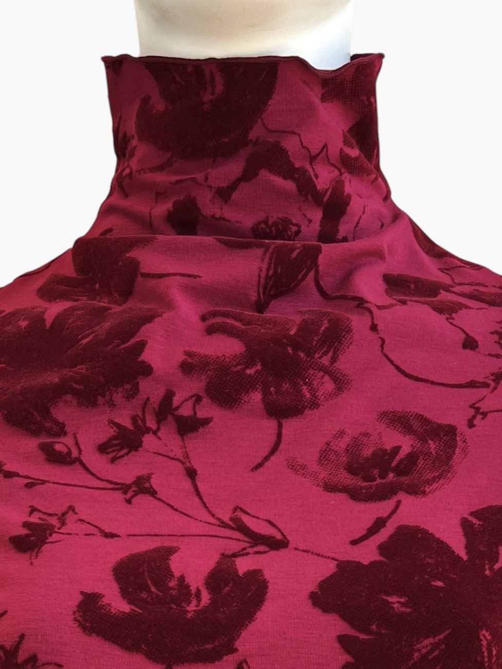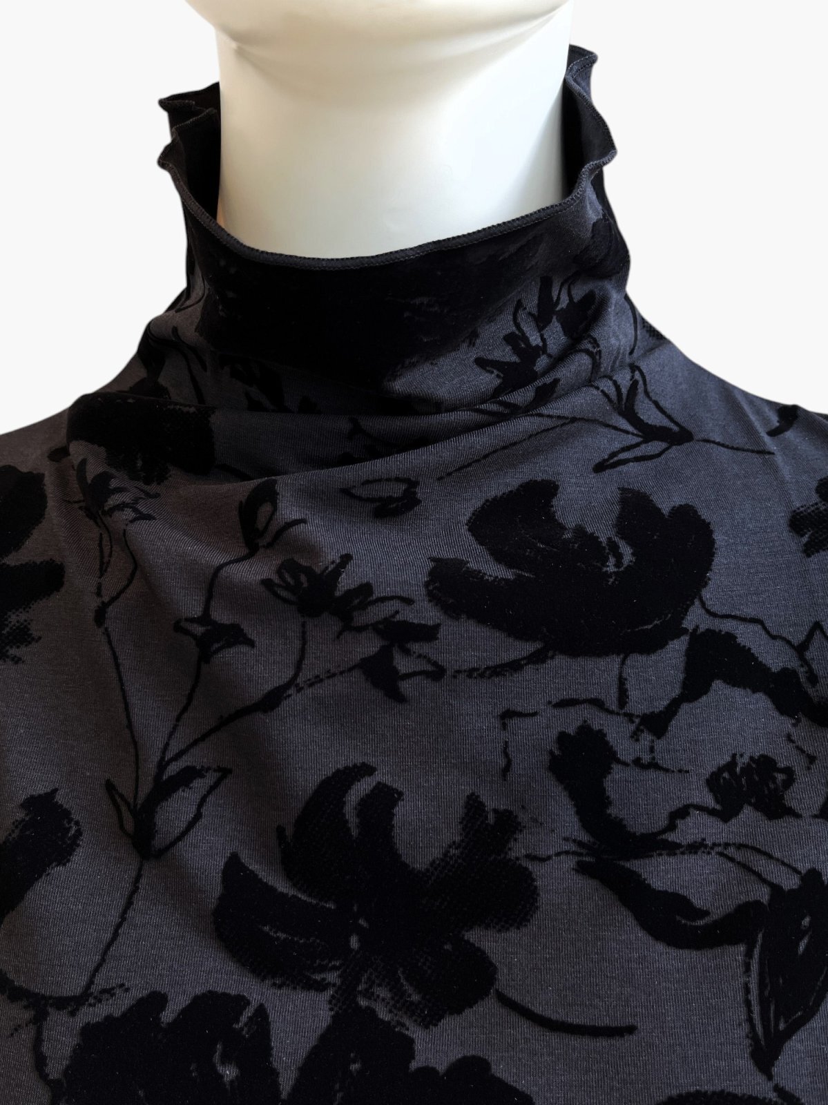 艶やかな表面感がある生地にフラワーモチーフ柄をフロッキー加工したブラウス。
