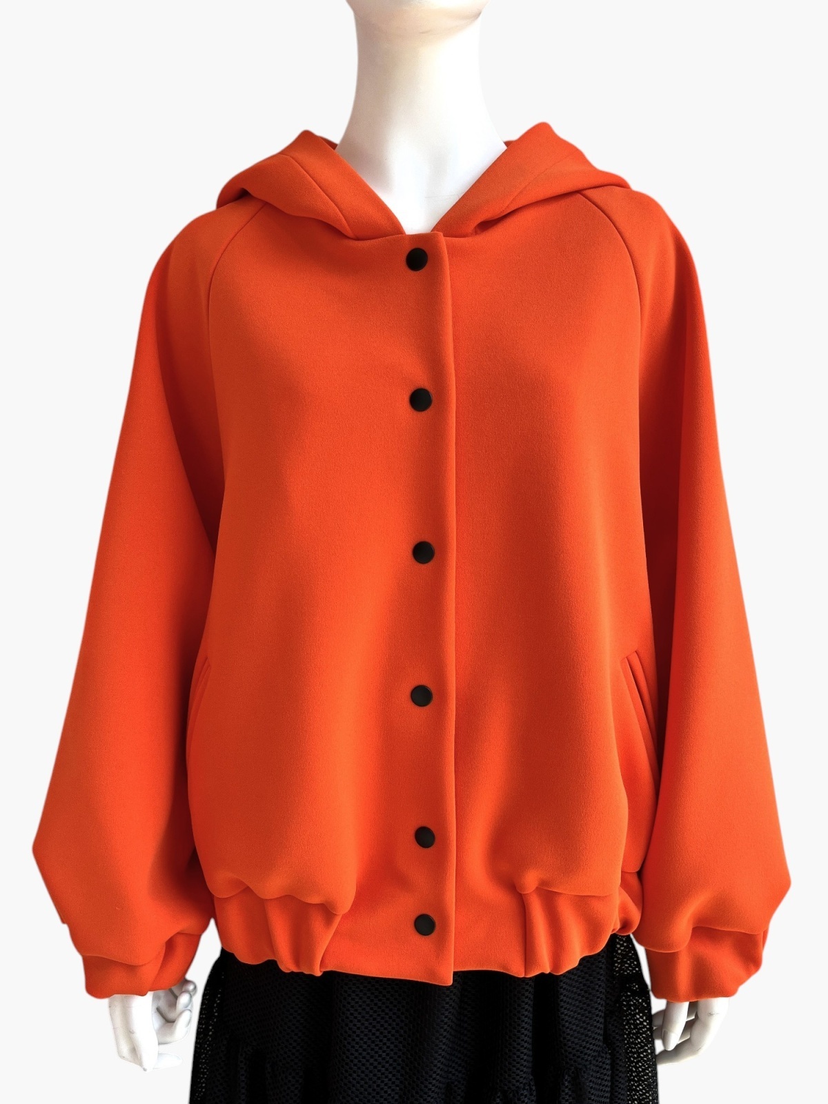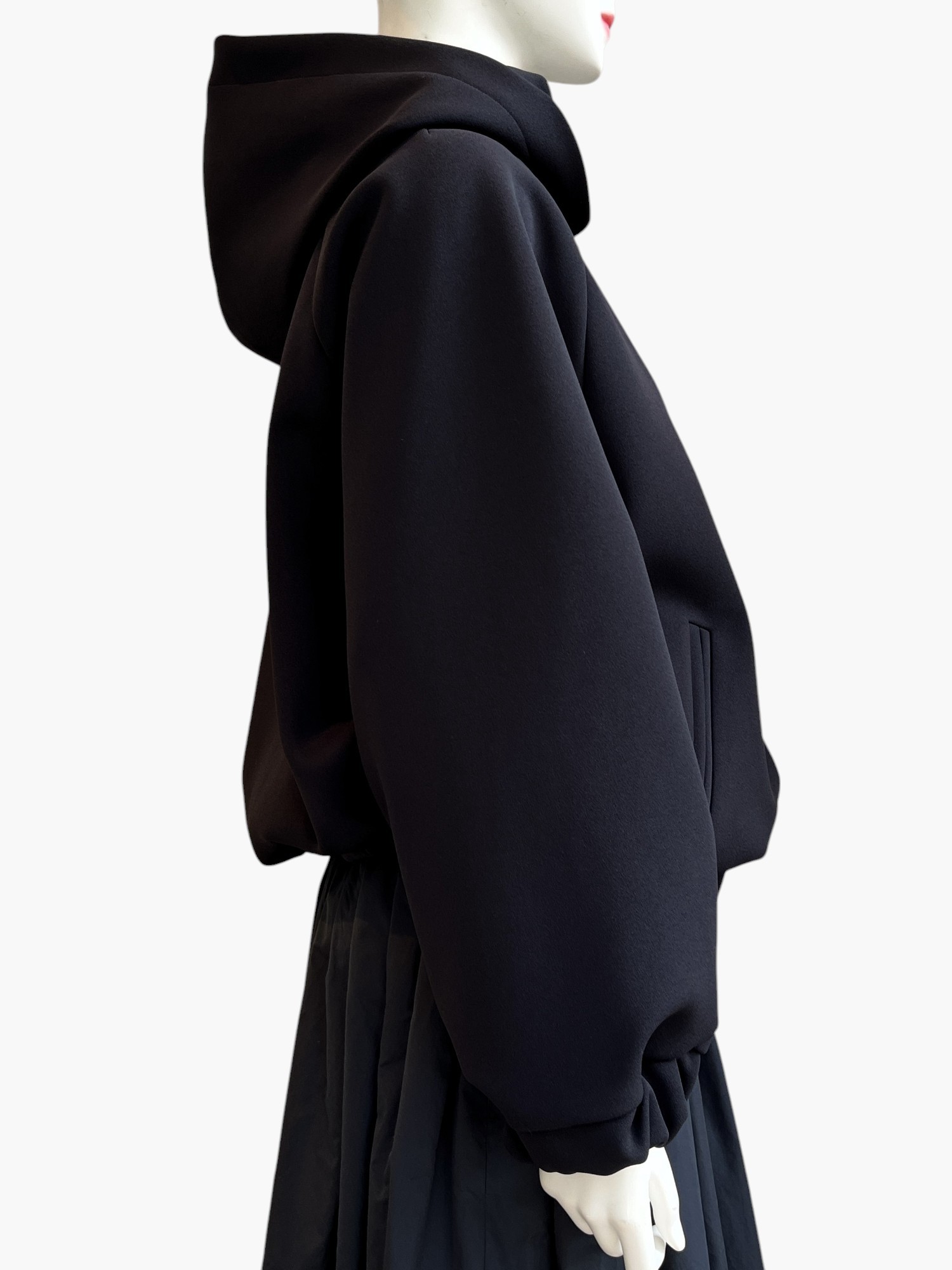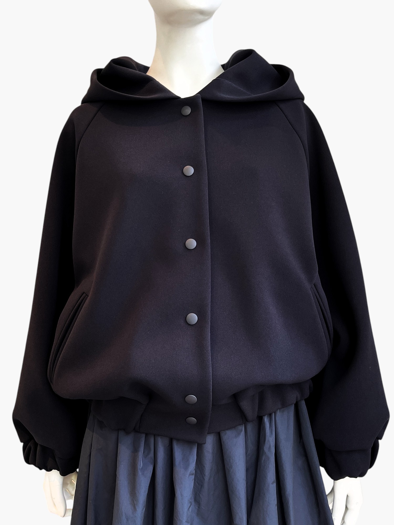 重厚感あるジャージー素材で仕立てたフード付きブルゾン。