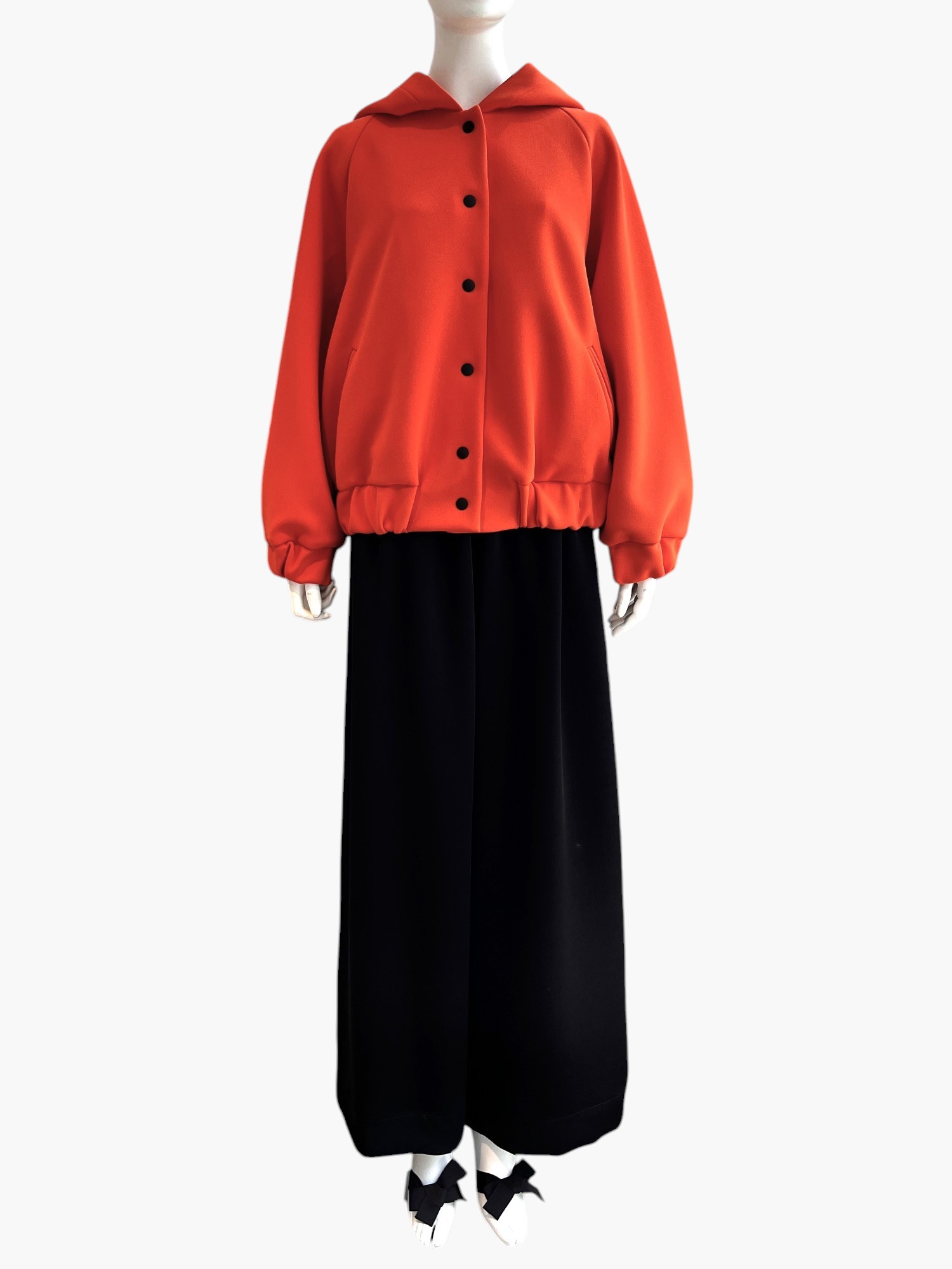 ややマットなブラックカラーのスナップボタンで品よく仕上げたきれい目なブルゾンはエレガントなボトムとの相性も◎