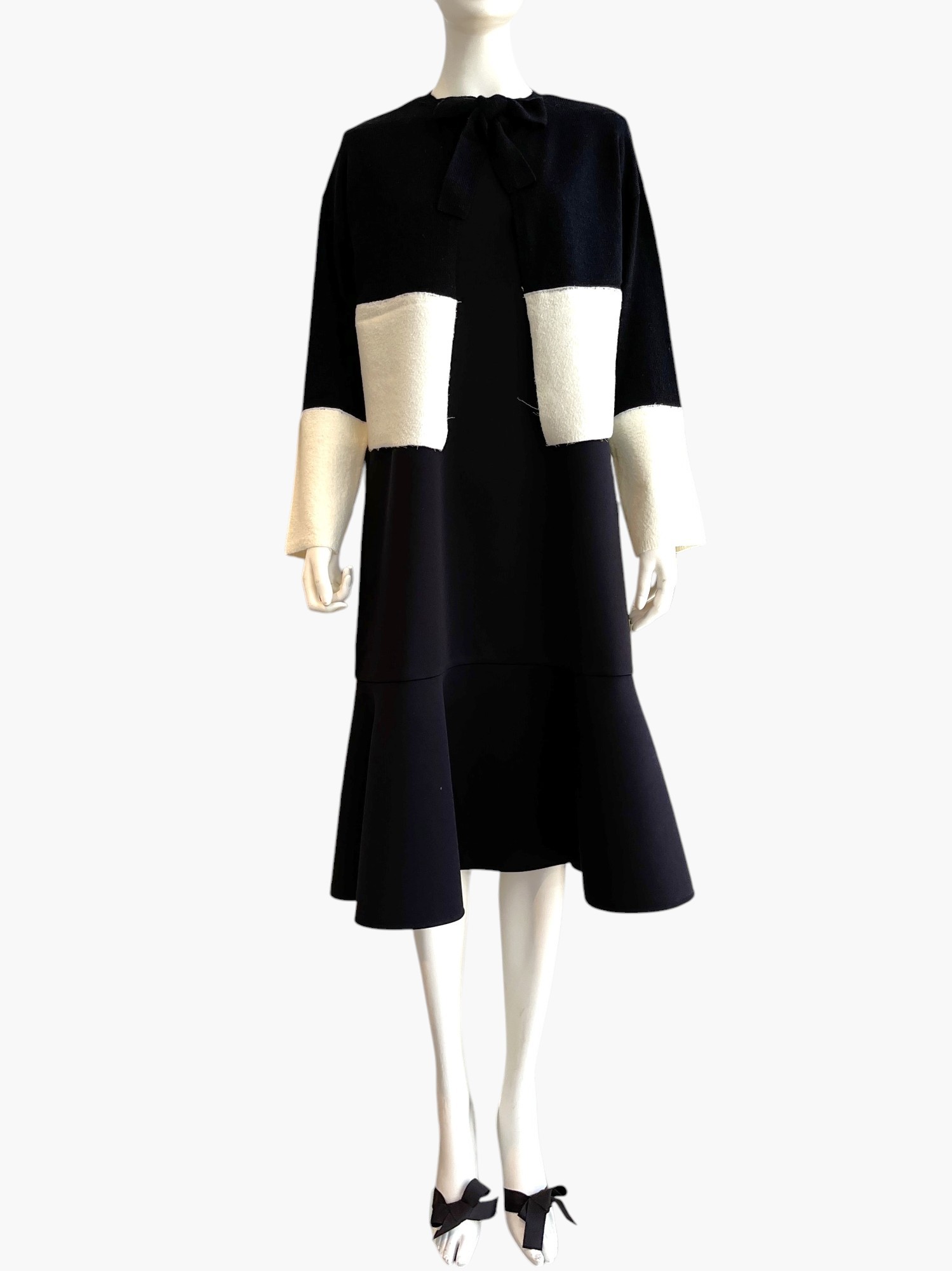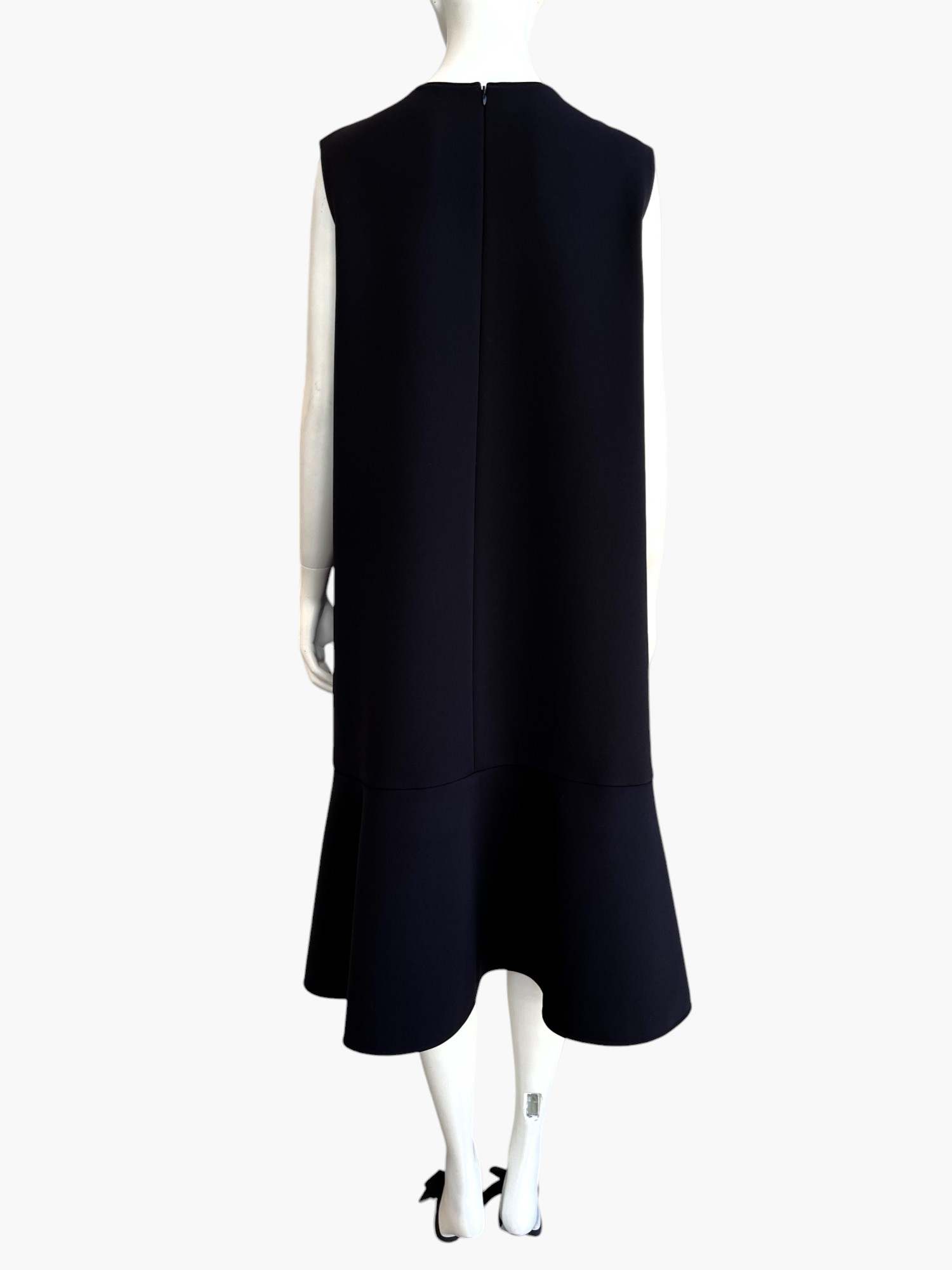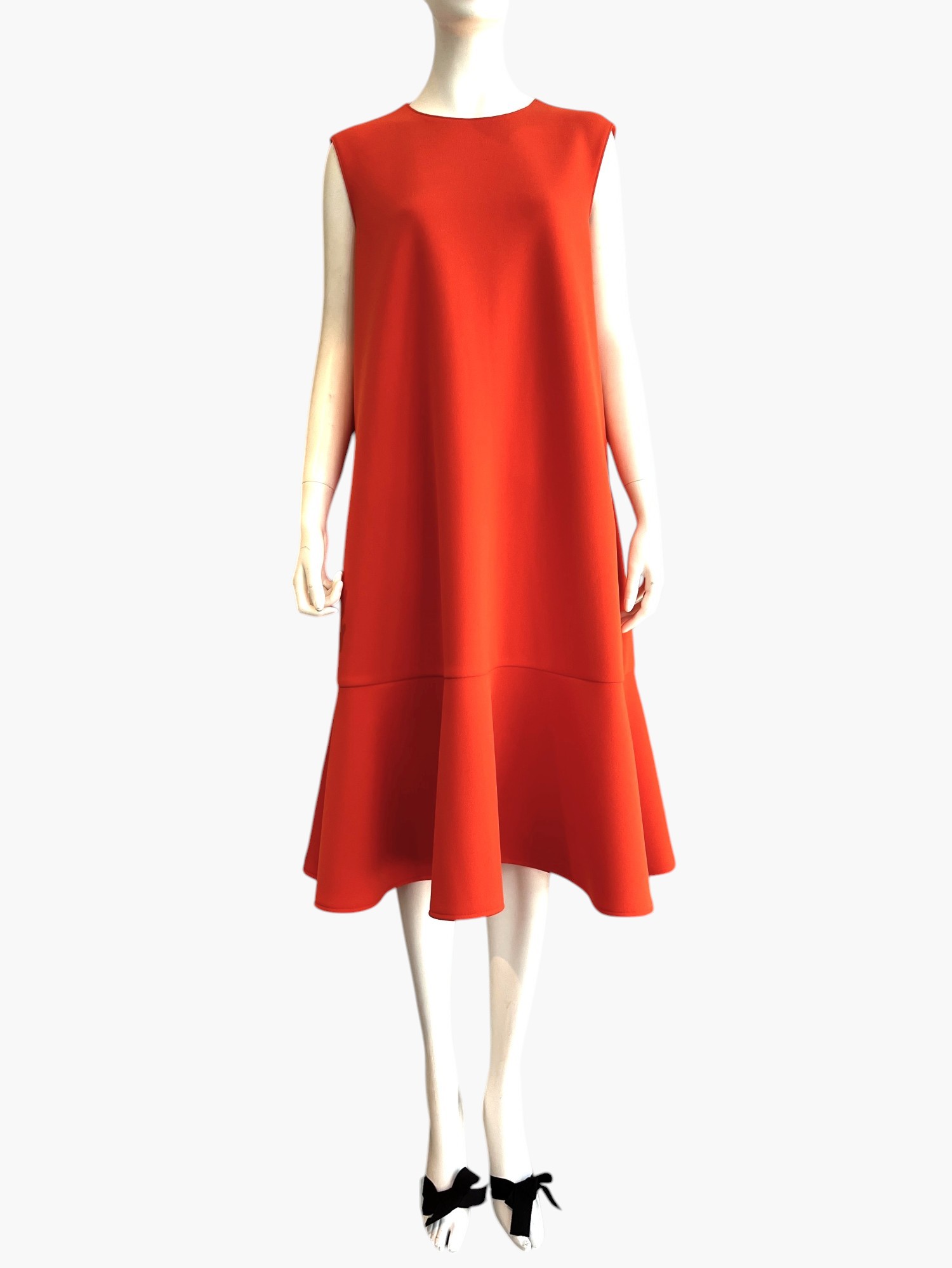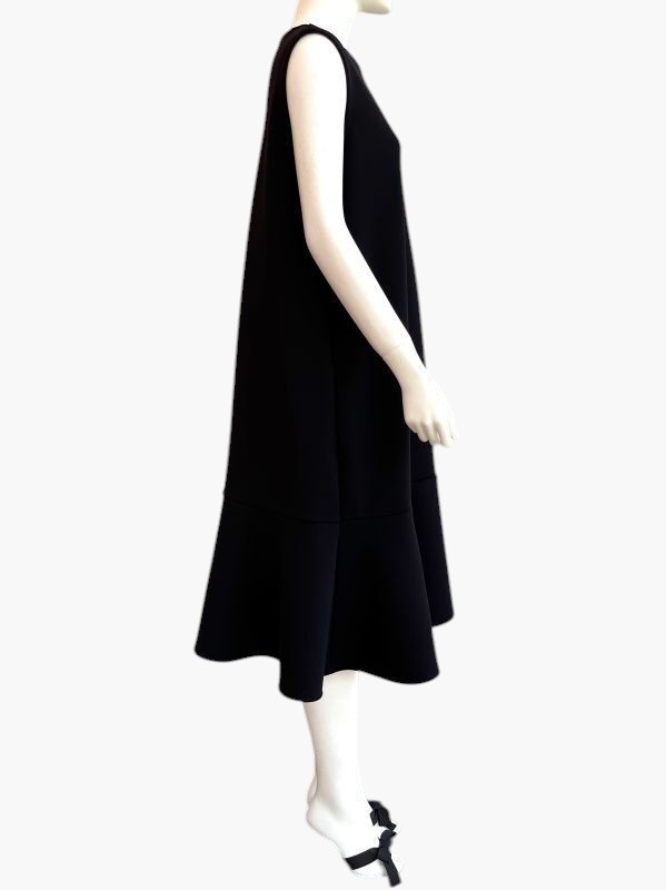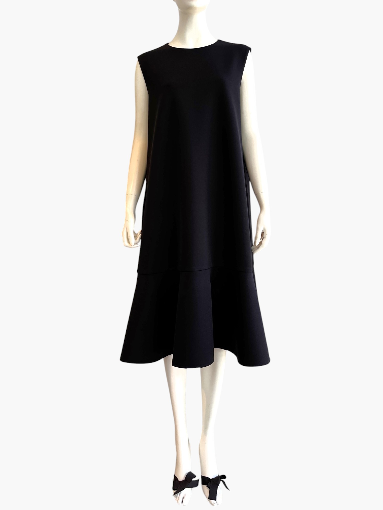 身体のラインを拾いにくいAラインシルエットとペプラム裾でシンプルと女らしさを両立したデザインは大人の女性におすすめの一着。