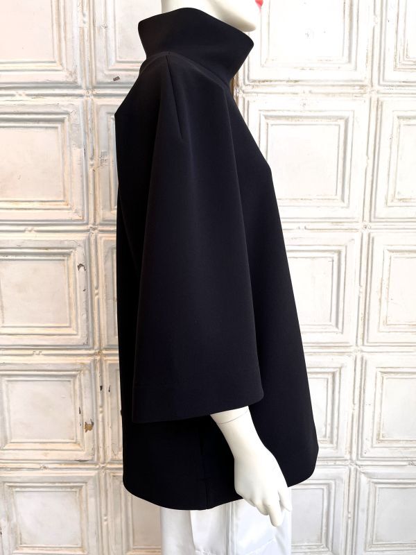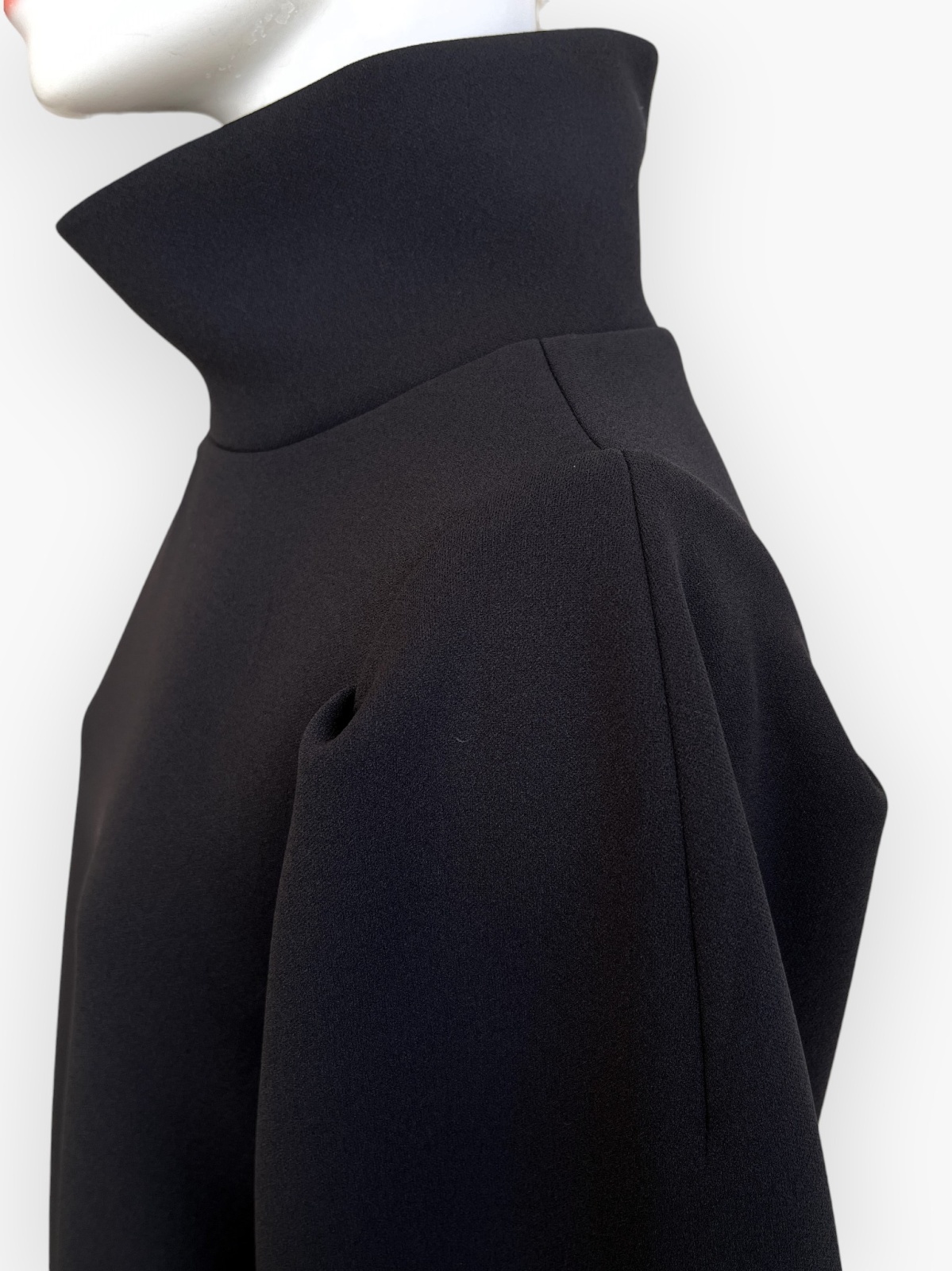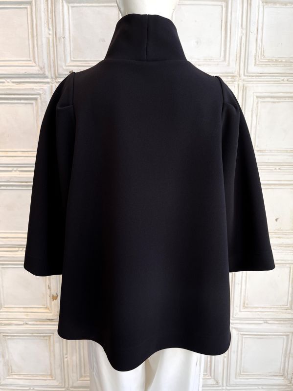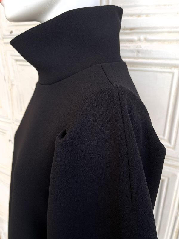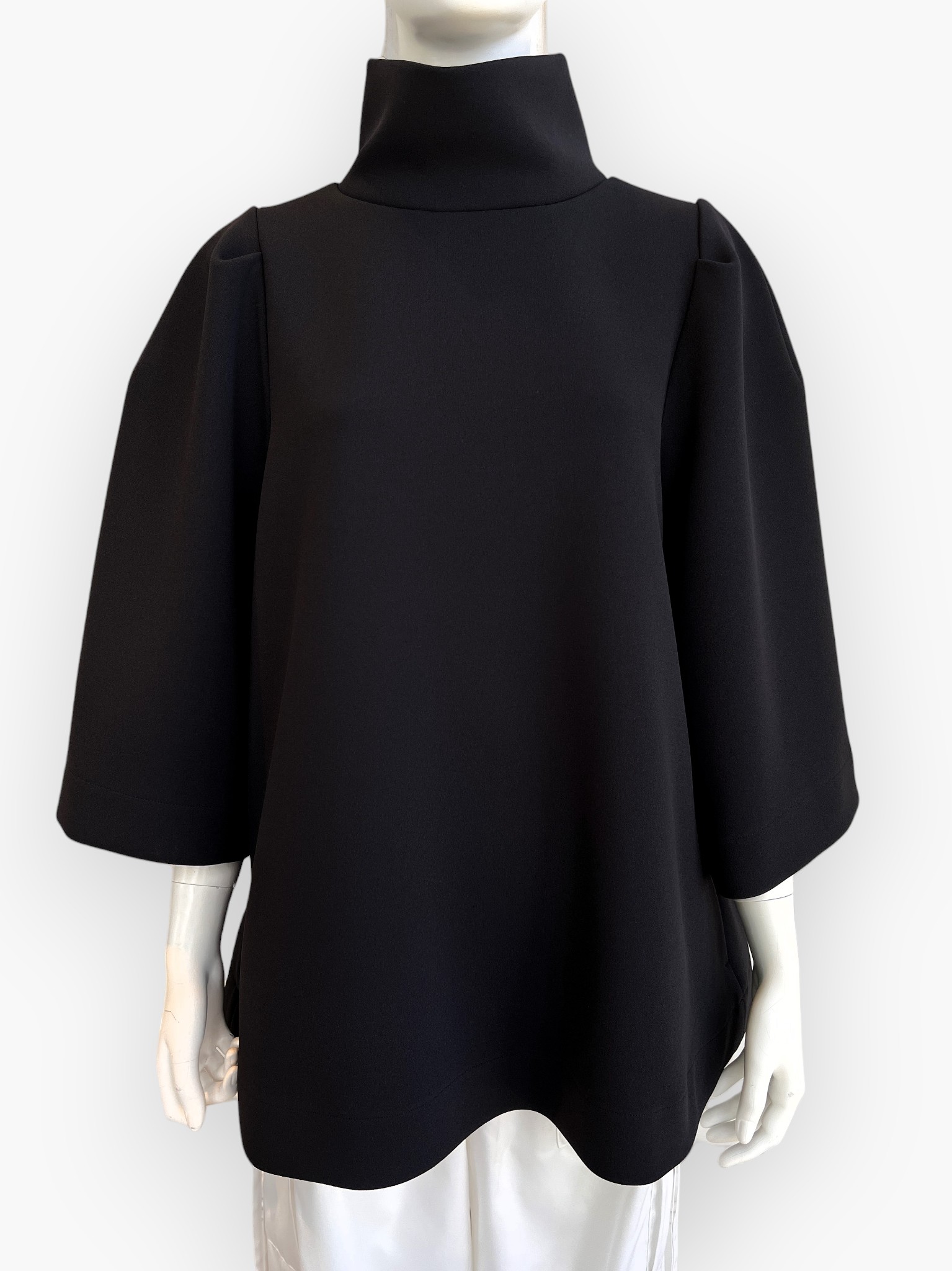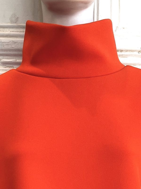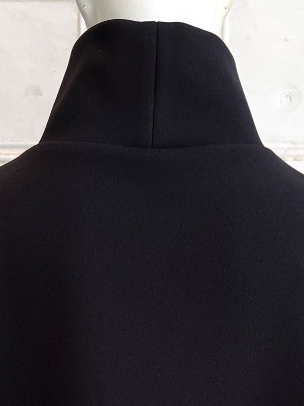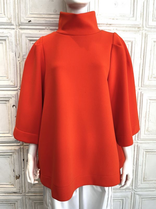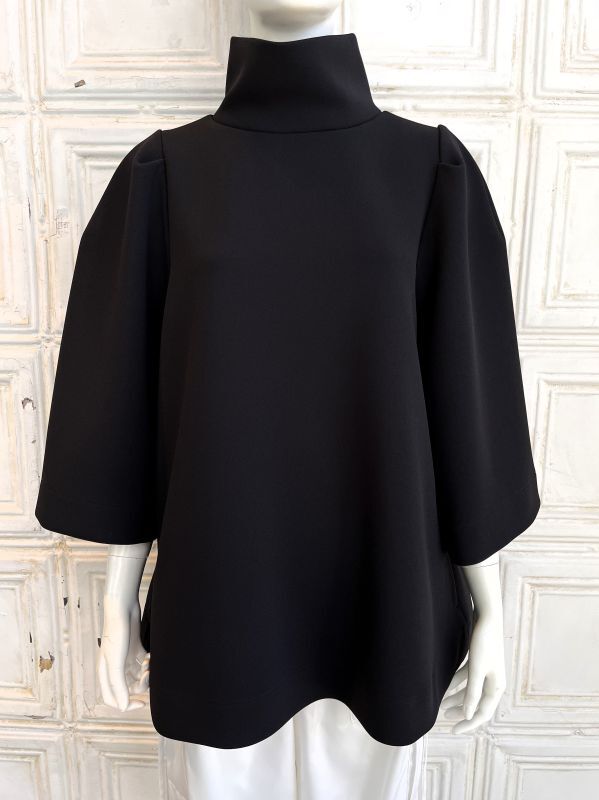 高めのスタンドネックとタックが入ったスリーブが印象的な一枚。