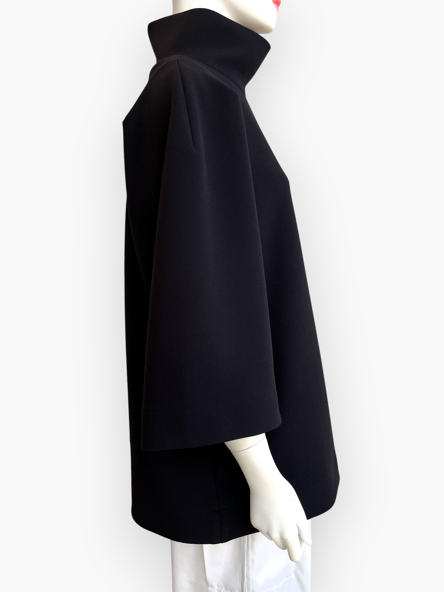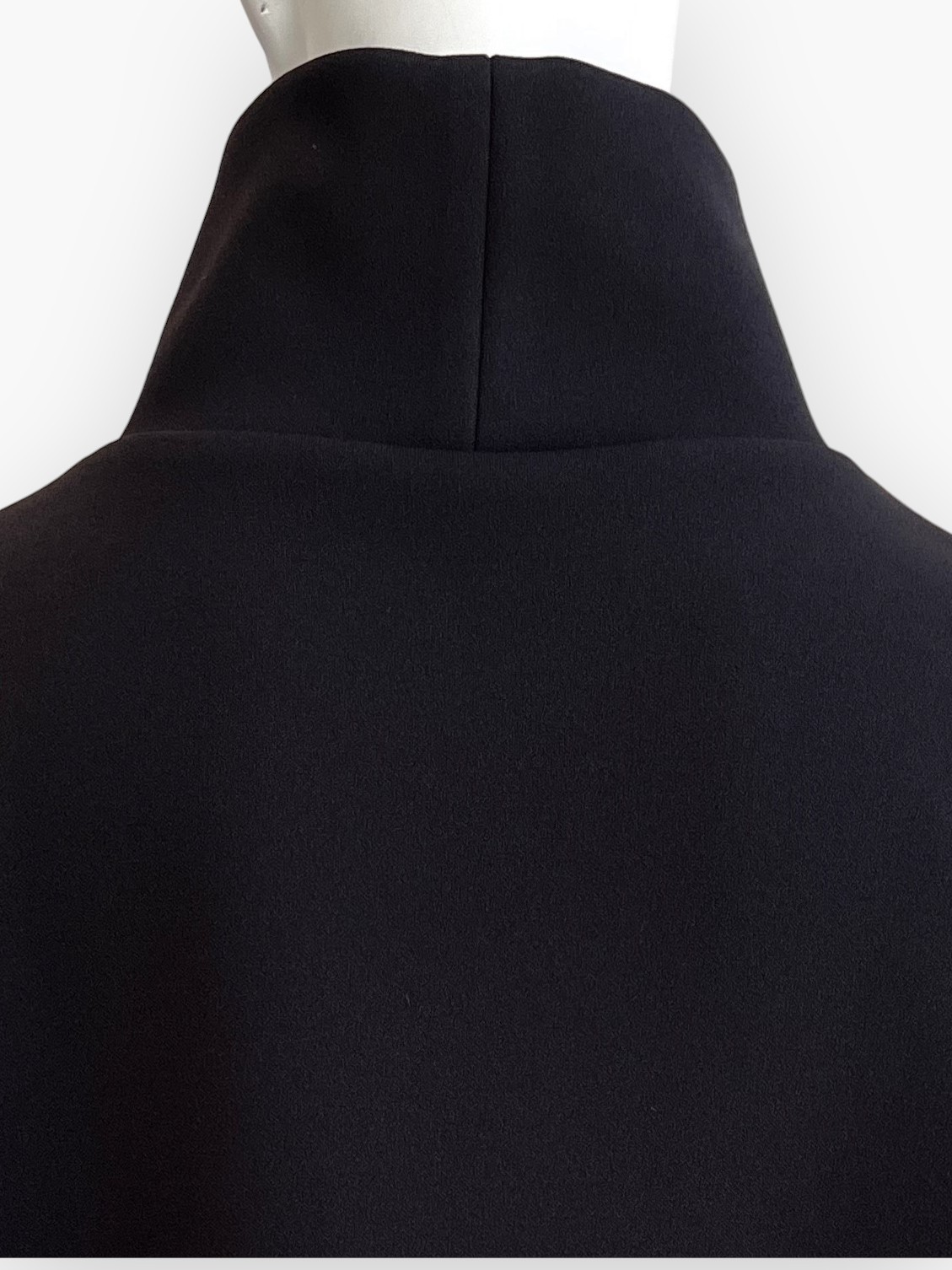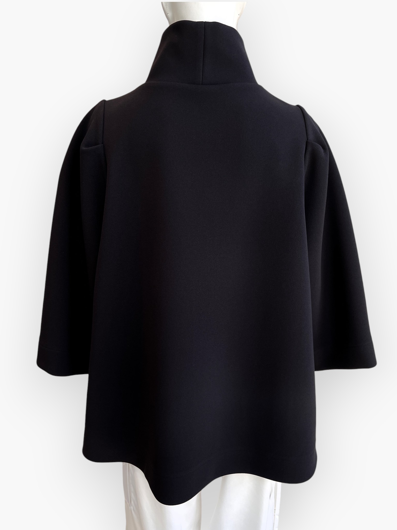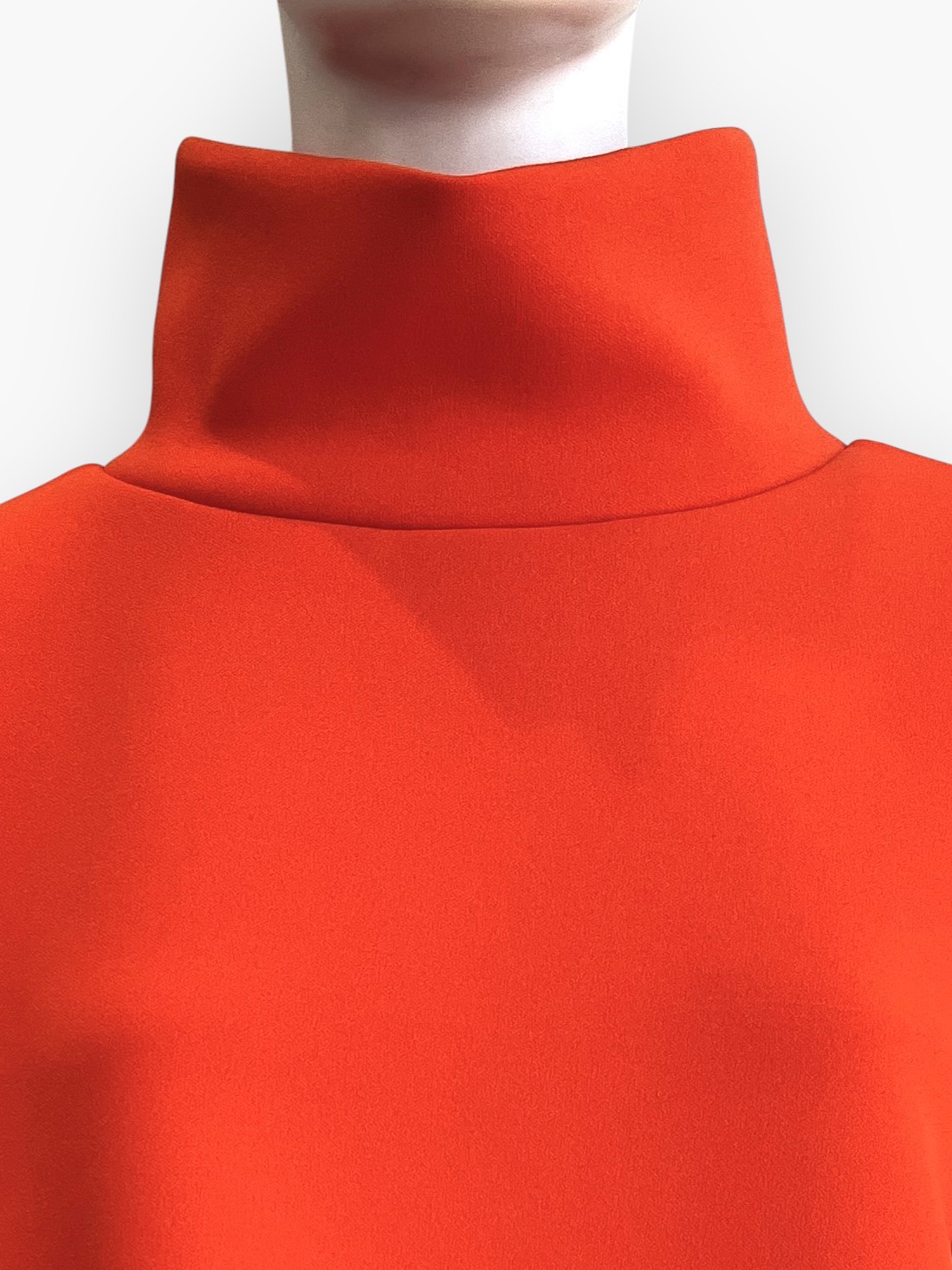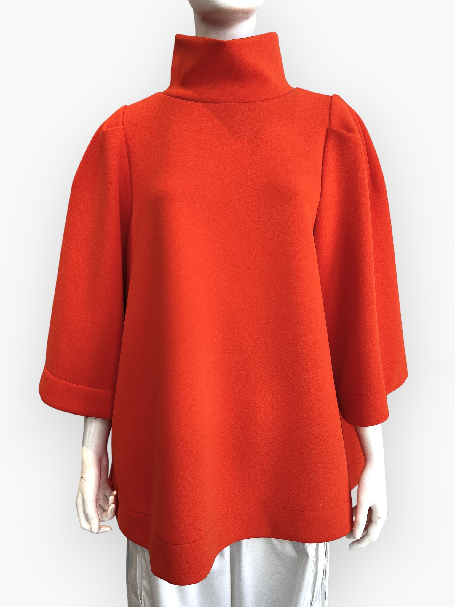 高めのスタンドネックとタックが入ったスリーブが印象的な一枚。