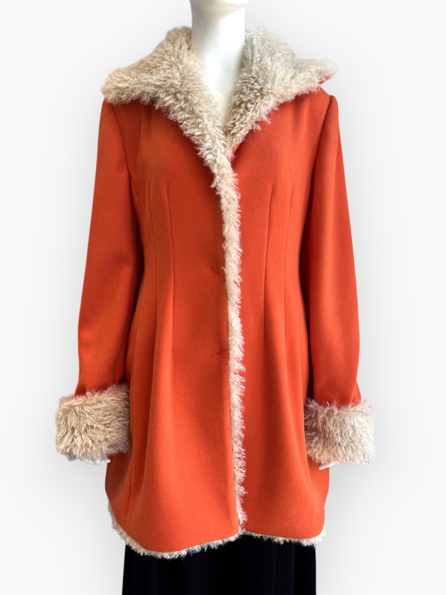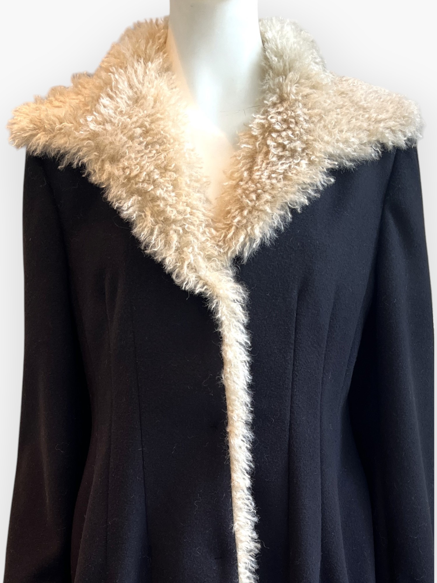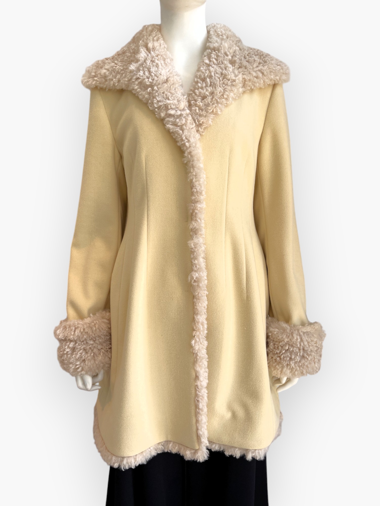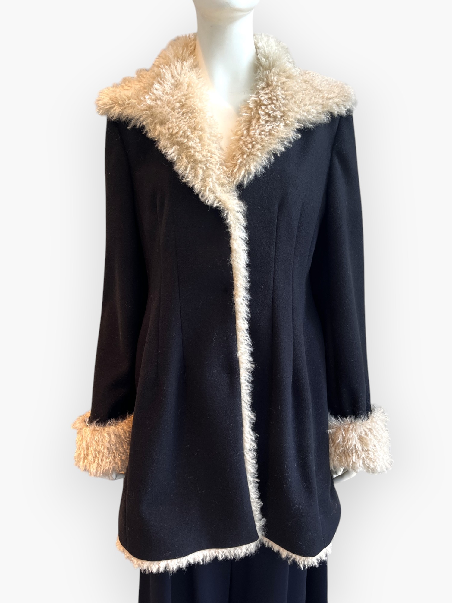 衿、前立て部分、袖口、裾にバランスよく施したフェイクファーがポイントのジャケット。