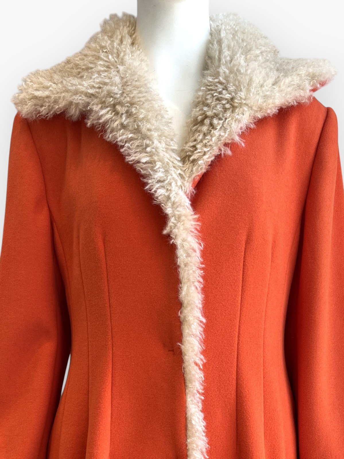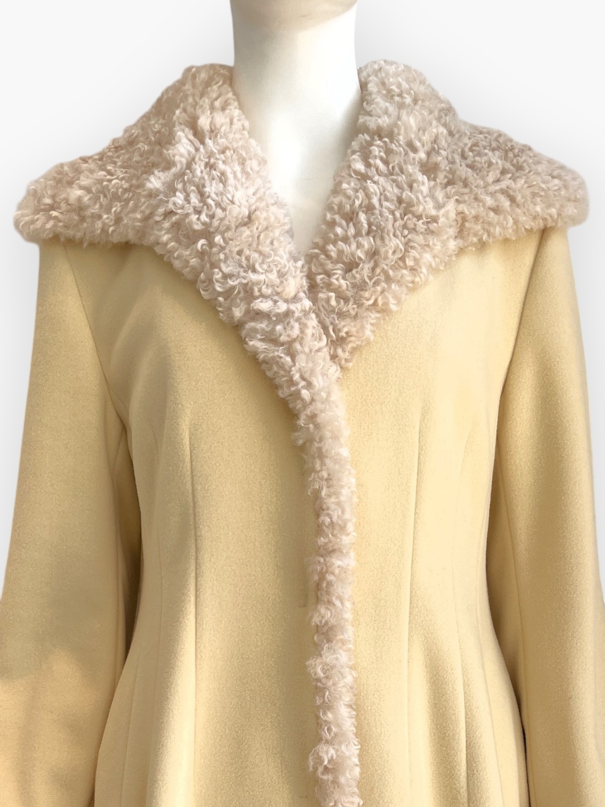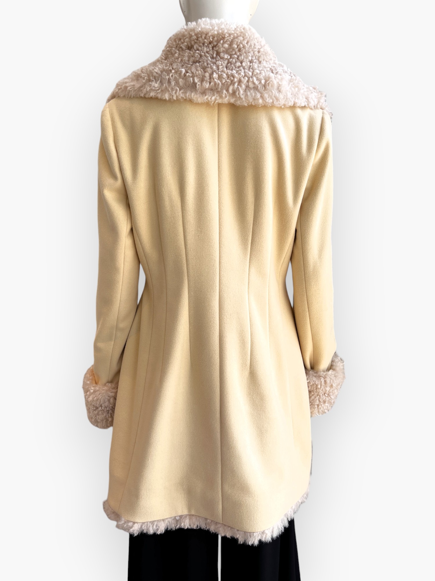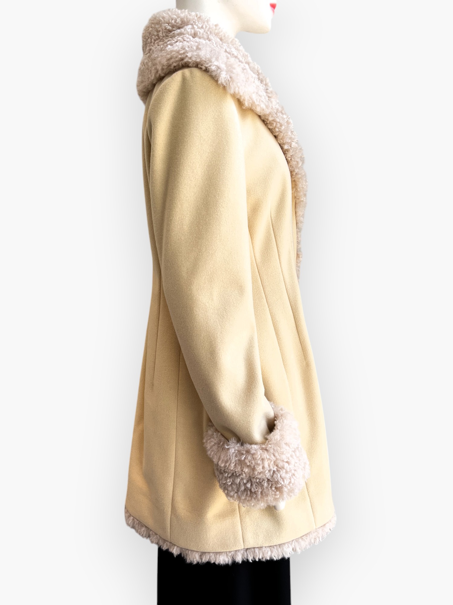 衿、前立て部分、袖口、裾にバランスよく施したフェイクファーがポイントのジャケット。