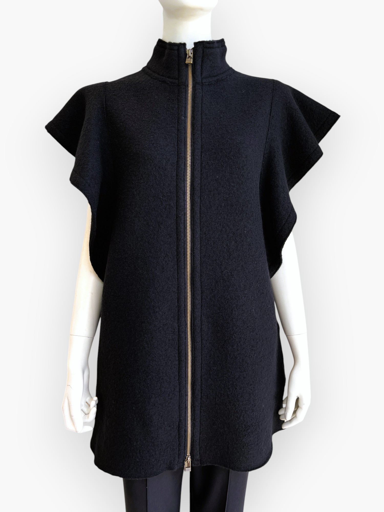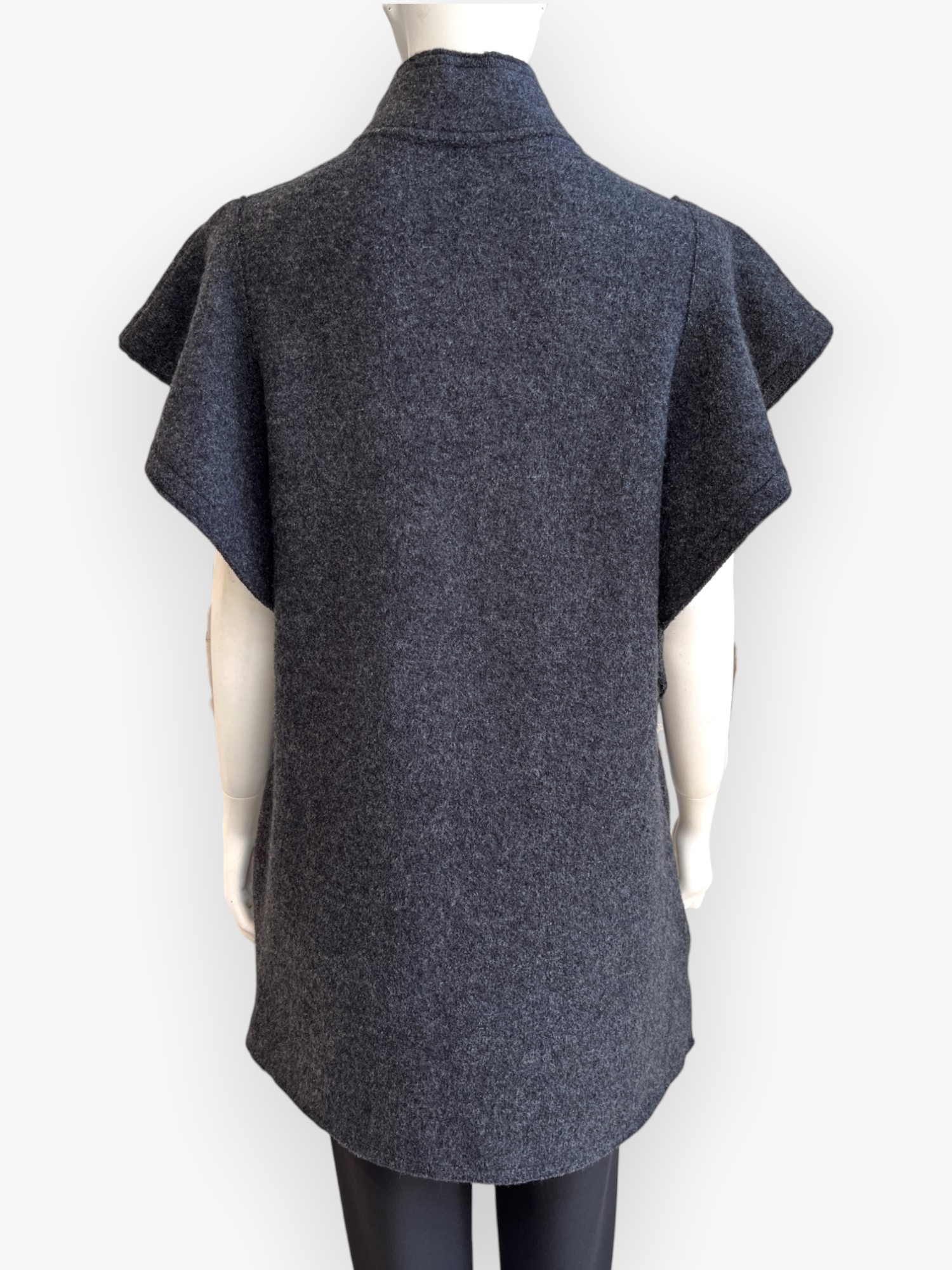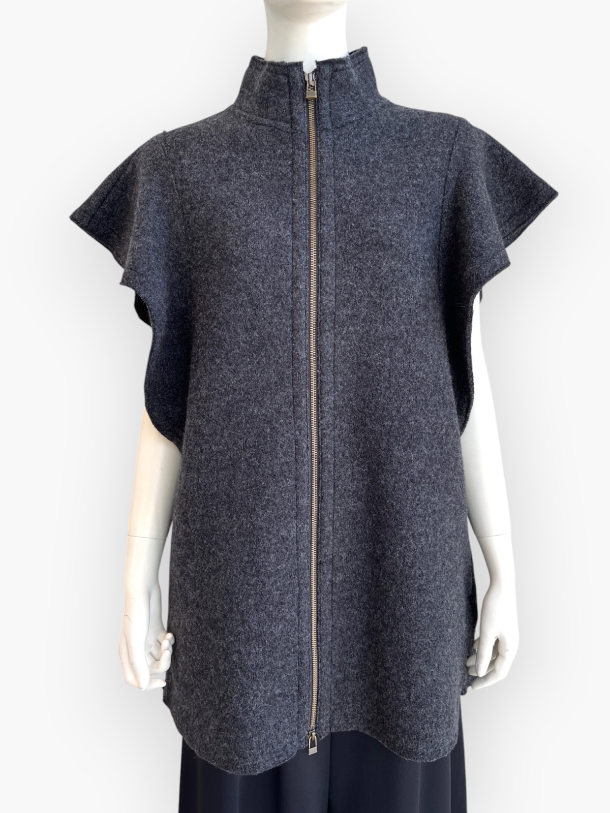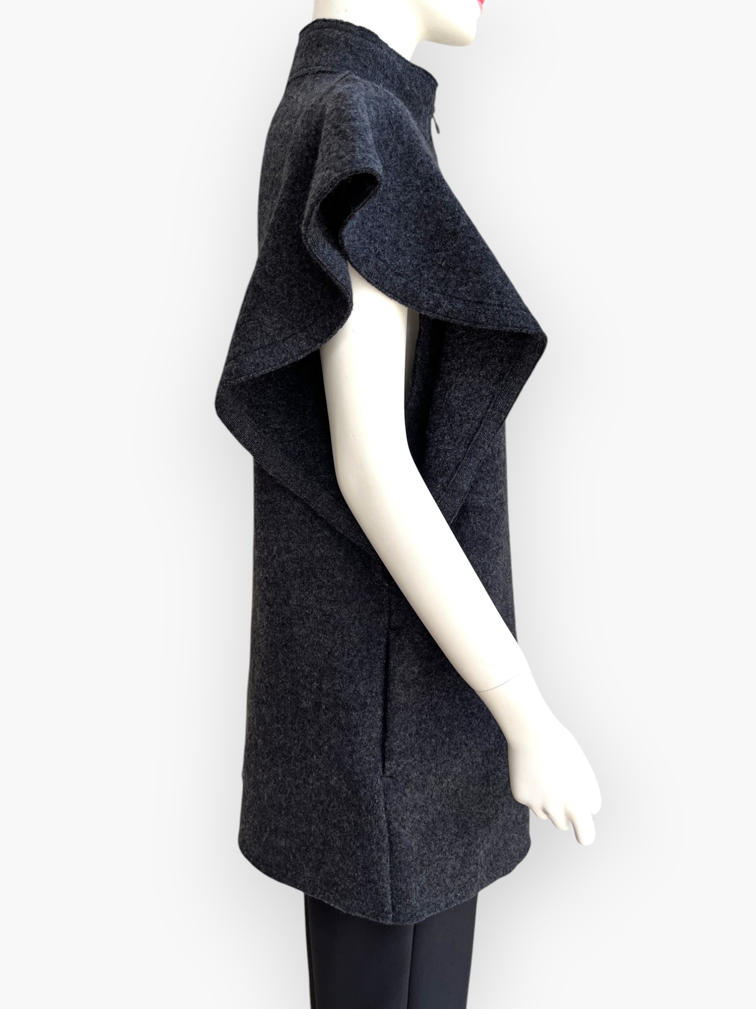 肩を落とし波打つようなフリル袖で仕上げたジレは腕をすっきり見せてくれます。
