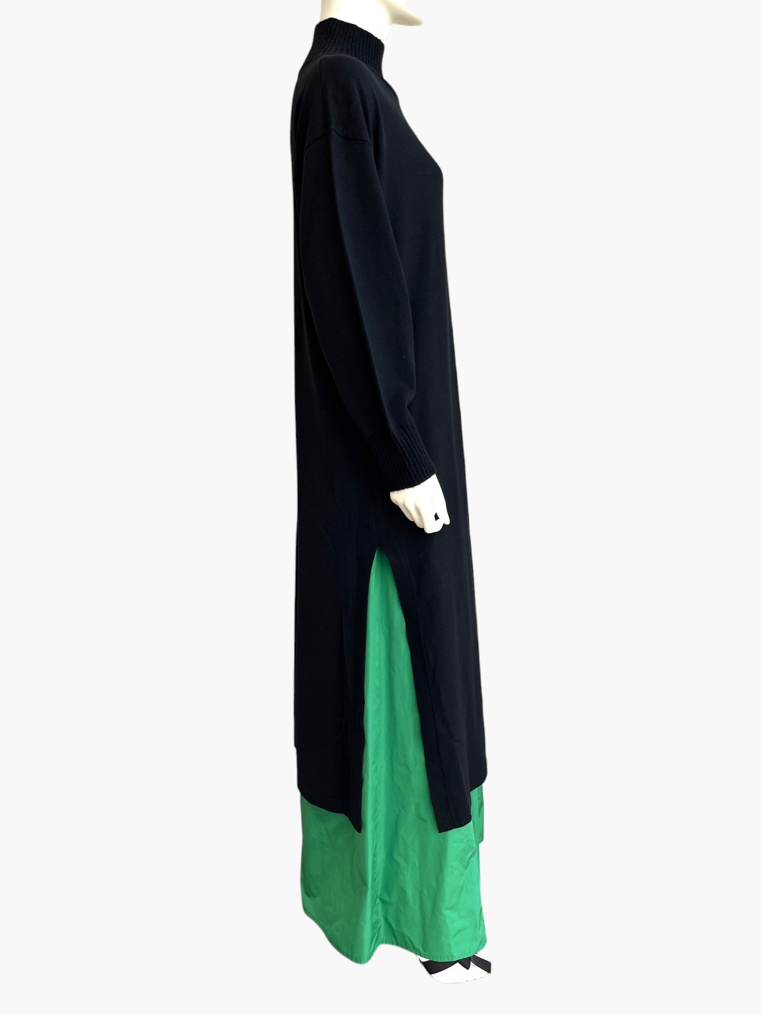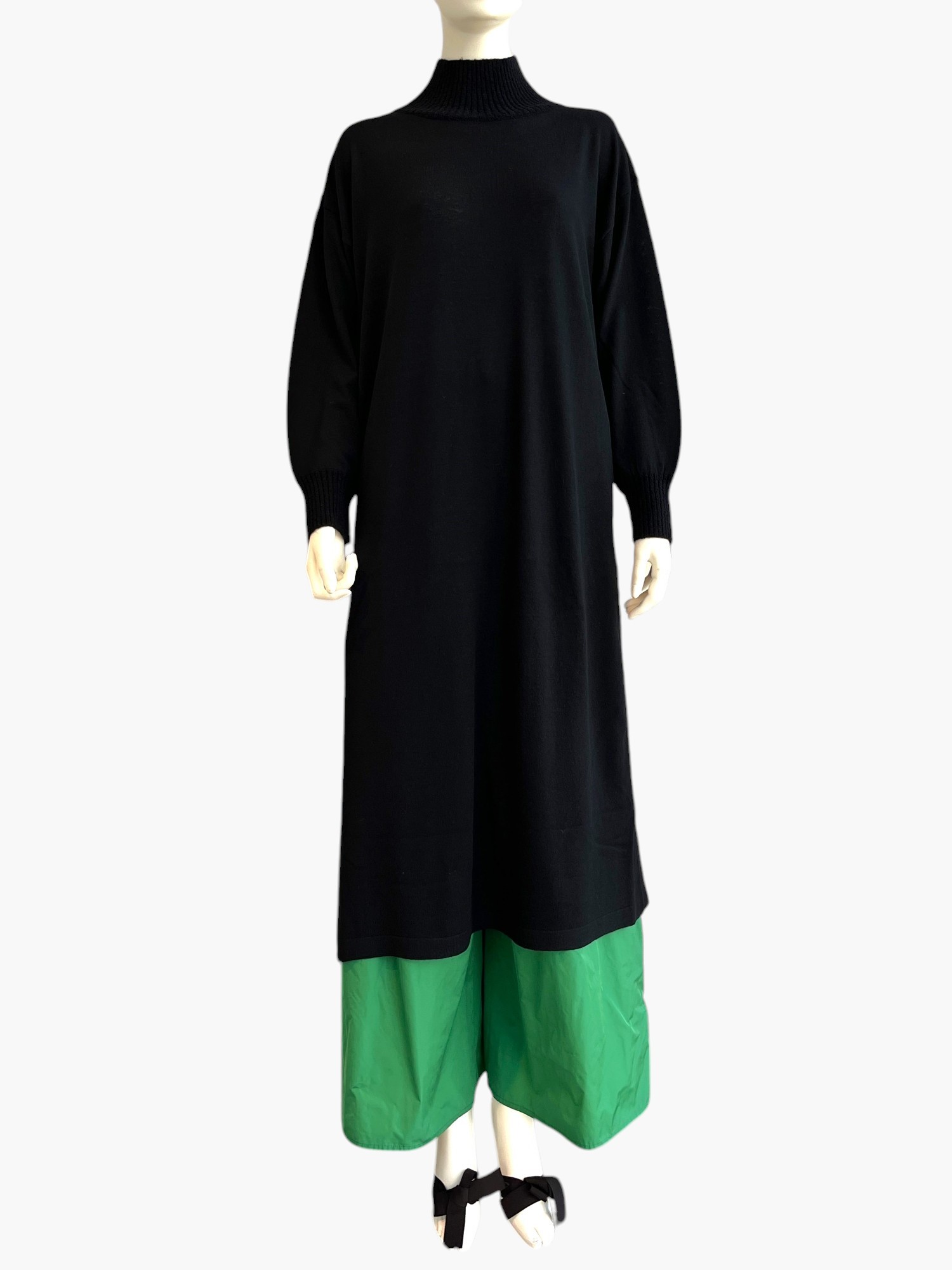 ハイネックとロングの丈感で包み込むようなフォルム感が温もりを感じさせるニットワンピース。