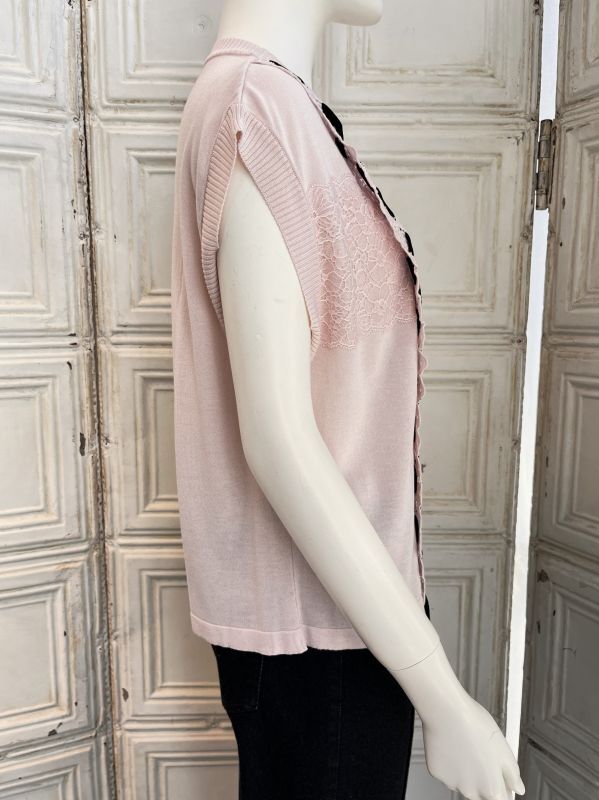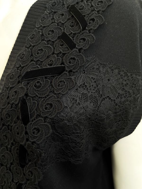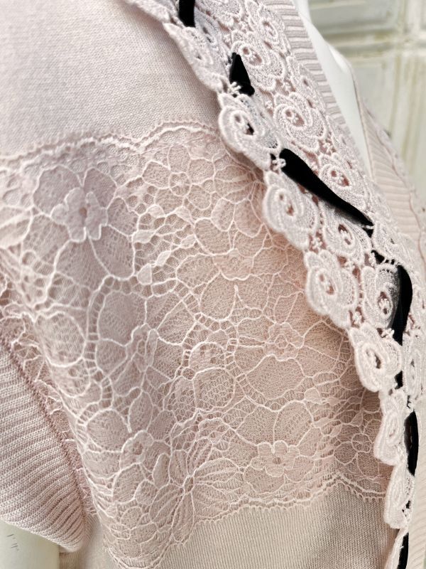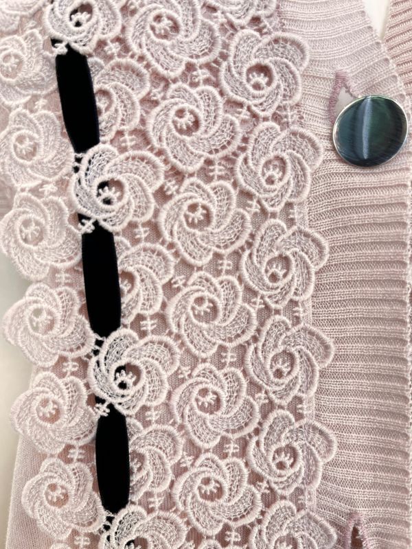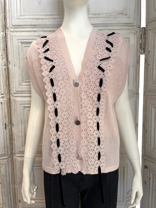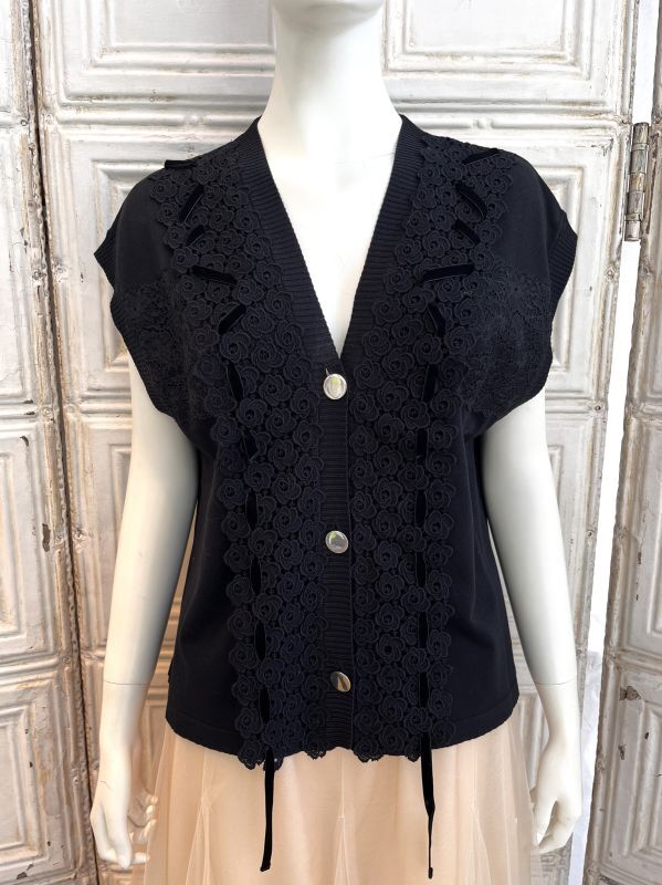 ベロアのリボンを絡めたバラ柄のレースが大人かわいいニットのジレ。