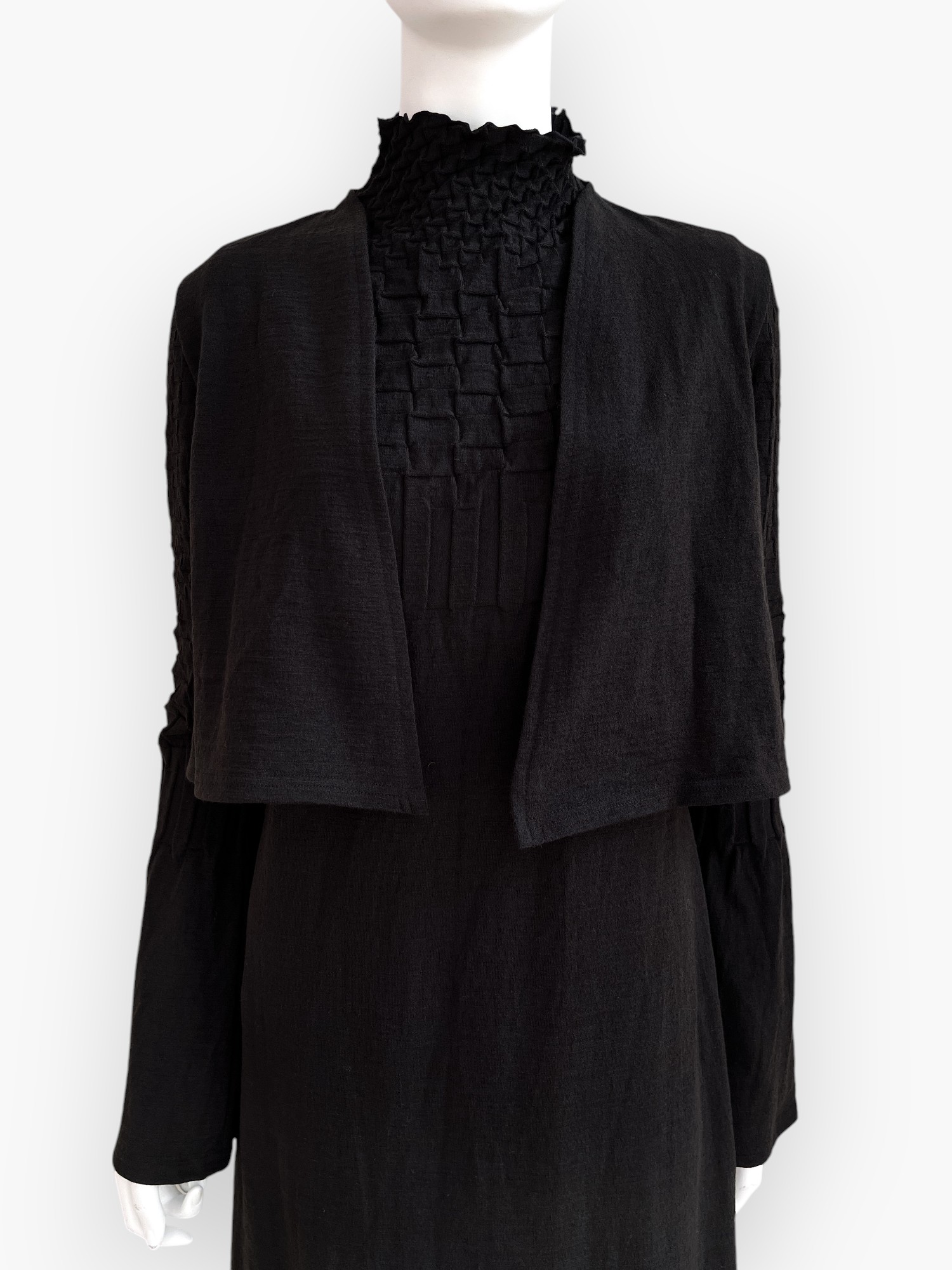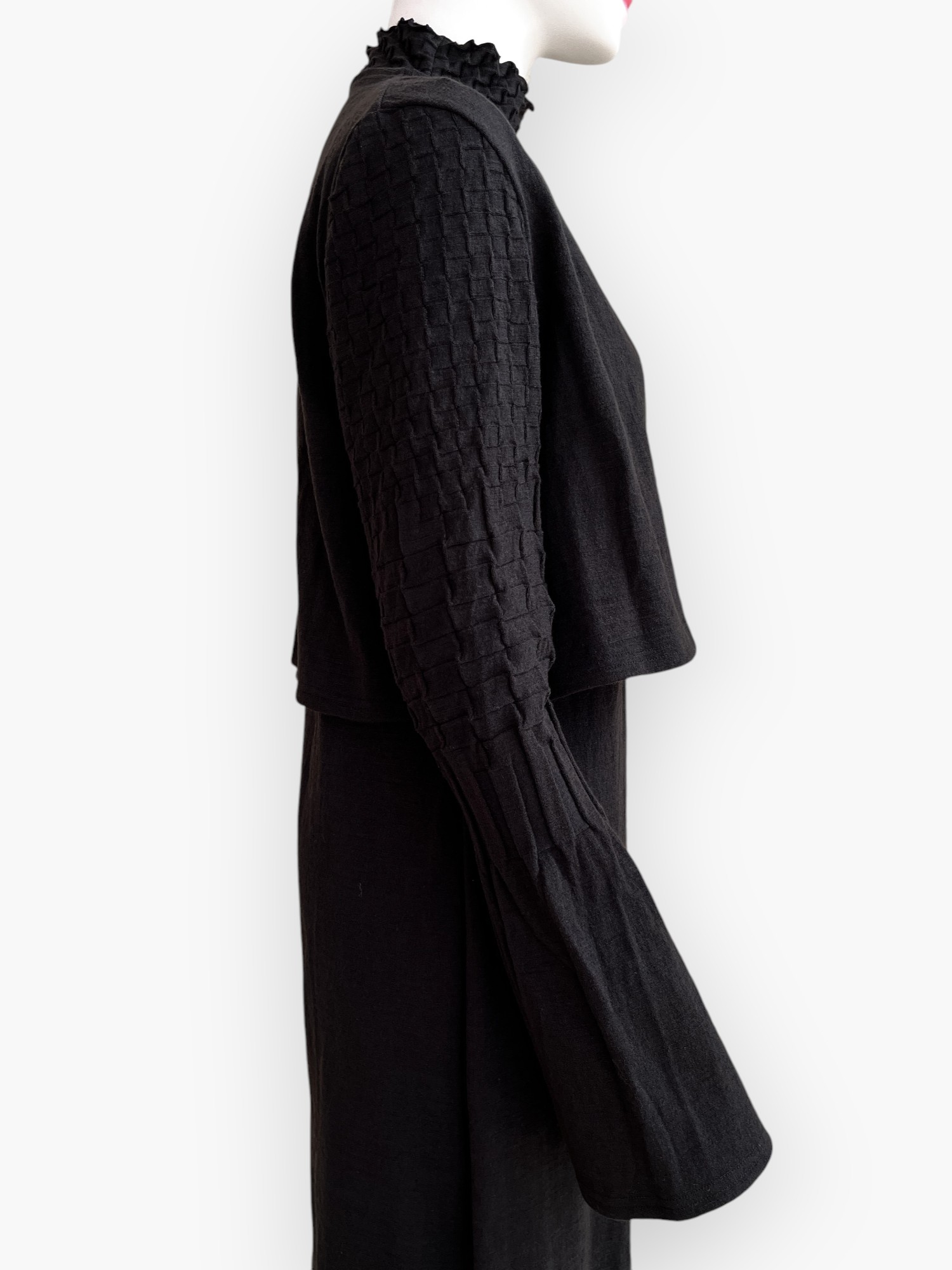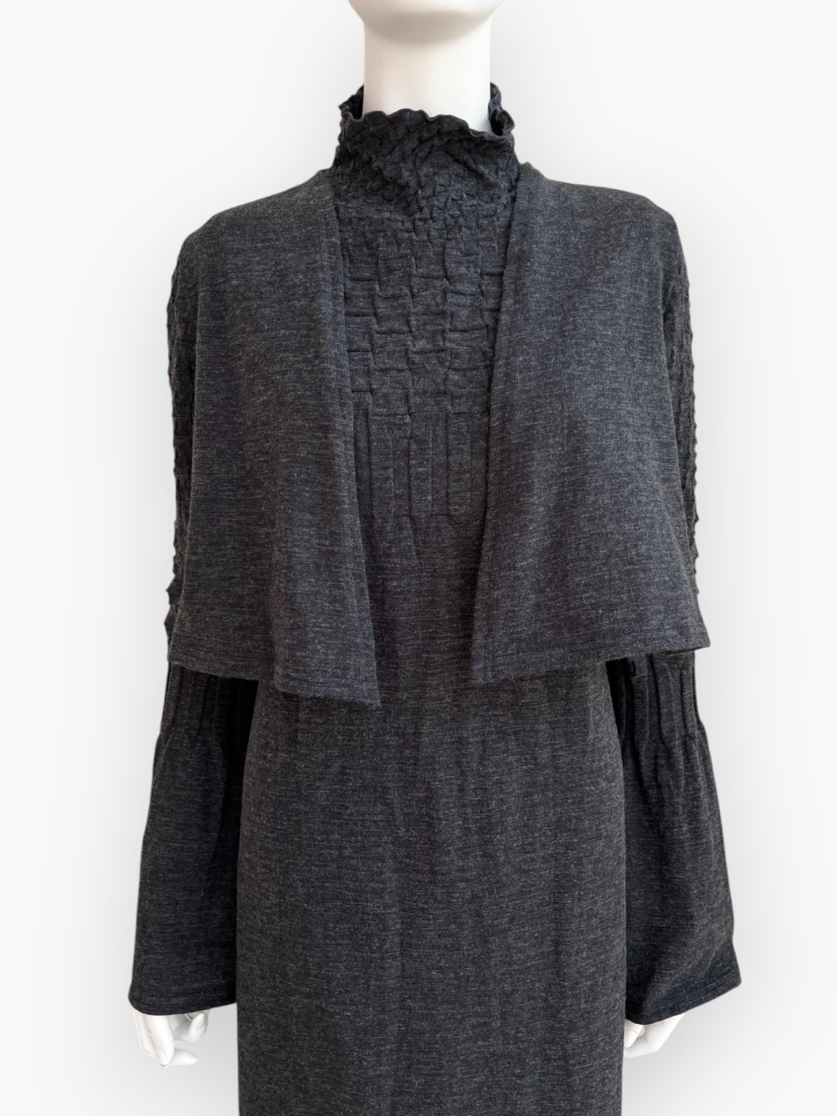 ほどよいドレープ性と収縮糸によるストレッチ性により着心地も向上した素材。