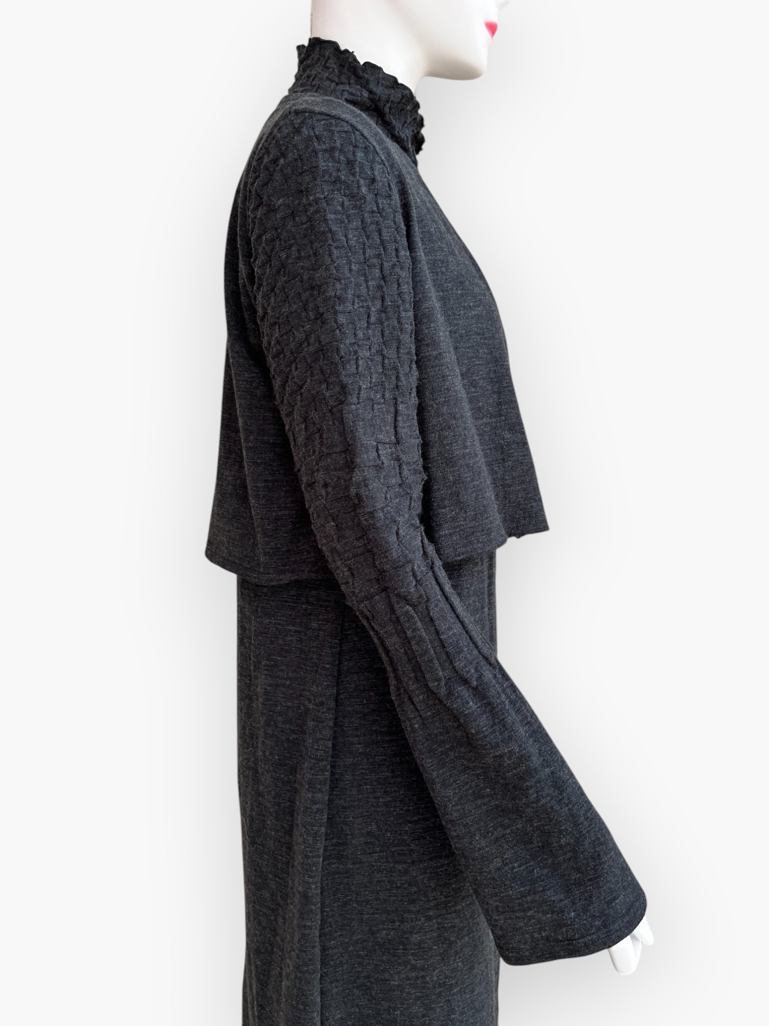 引きそろえて編みこむことで、アクリル・ウールの暖かみと、収縮糸によるストレッチ性を作り出した。