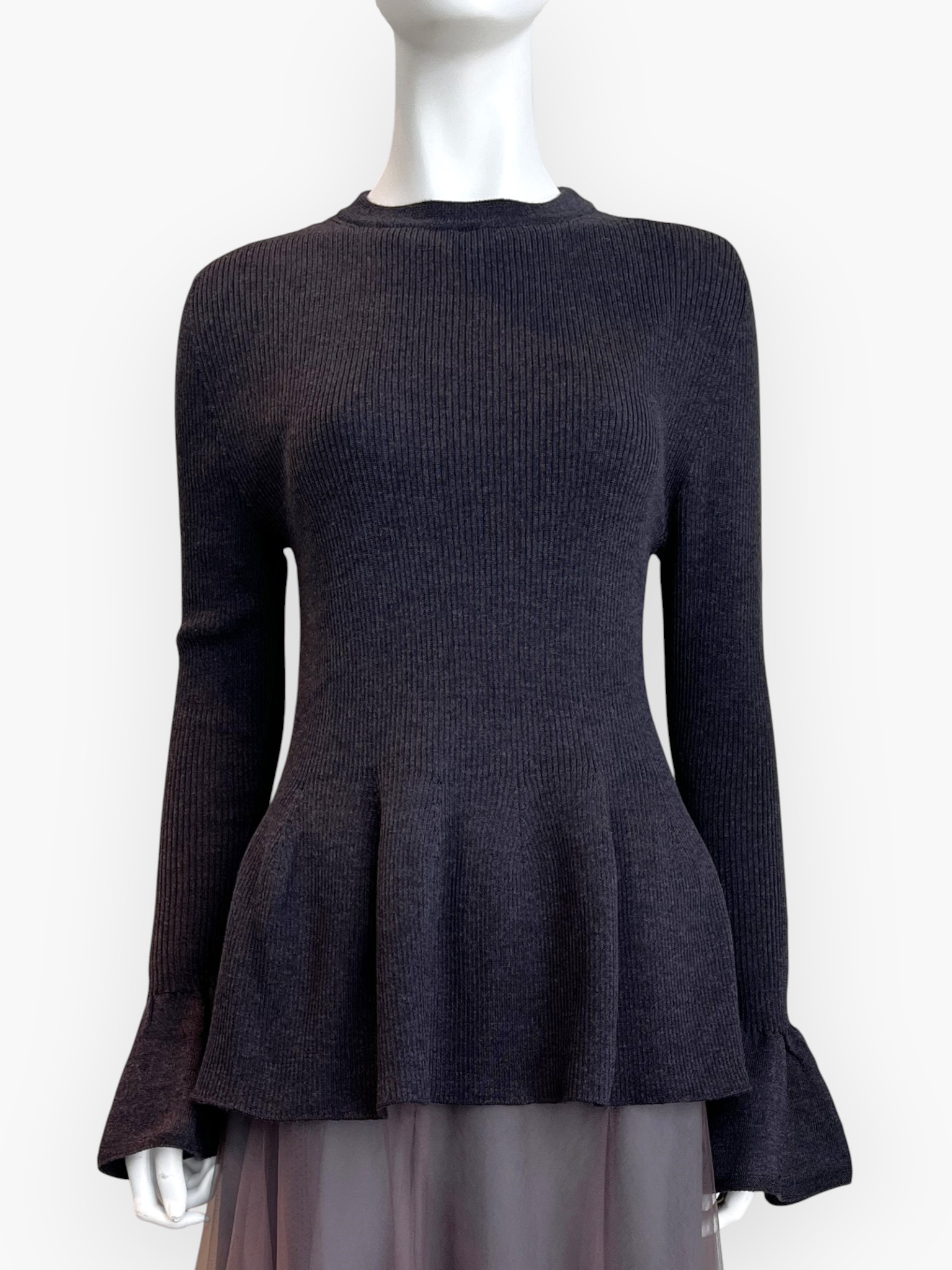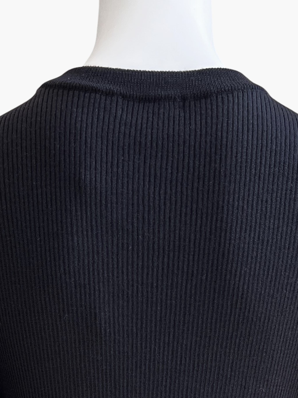 コンパクトなクルーネックと程よいフィット感のボディコンシャスなリブ編みニットです。
