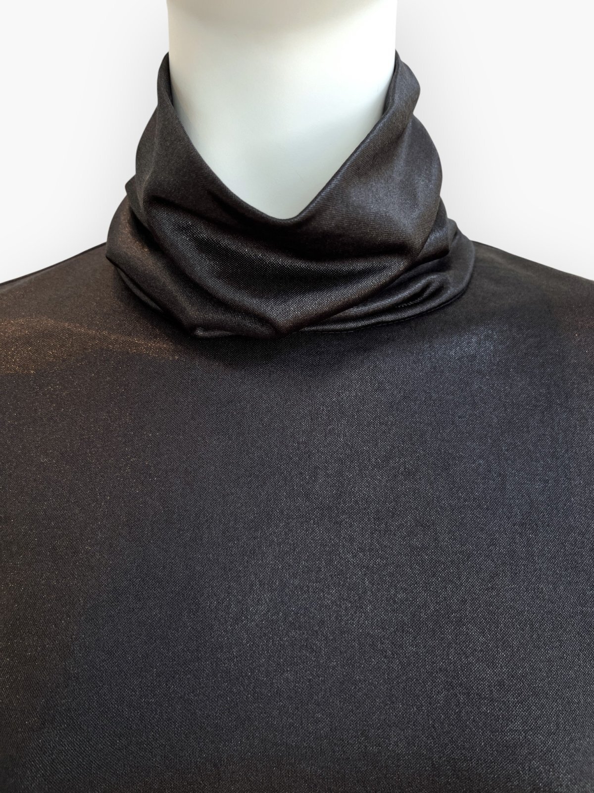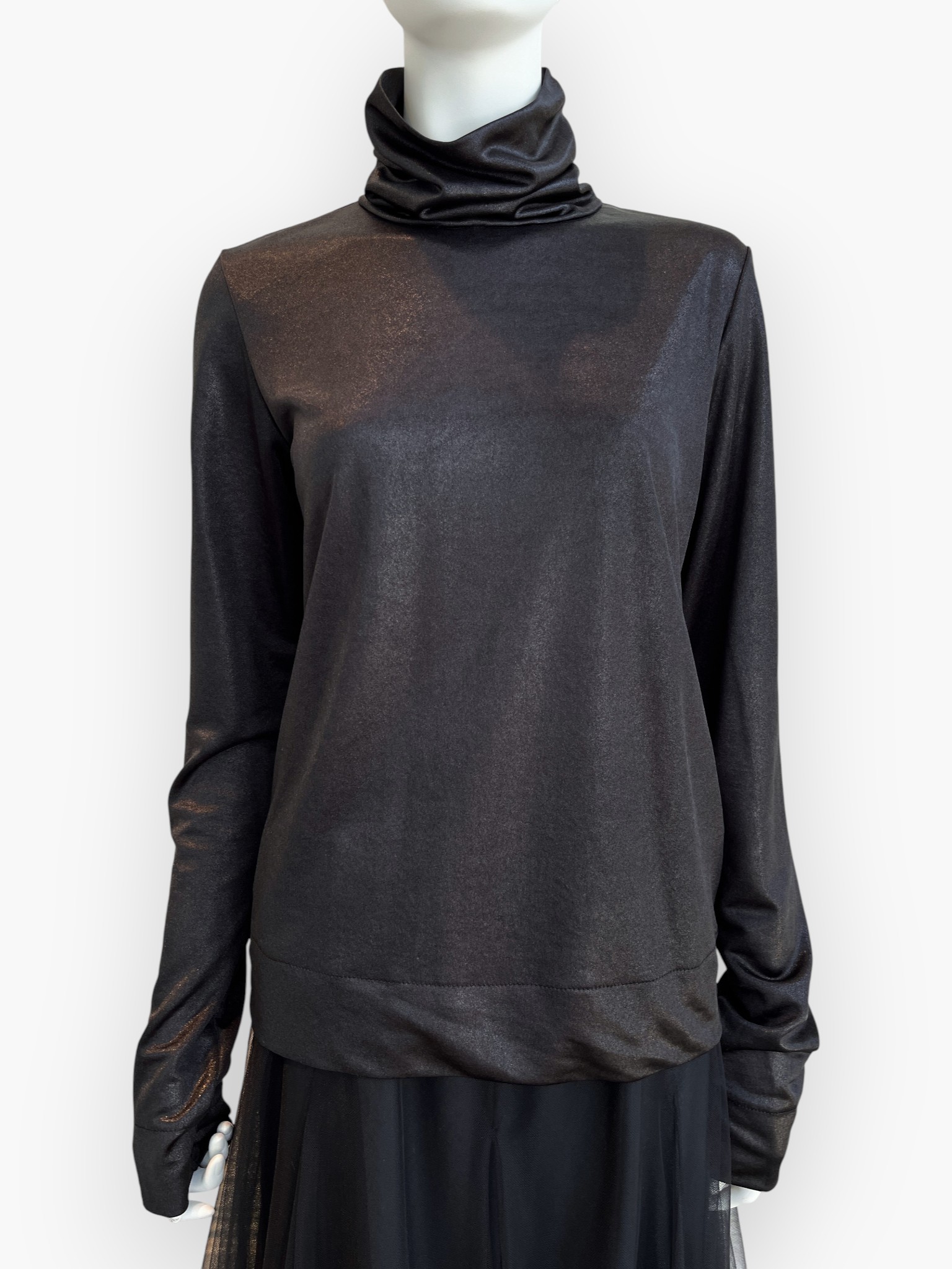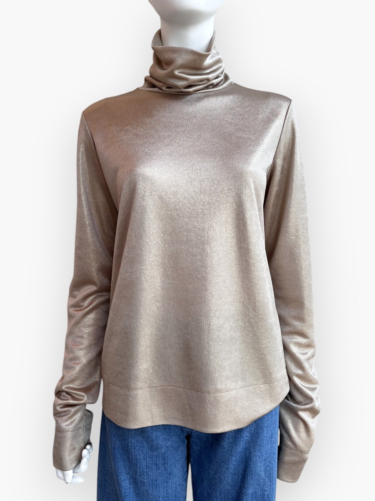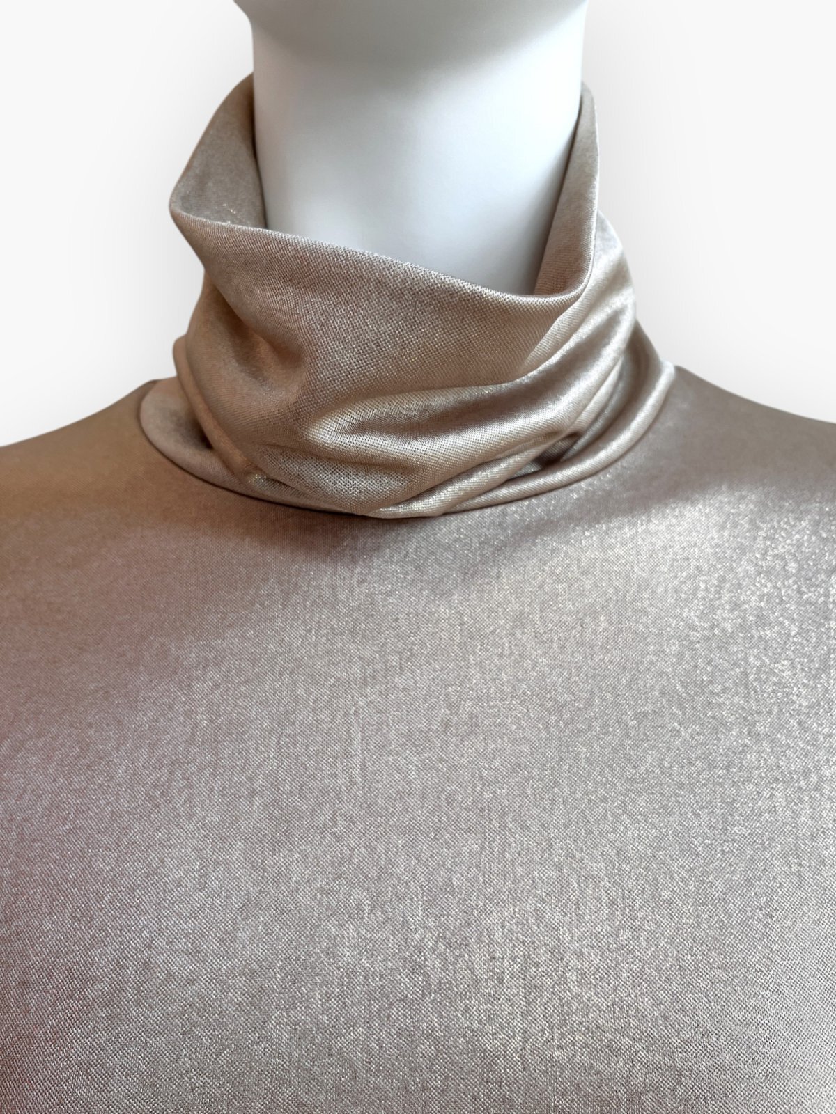 何にでも合わせやすいベーシックなスタンドネックのインナーを、きらめく素材でワンランクアップさせました。