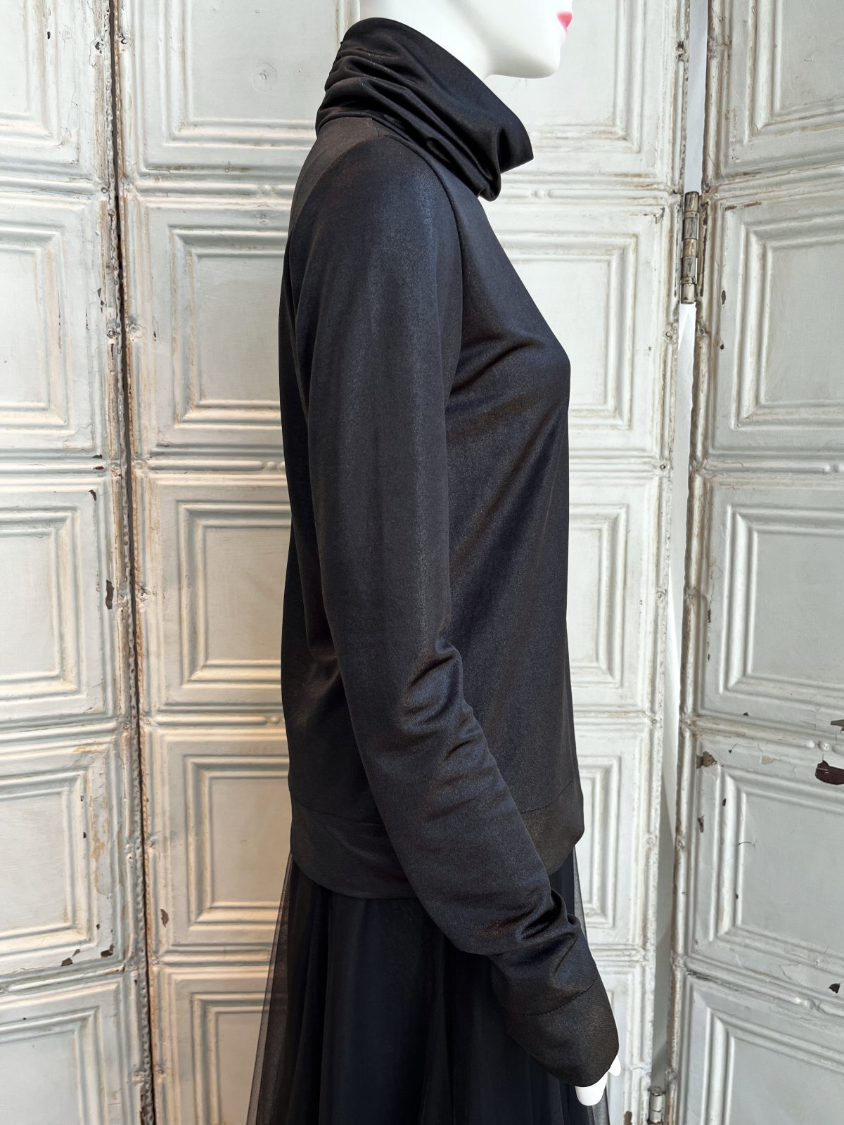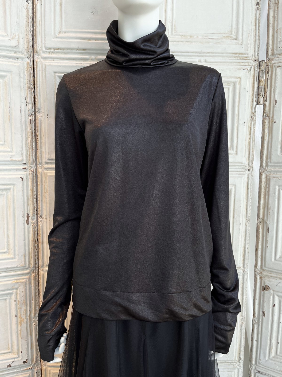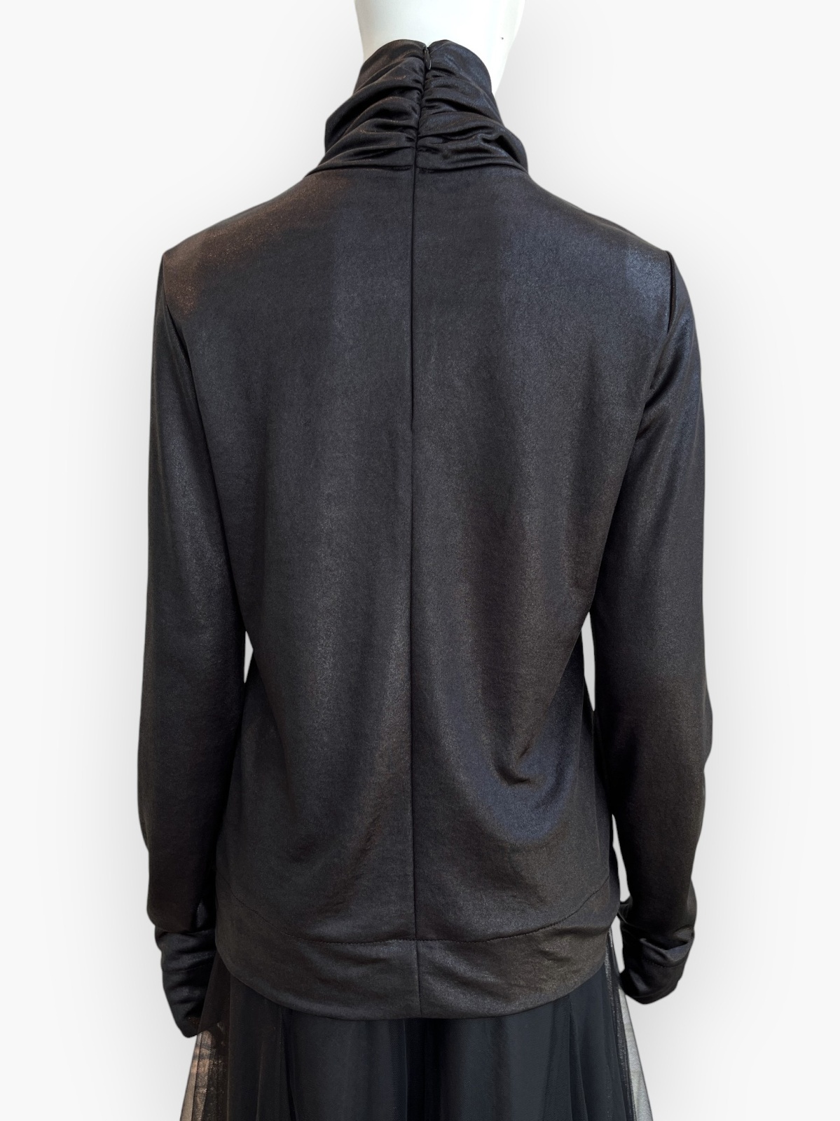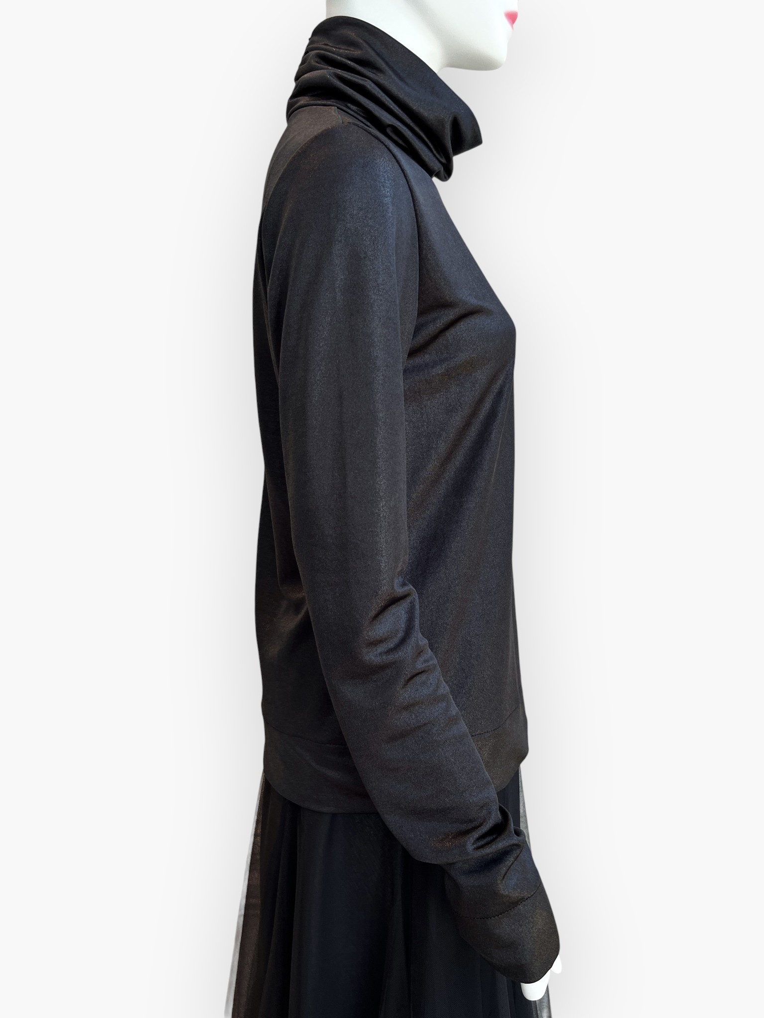 何にでも合わせやすいベーシックなスタンドネックのインナーを、きらめく素材でワンランクアップさせました。