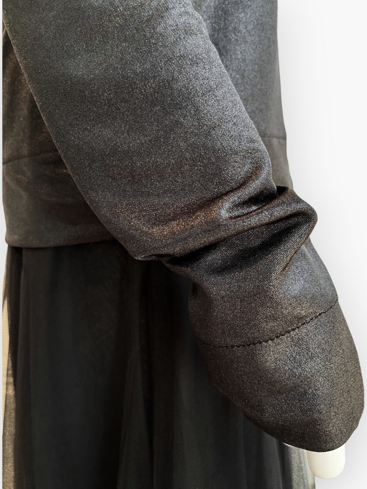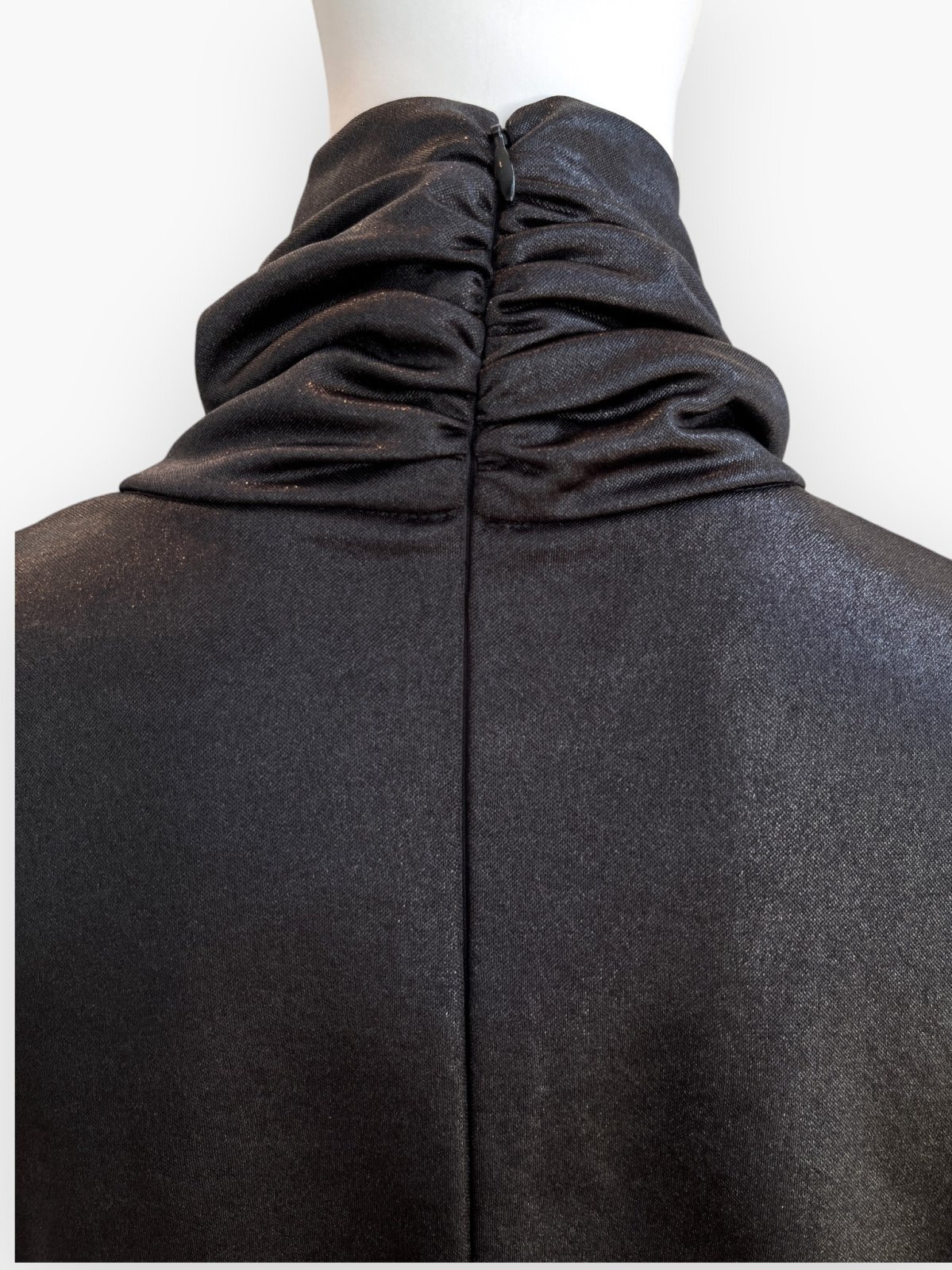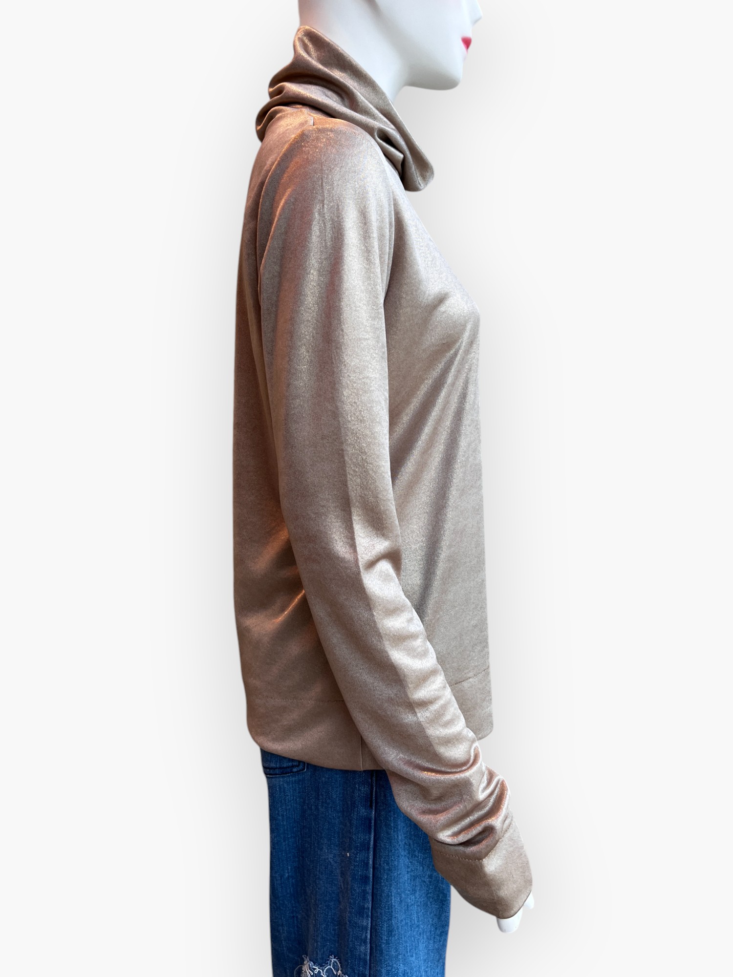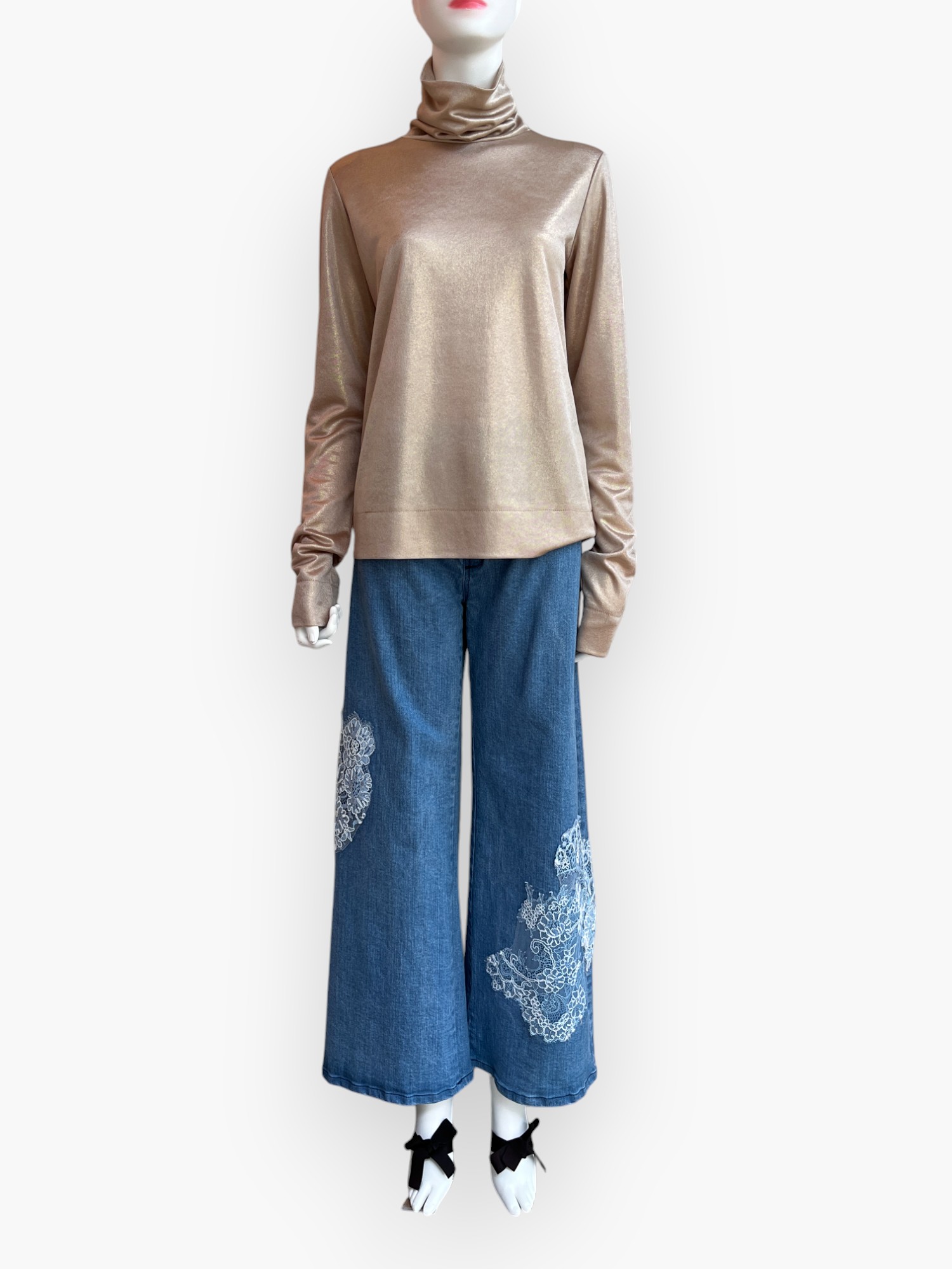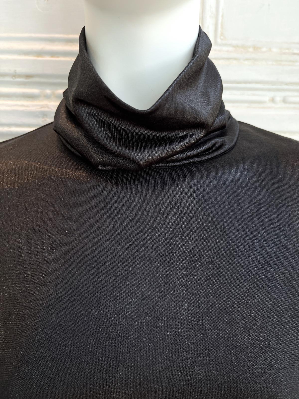 何にでも合わせやすいベーシックなスタンドネックのインナーを、きらめく素材でワンランクアップさせました。