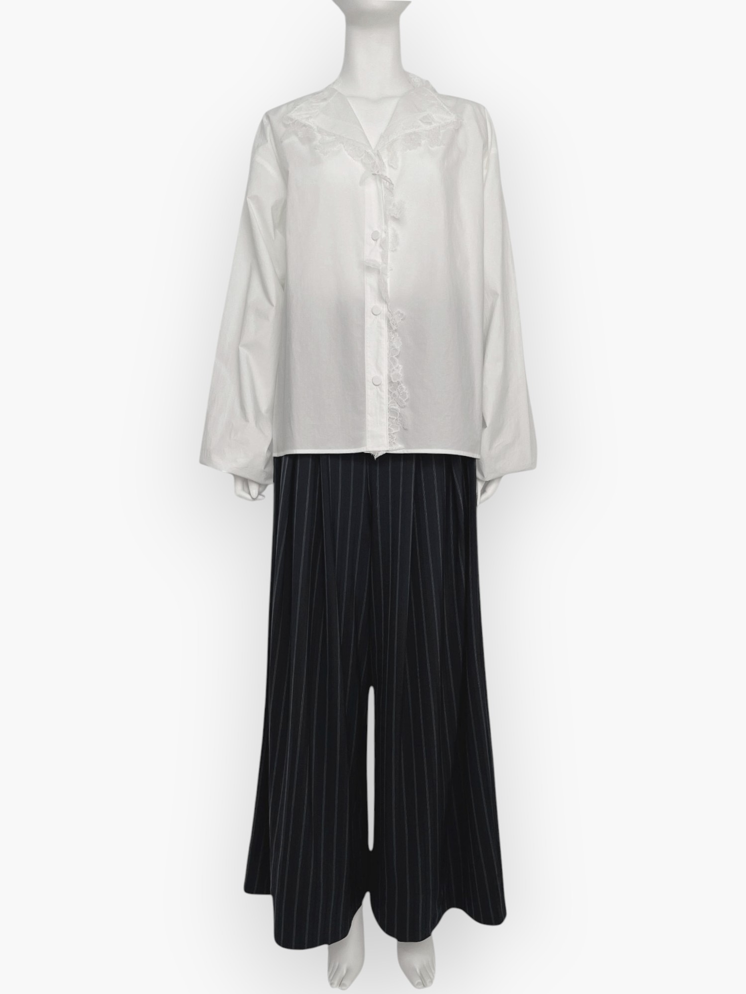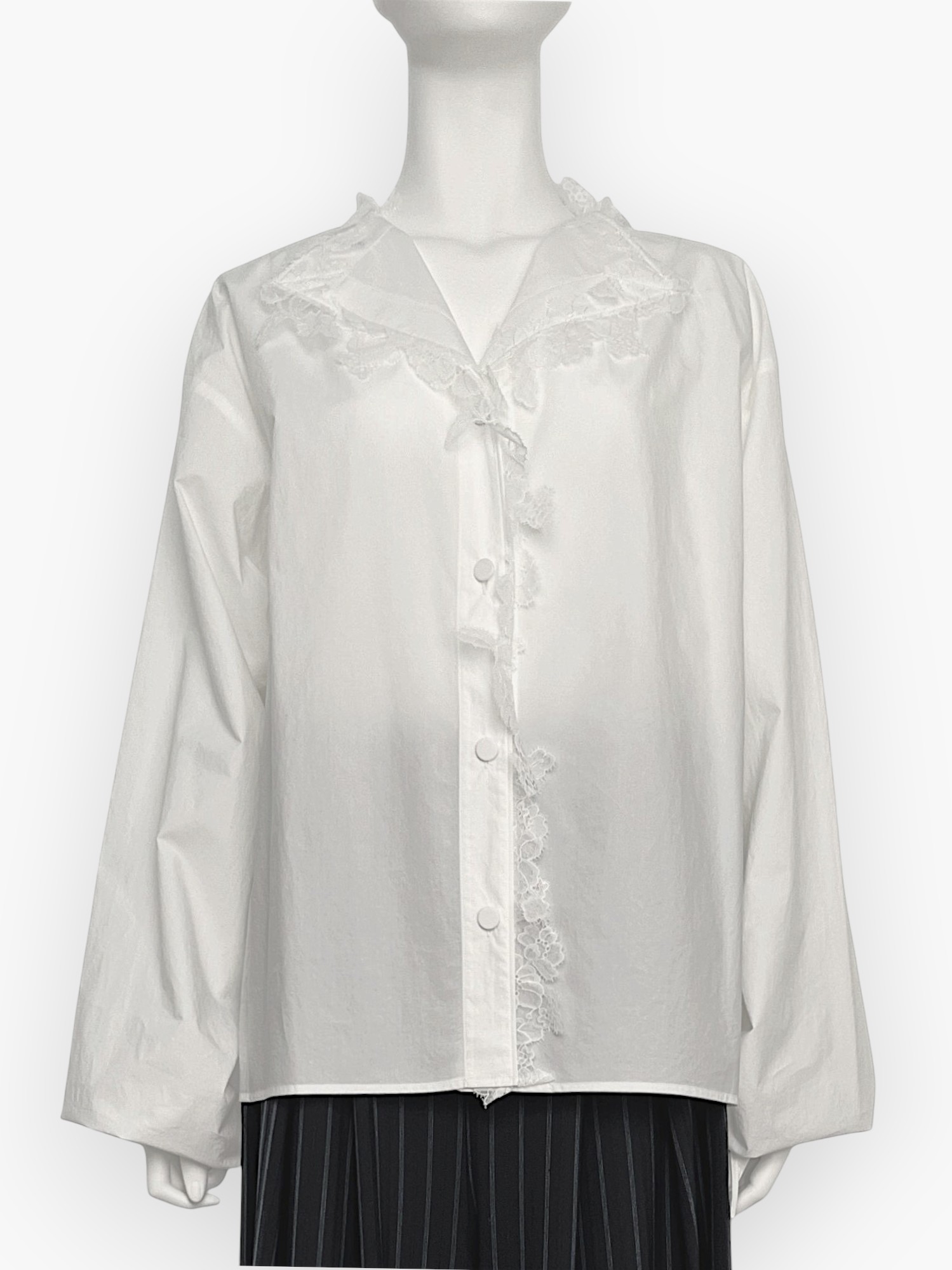 ネックラインから前立て部分にかけて繊細なレースを挟み込んで仕上げた大人のシャツ。