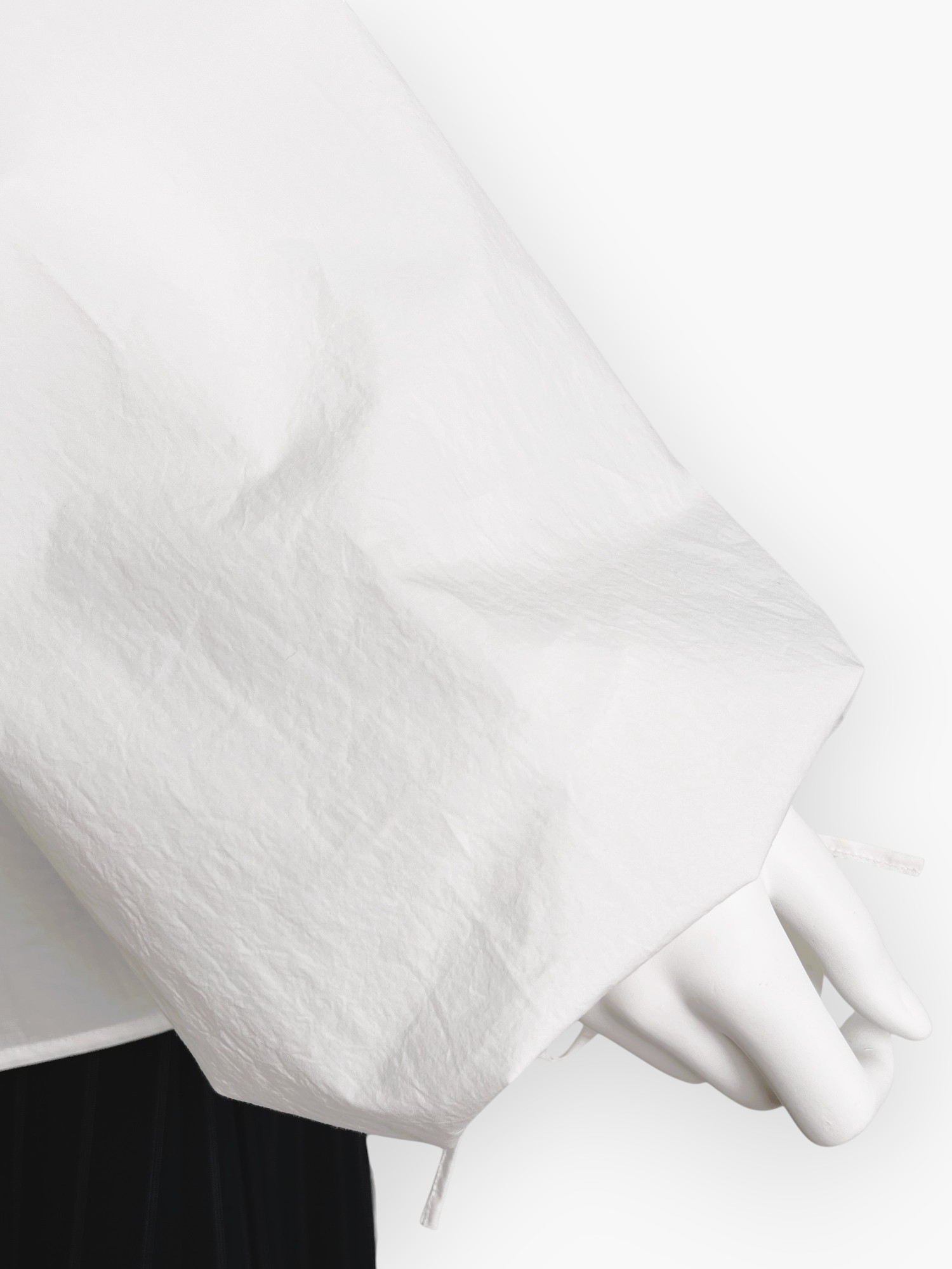 袖口に通したひもを絞って袖に立体感とフェミニンさをプラスしても◎