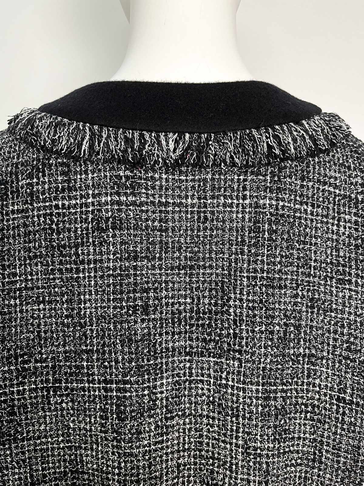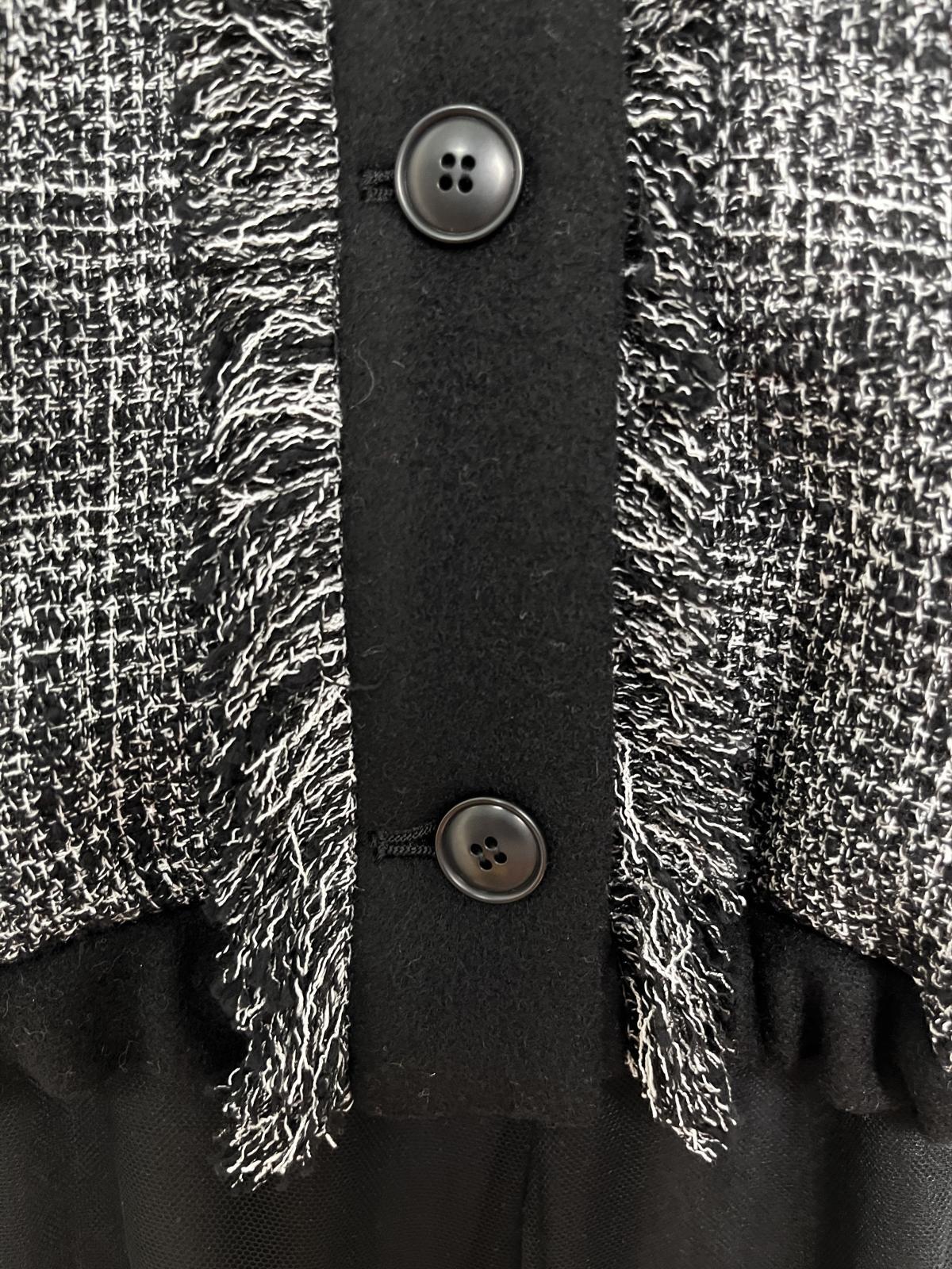 白と黒の糸で織られた、モノトーンのブッチャーツイードにブラックのブレードを施しメリハリをつけました。