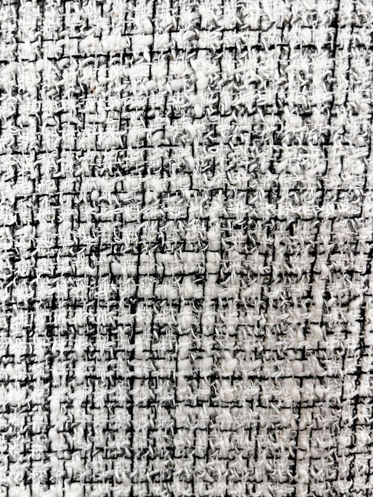 白と黒の糸で織られた、モノトーンのブッチャーツイードを使用し、カジュアルになりすぎない上品な仕上がりに。