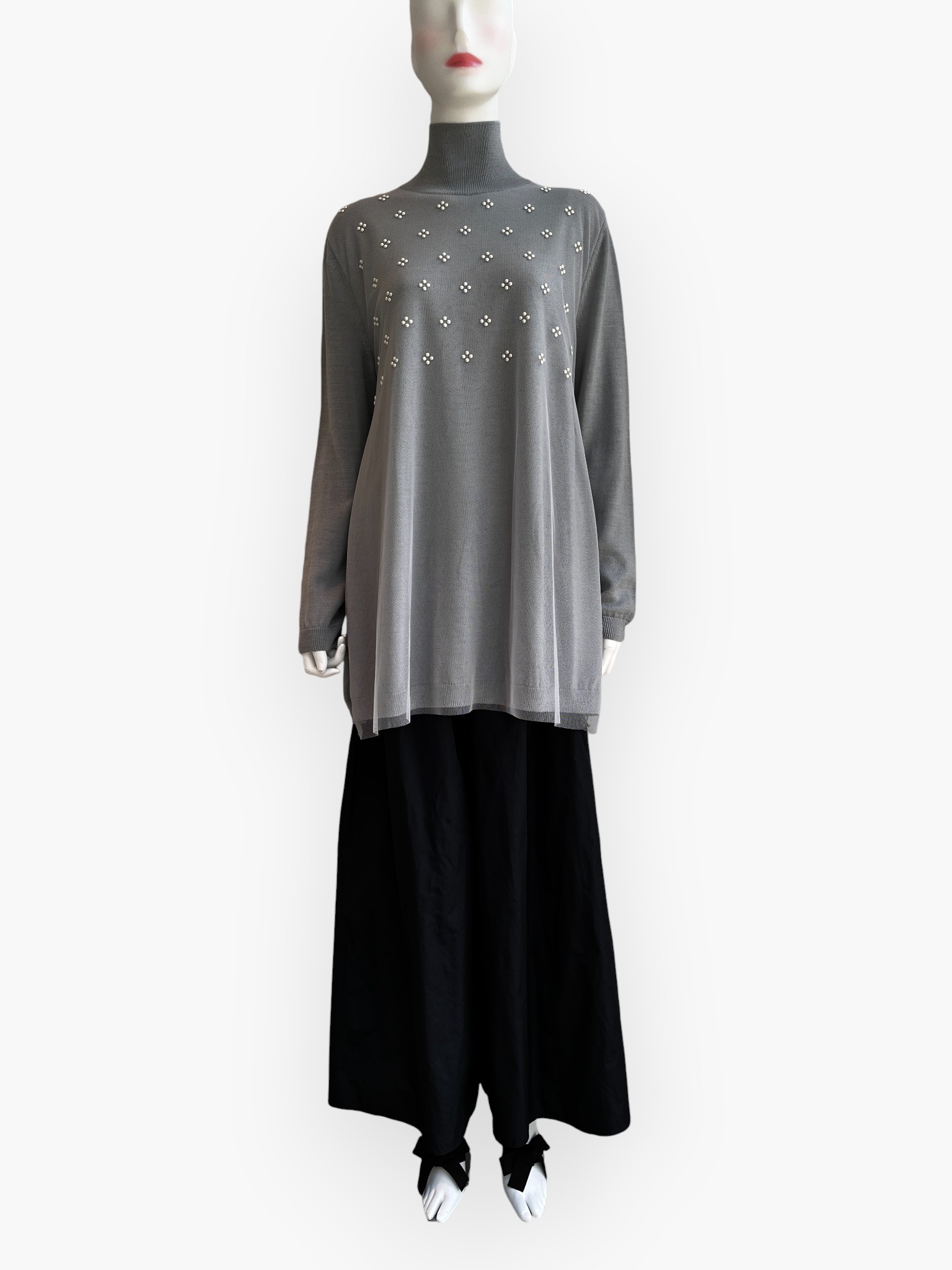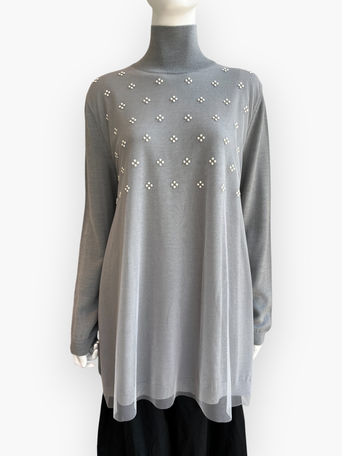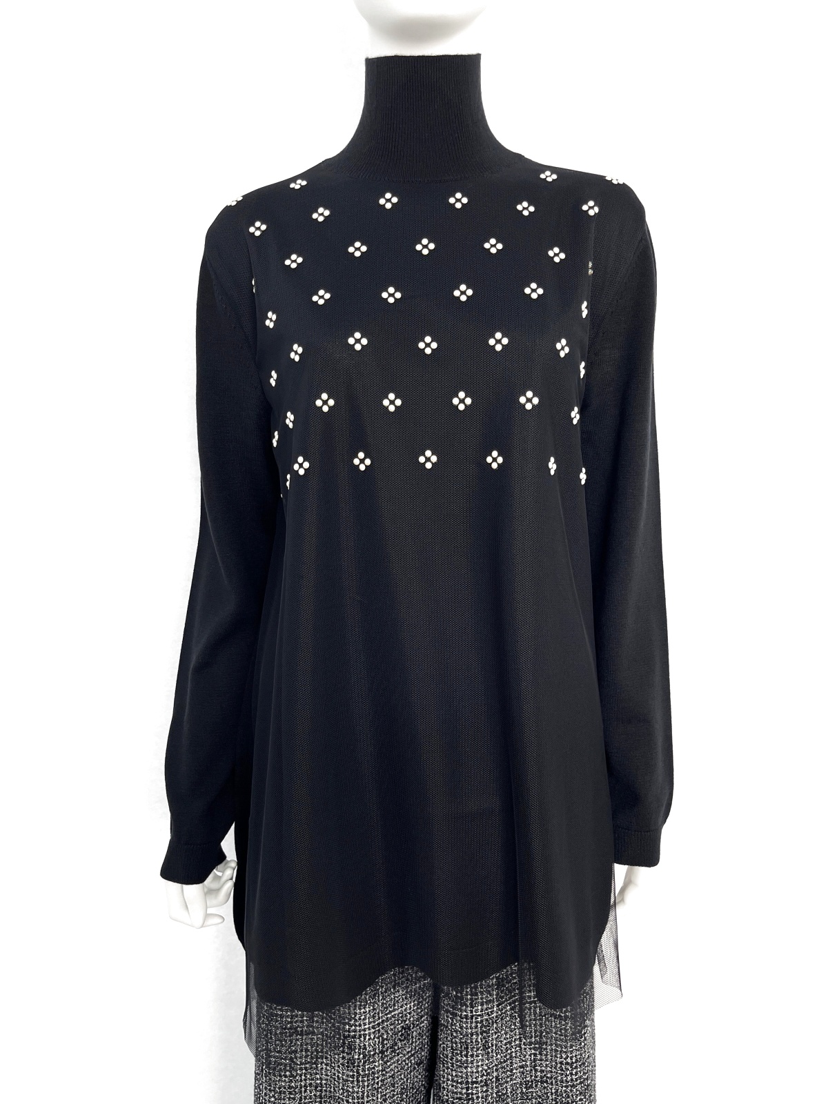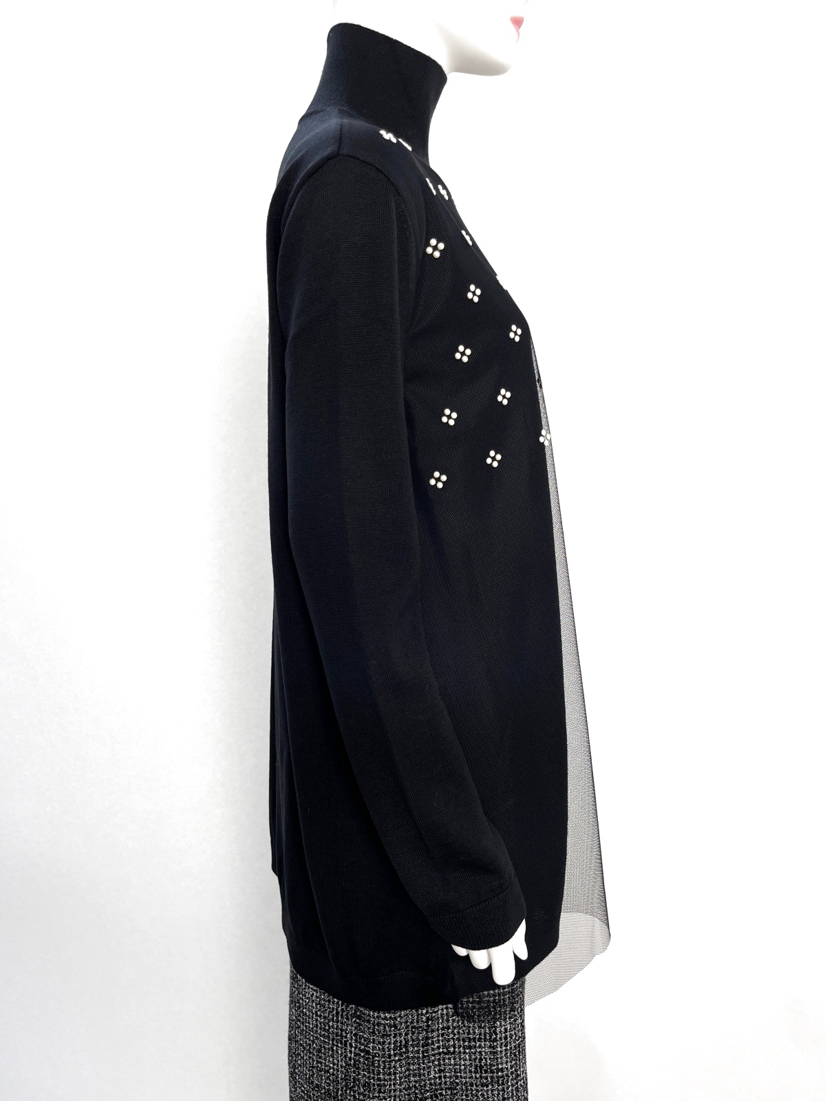 チュールにぷっくりとした立体感があるドームパールをホットフィット加工し、ニットとドッキングさせた着映えるチュニック。