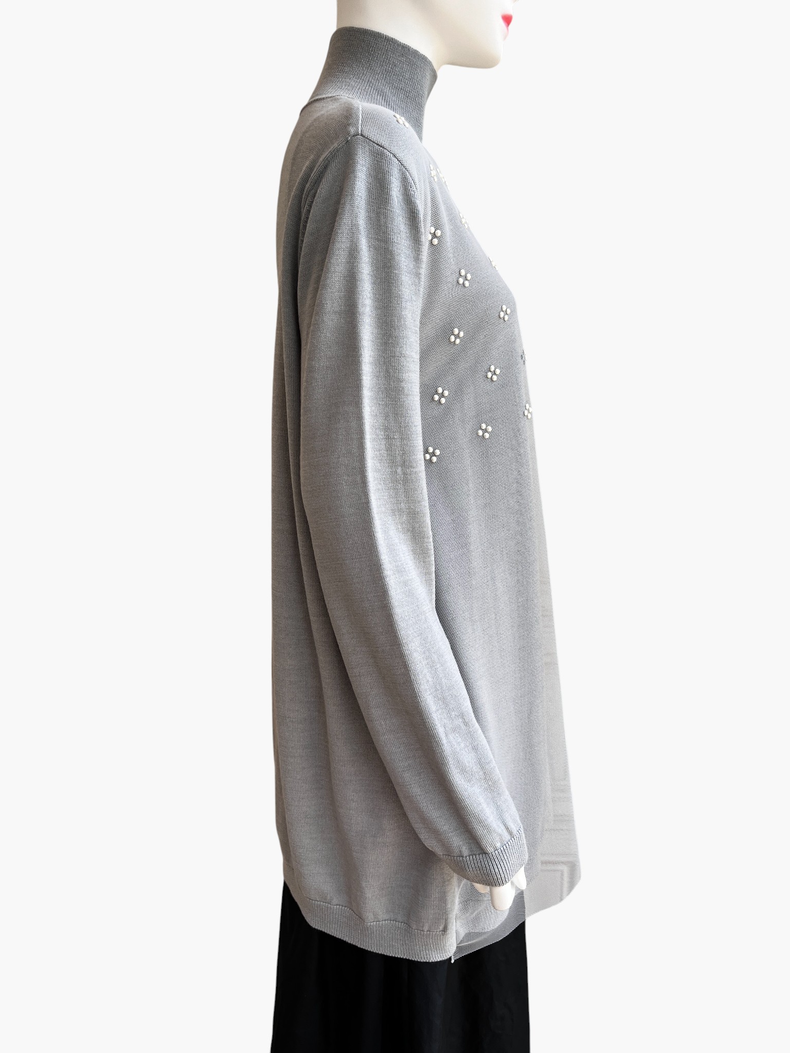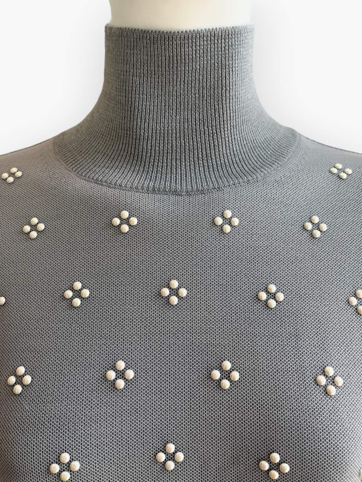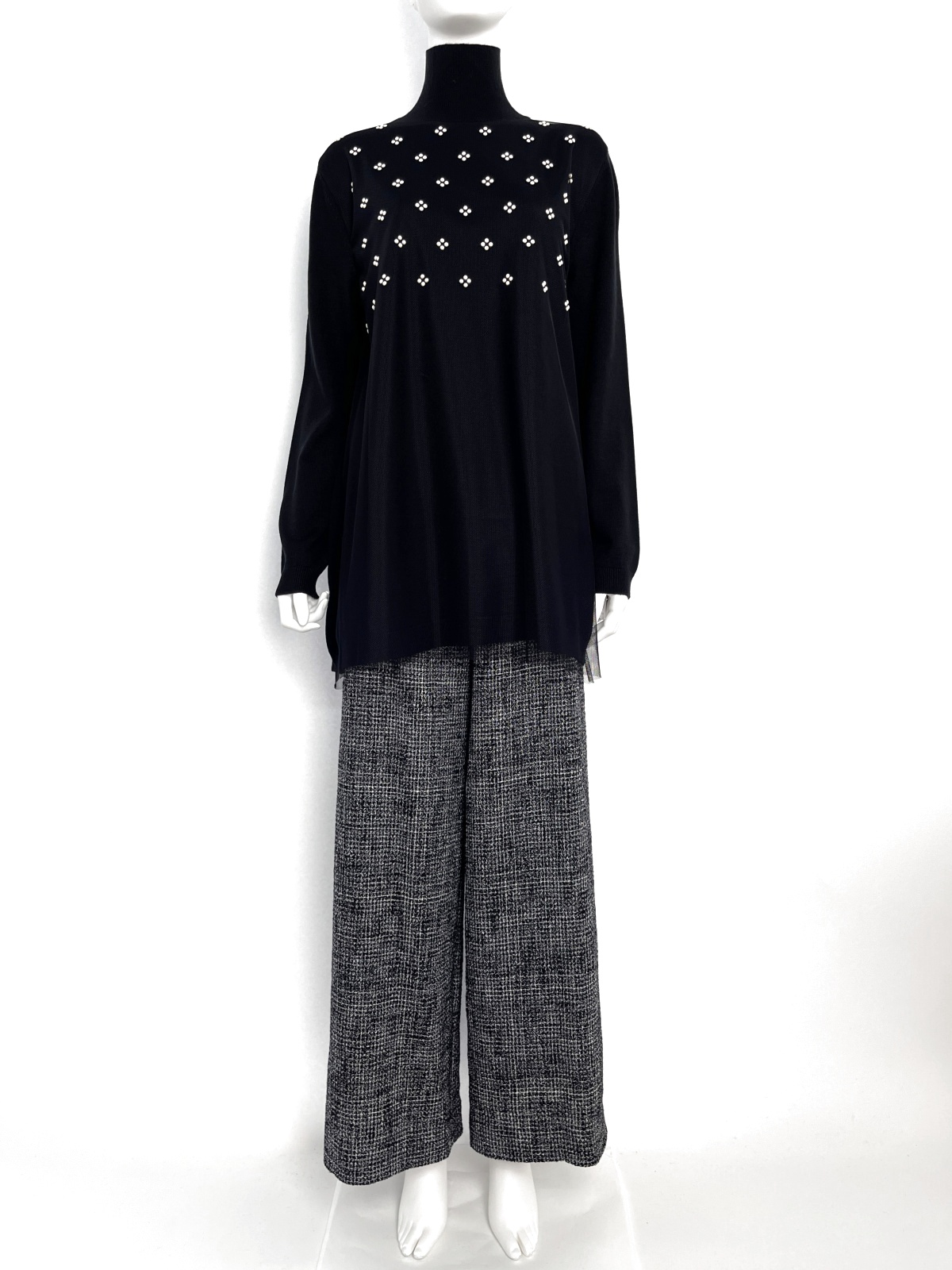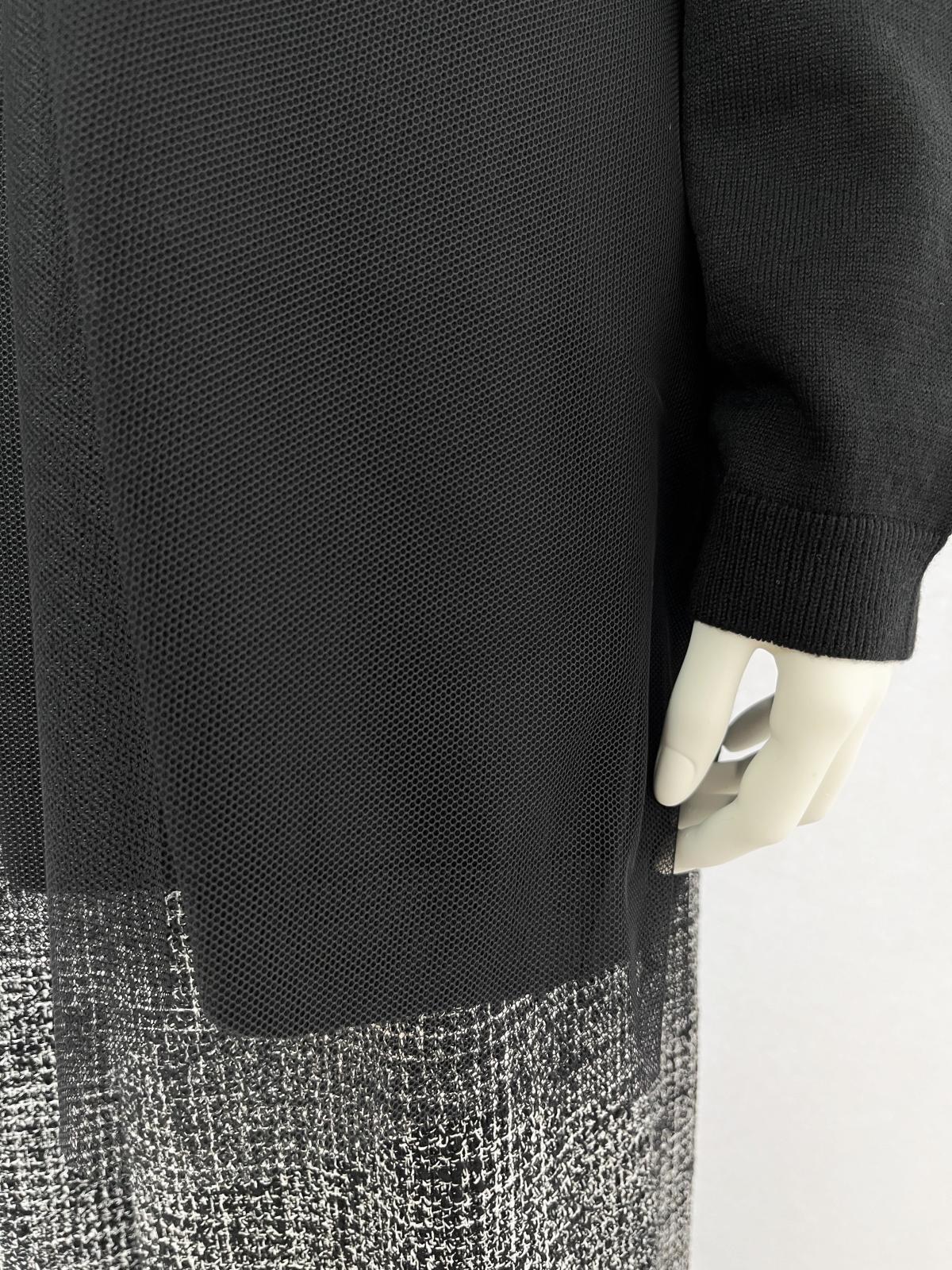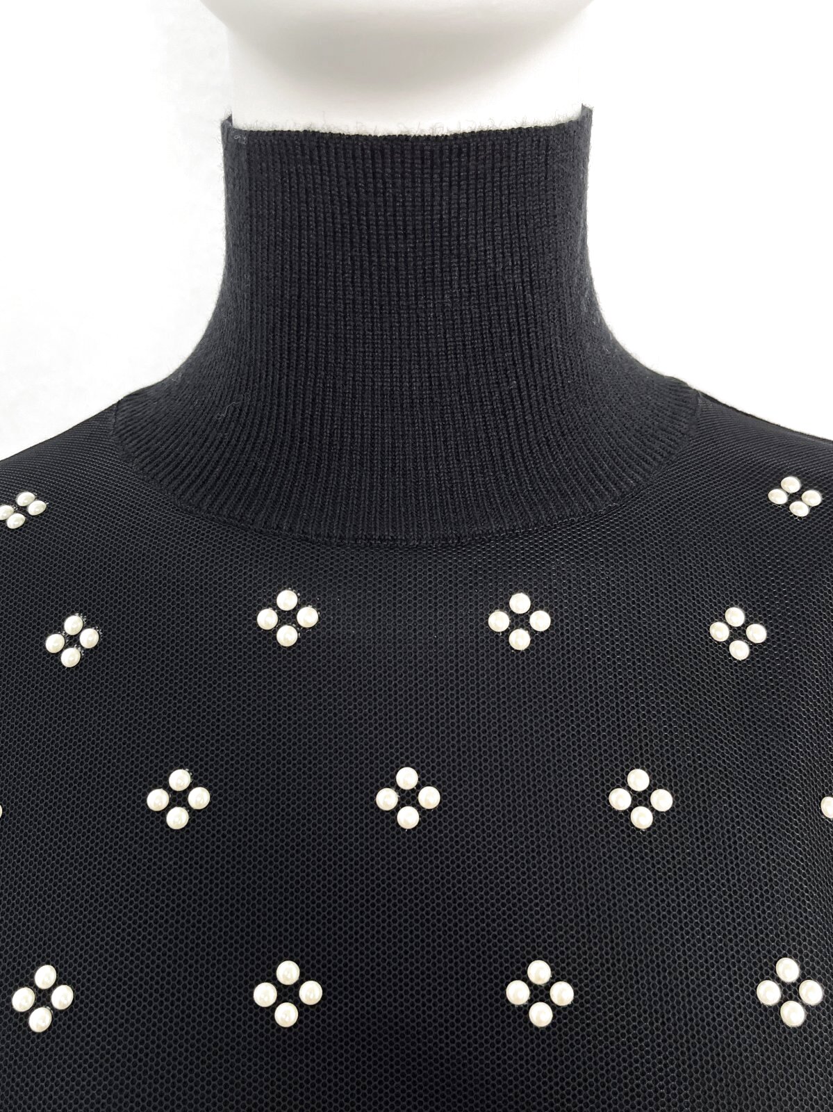 チュールにぷっくりとした立体感があるドームパールをホットフィット加工し、ニットとドッキングさせた着映えるチュニック。