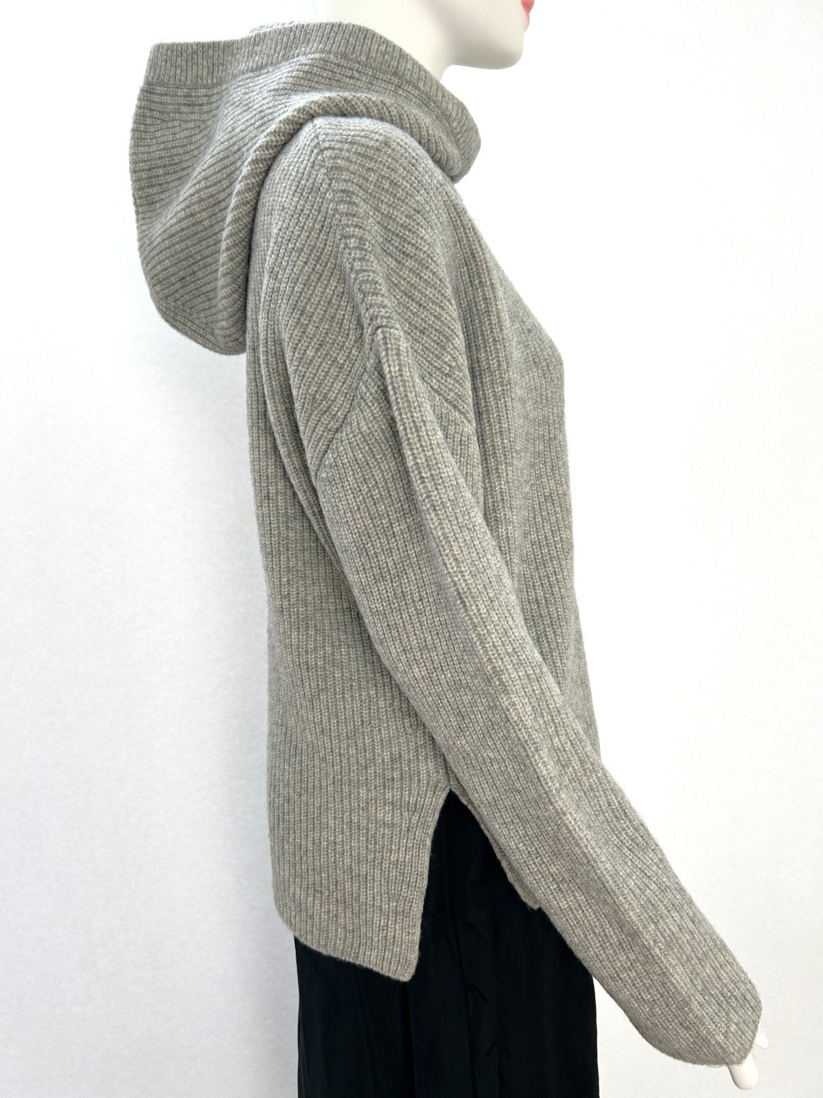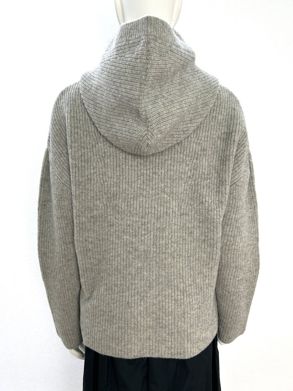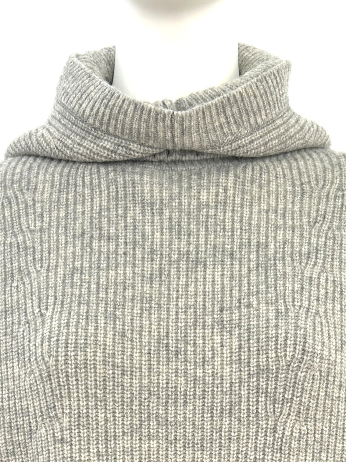 ネックウォーマーの様に取り外せ、首元にボリュームを出せるフードを付けた遊び心あるニットです。