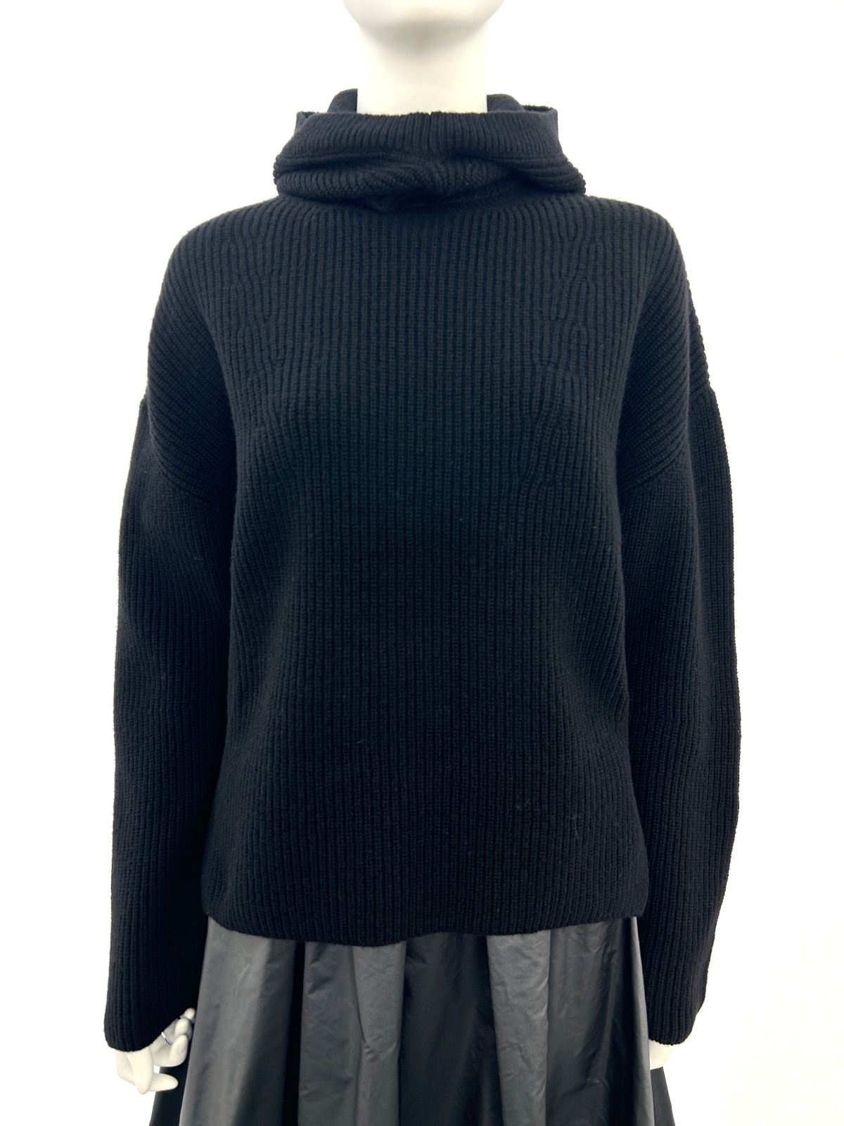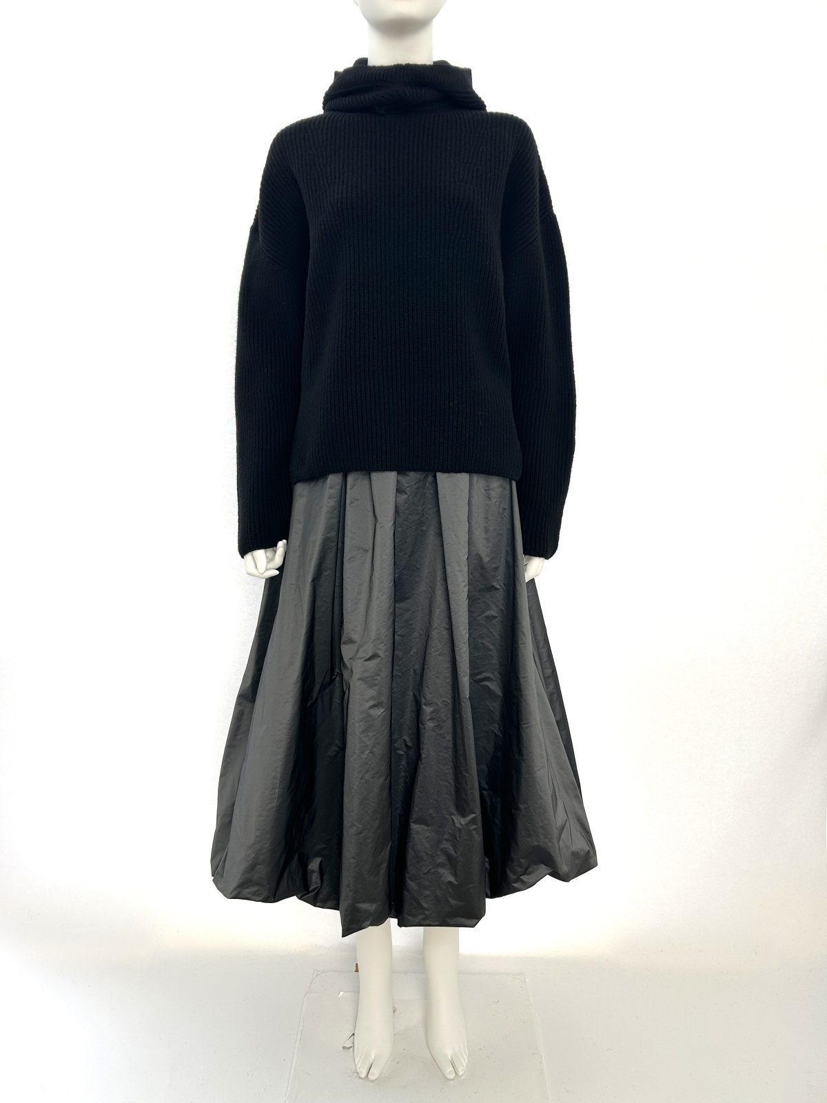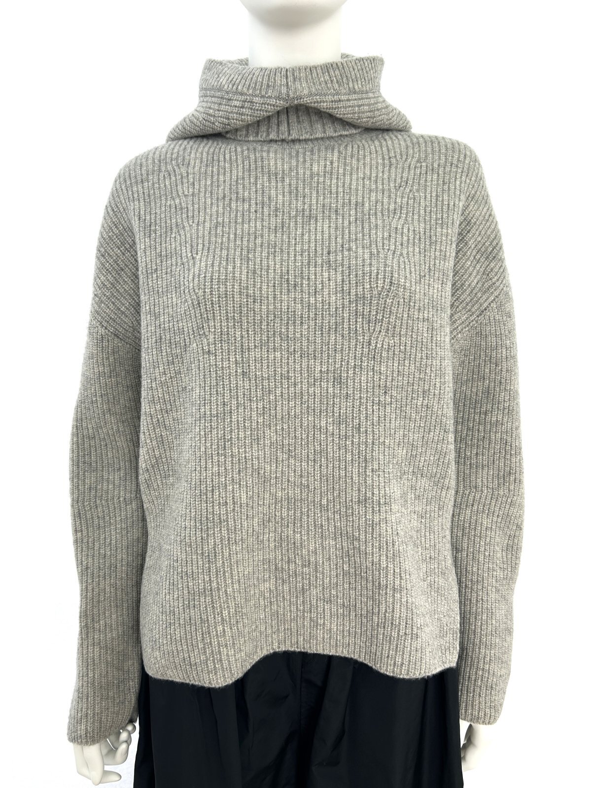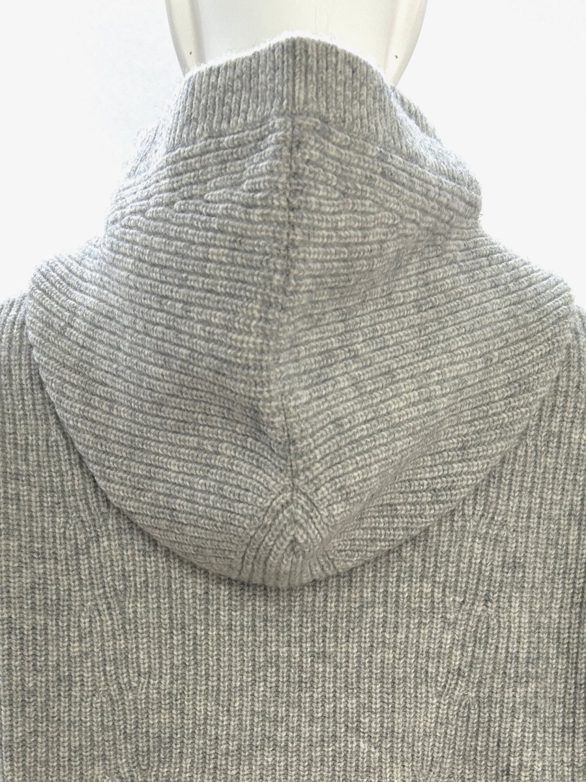 ネックウォーマーの様に取り外せ、首元にボリュームを出せるフードを付けた遊び心あるニットです。
