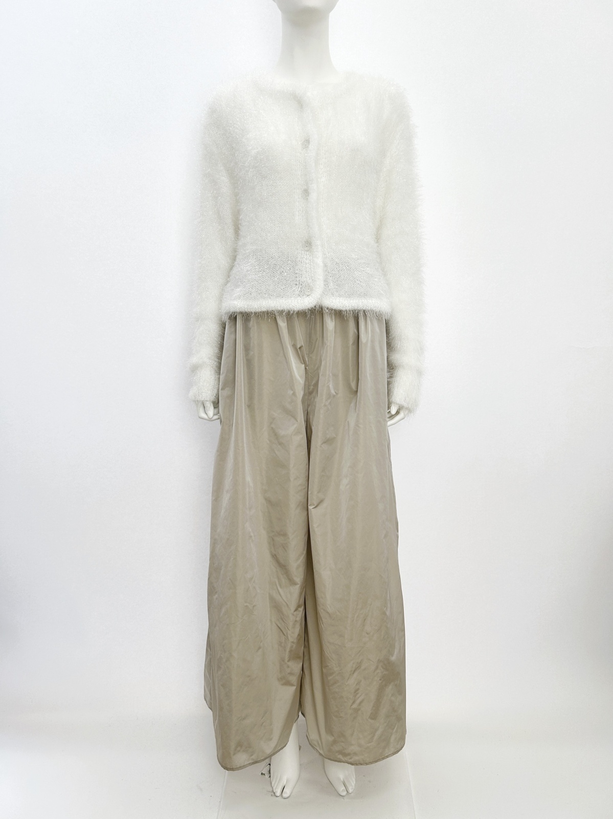 コンパクトでタイトめに仕上げたニットカーディガンはボリュームあるボトムとのバランスが取りやすいアイテム。