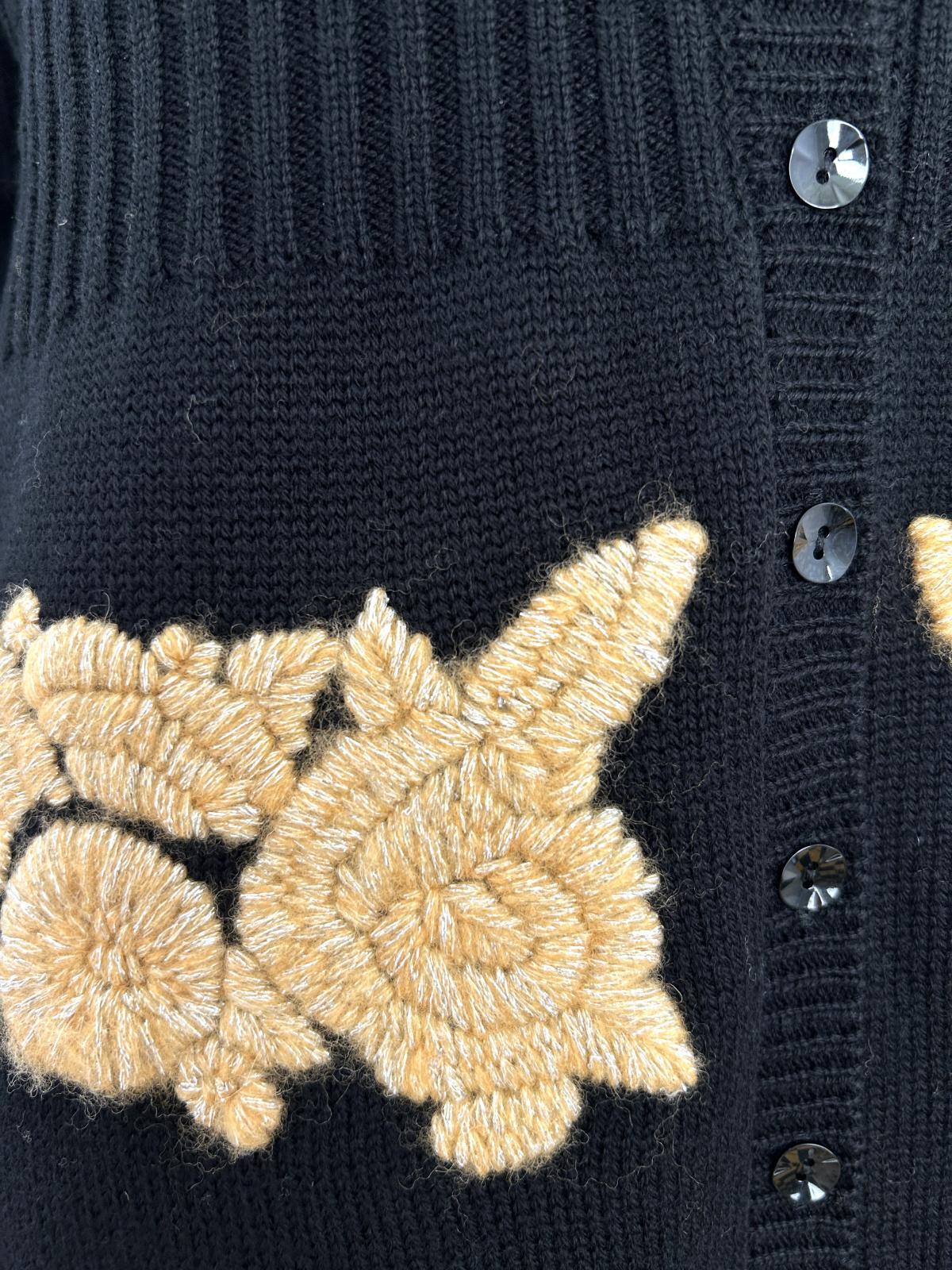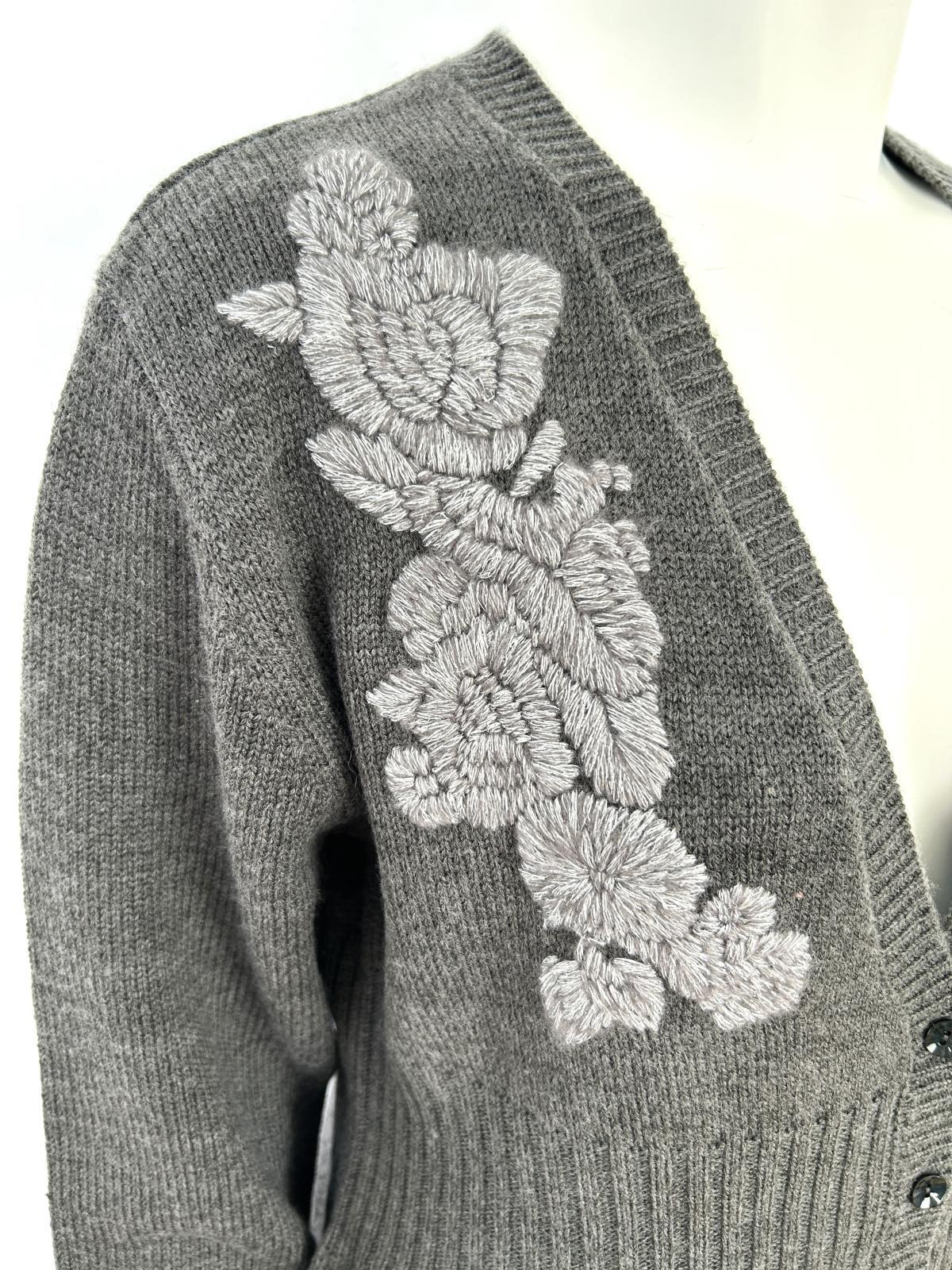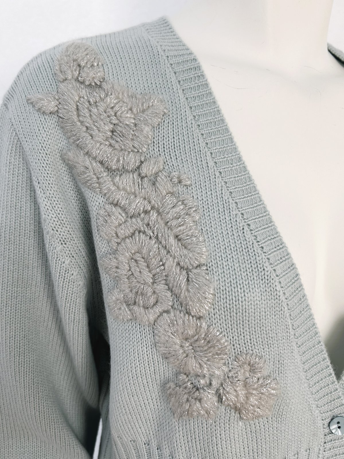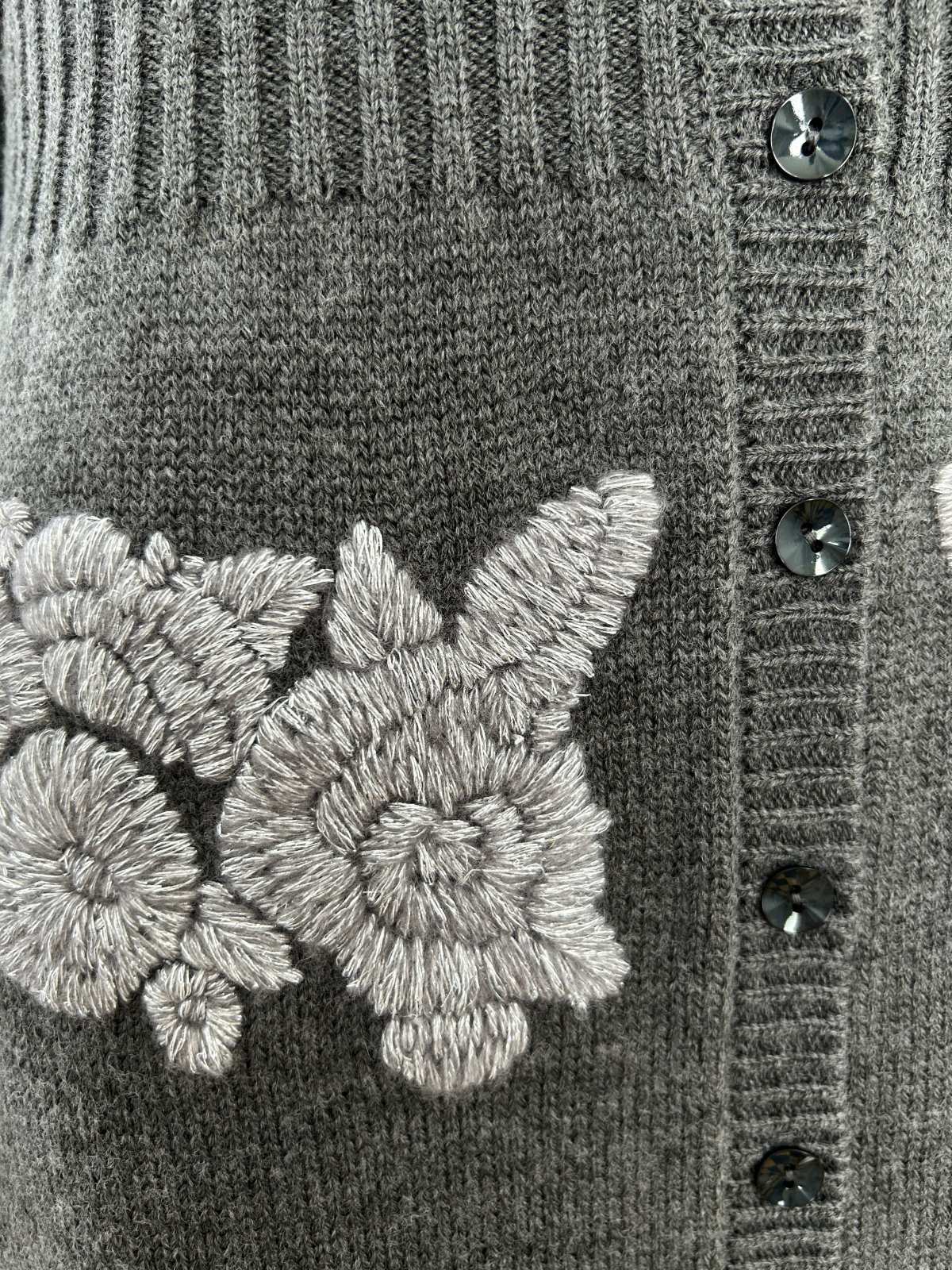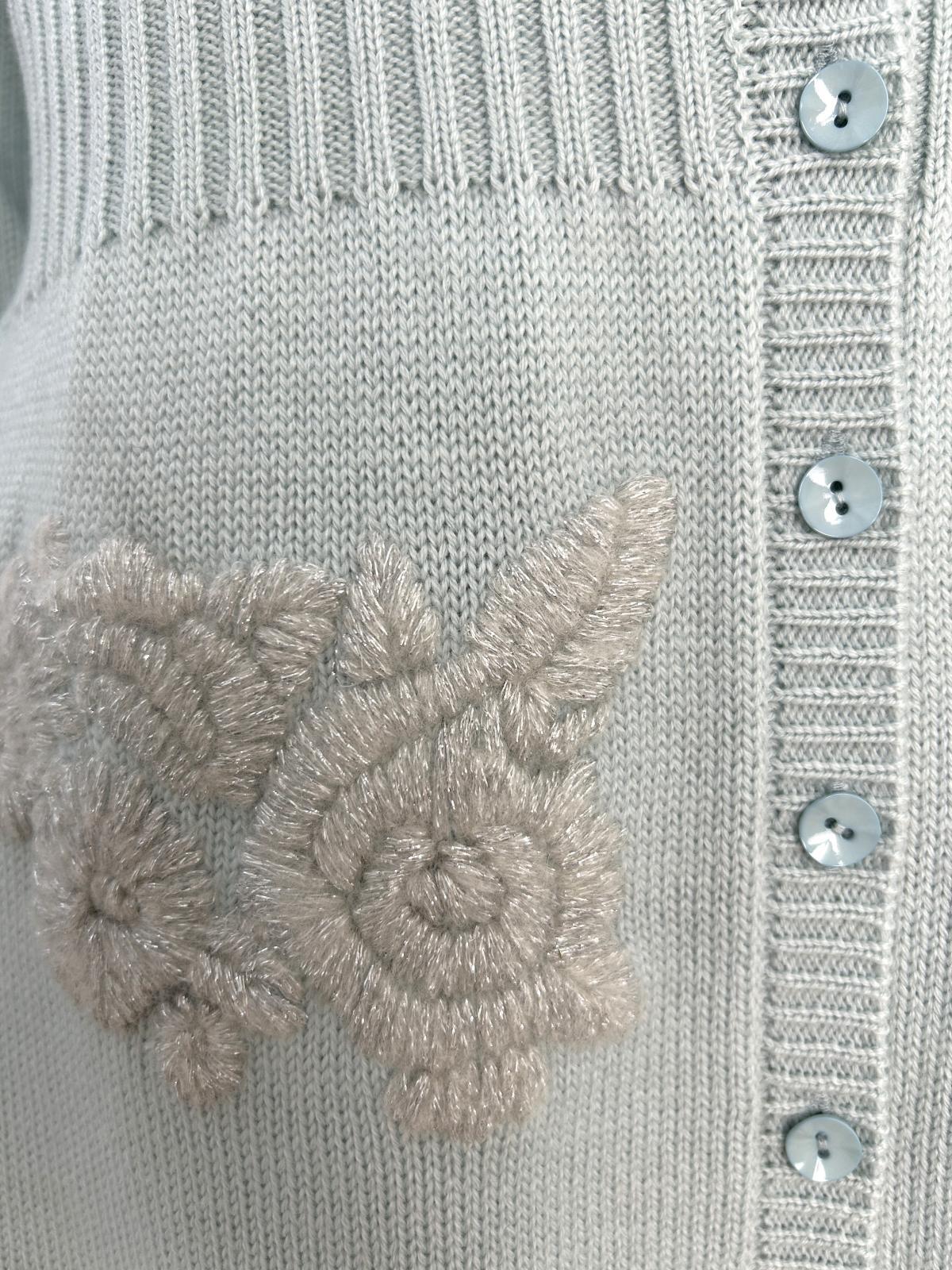 華やかな印象を与える、小さな花の形の刺繍をあしらったニットカーディガン。