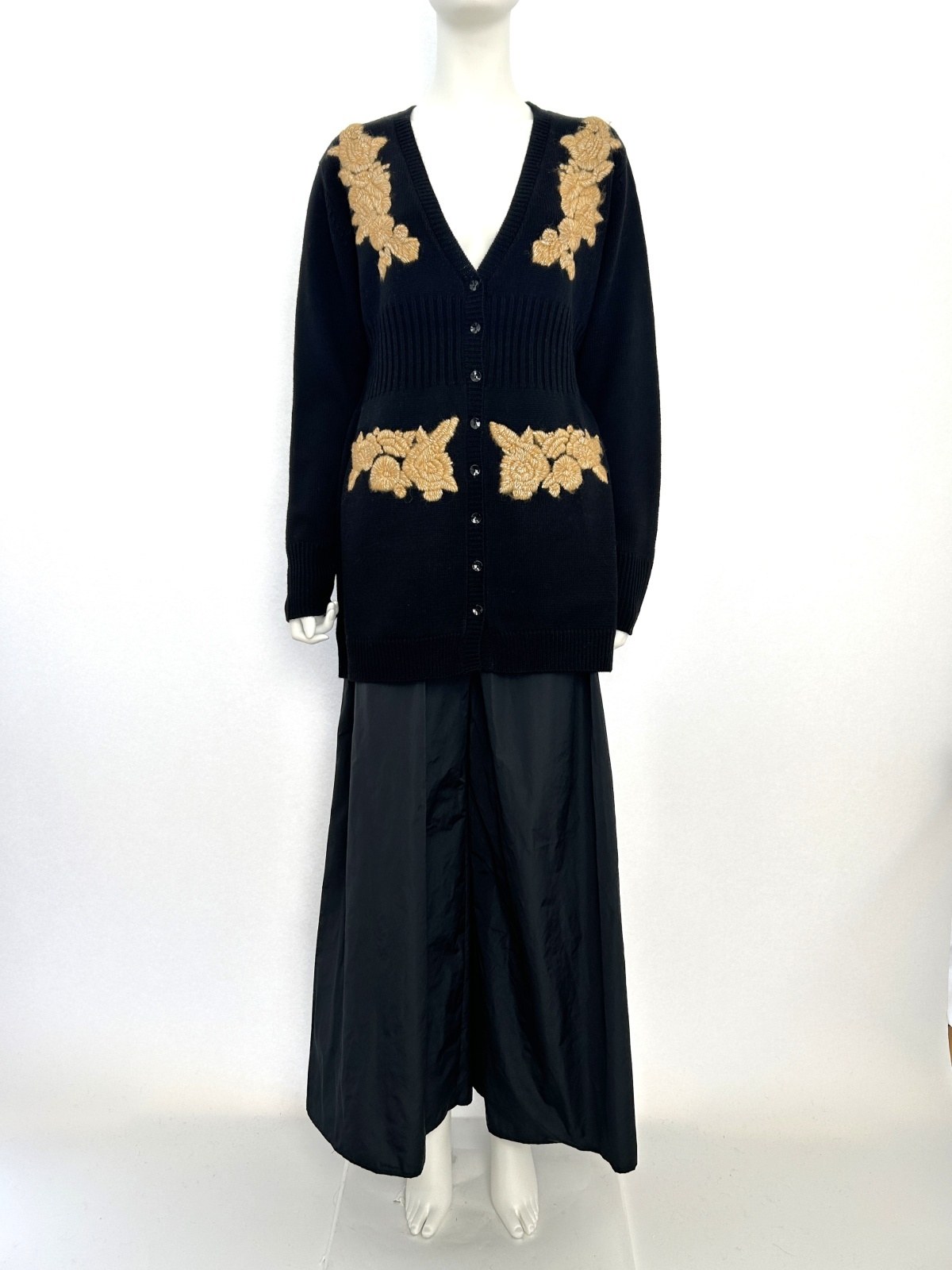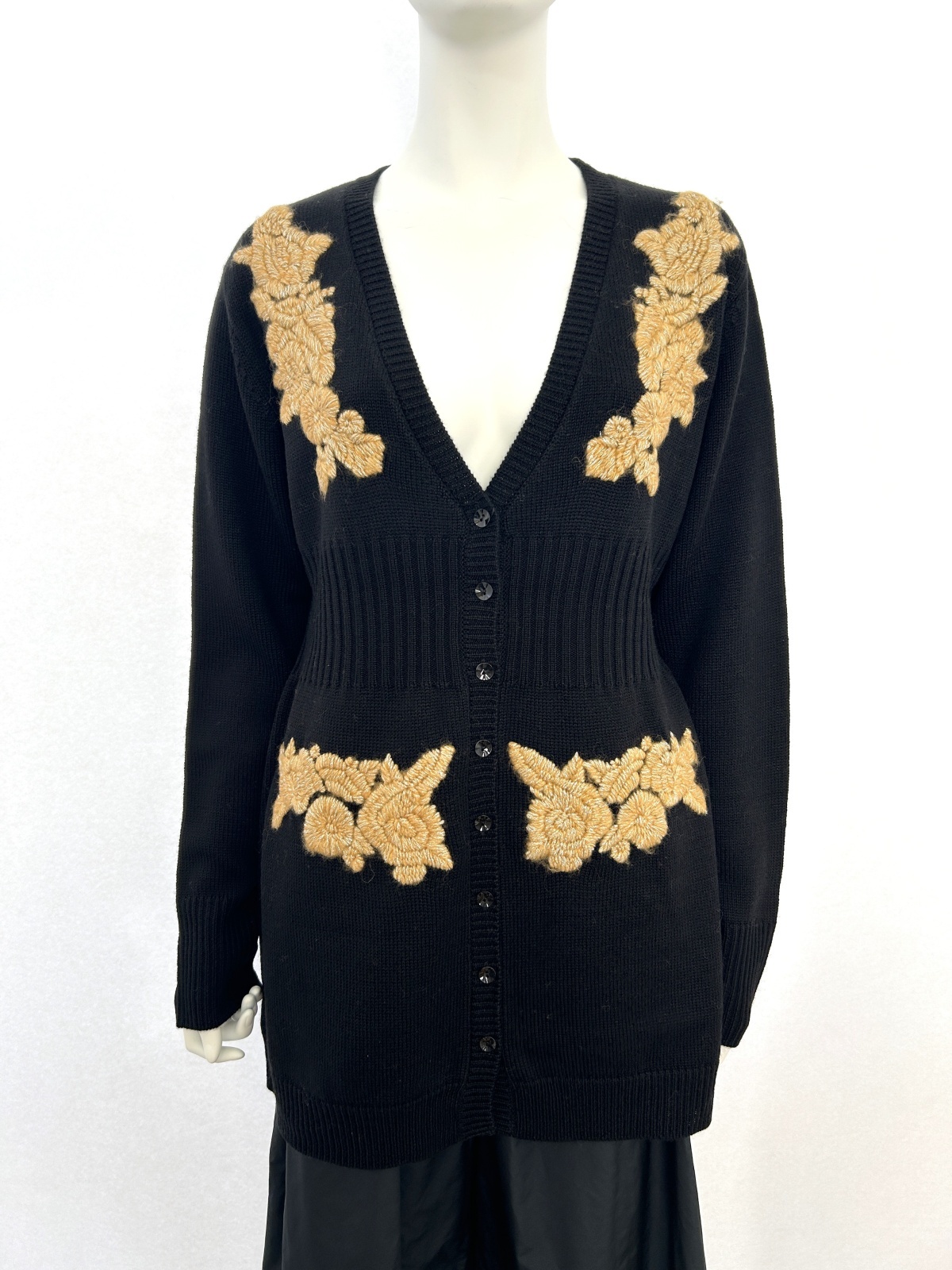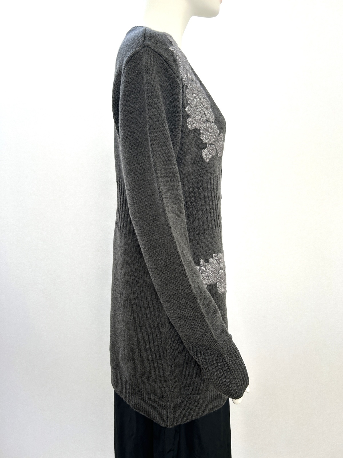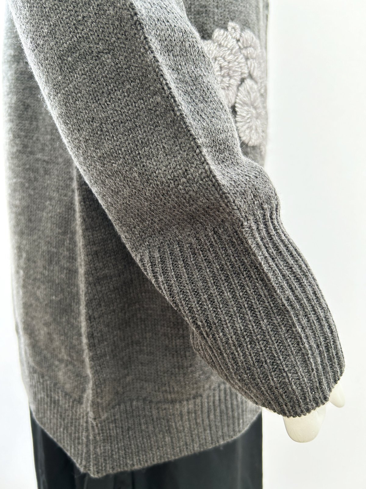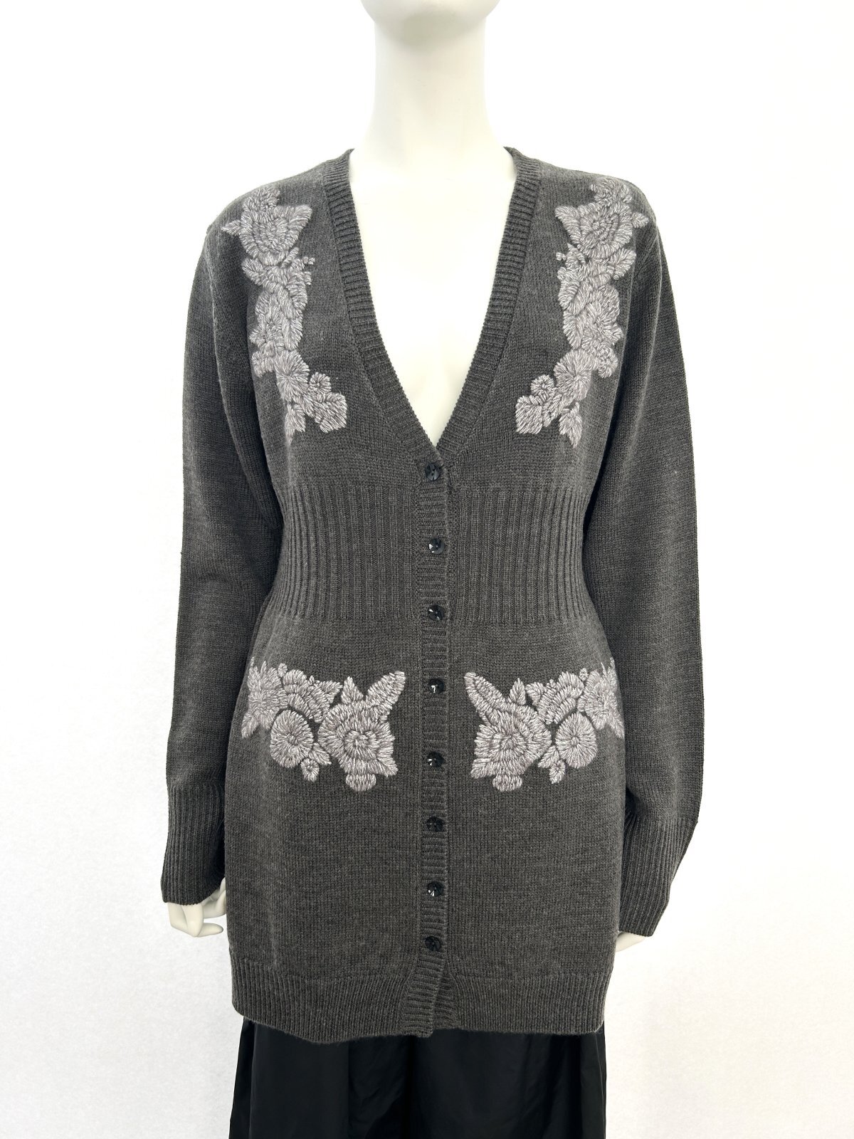 華やかな印象を与える、小さな花の形の刺繍をあしらったニットカーディガン。