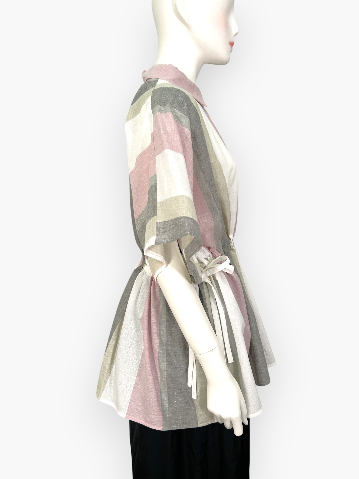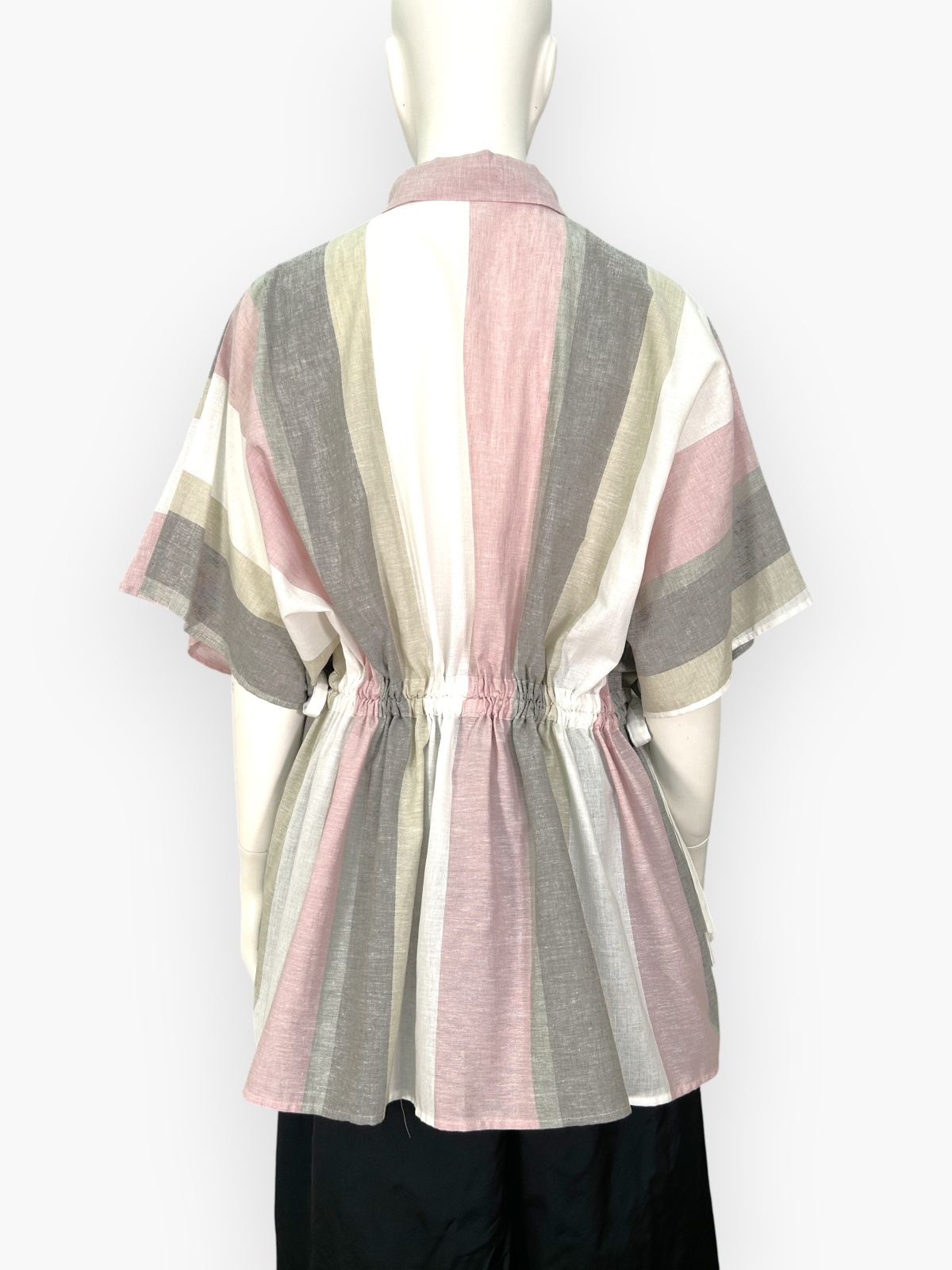 ウエストに通した紐の絞り具合でシルエットに変化をつけられます。