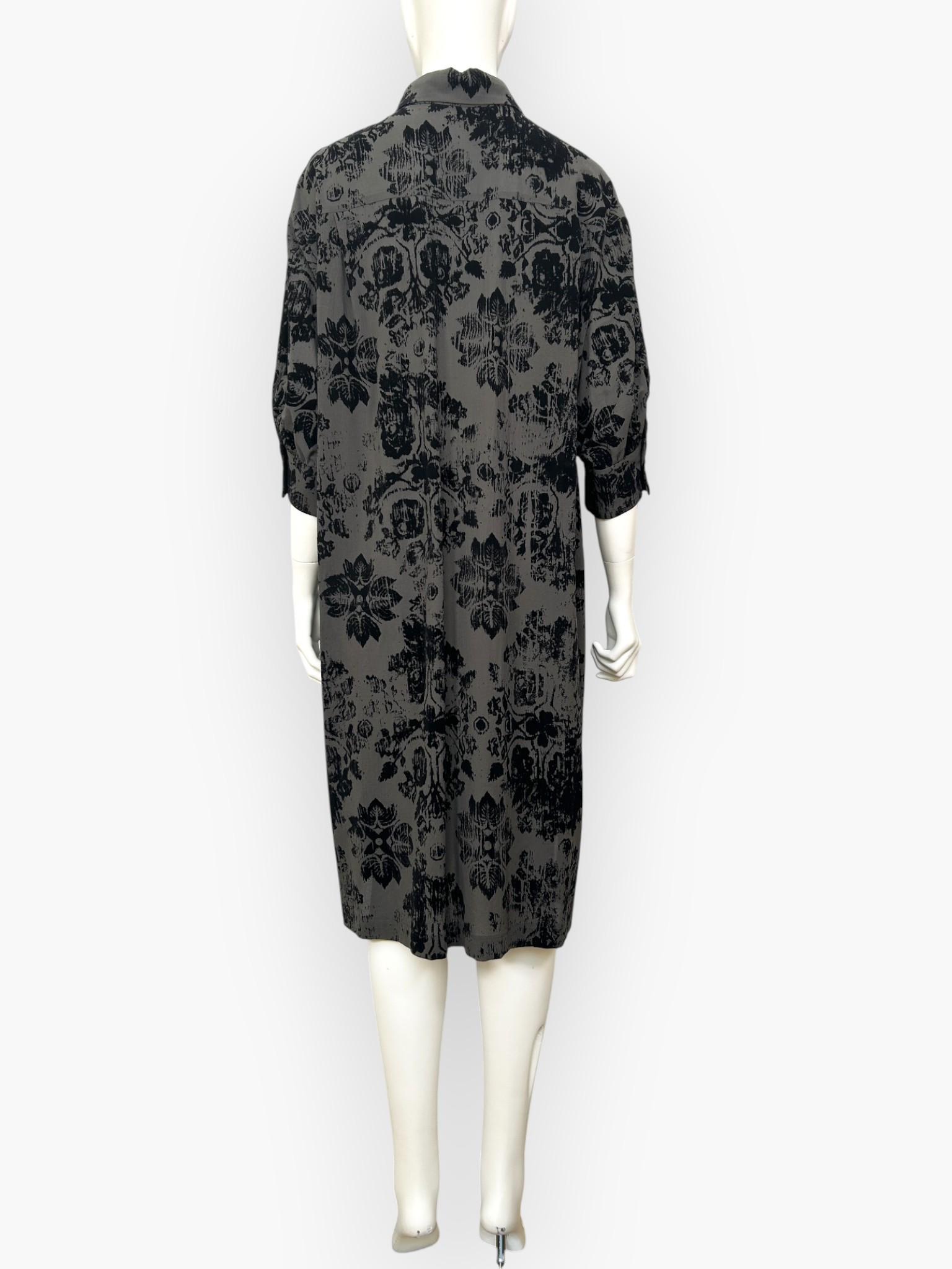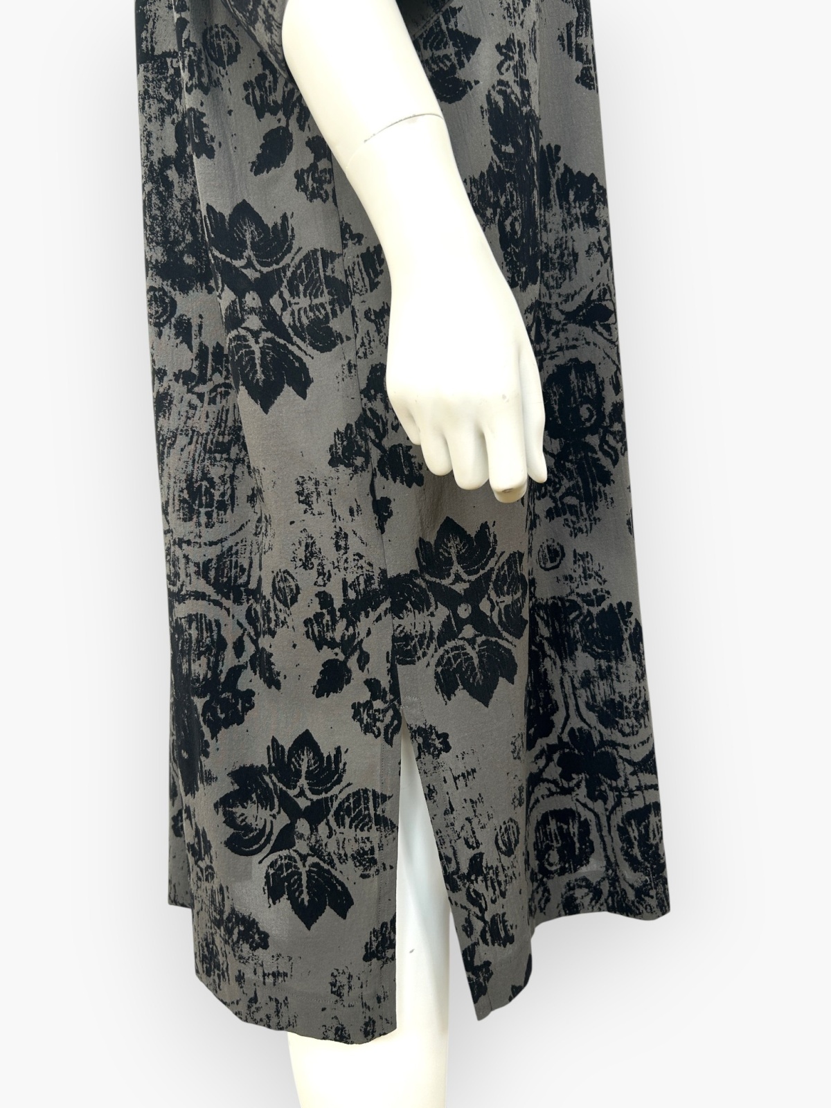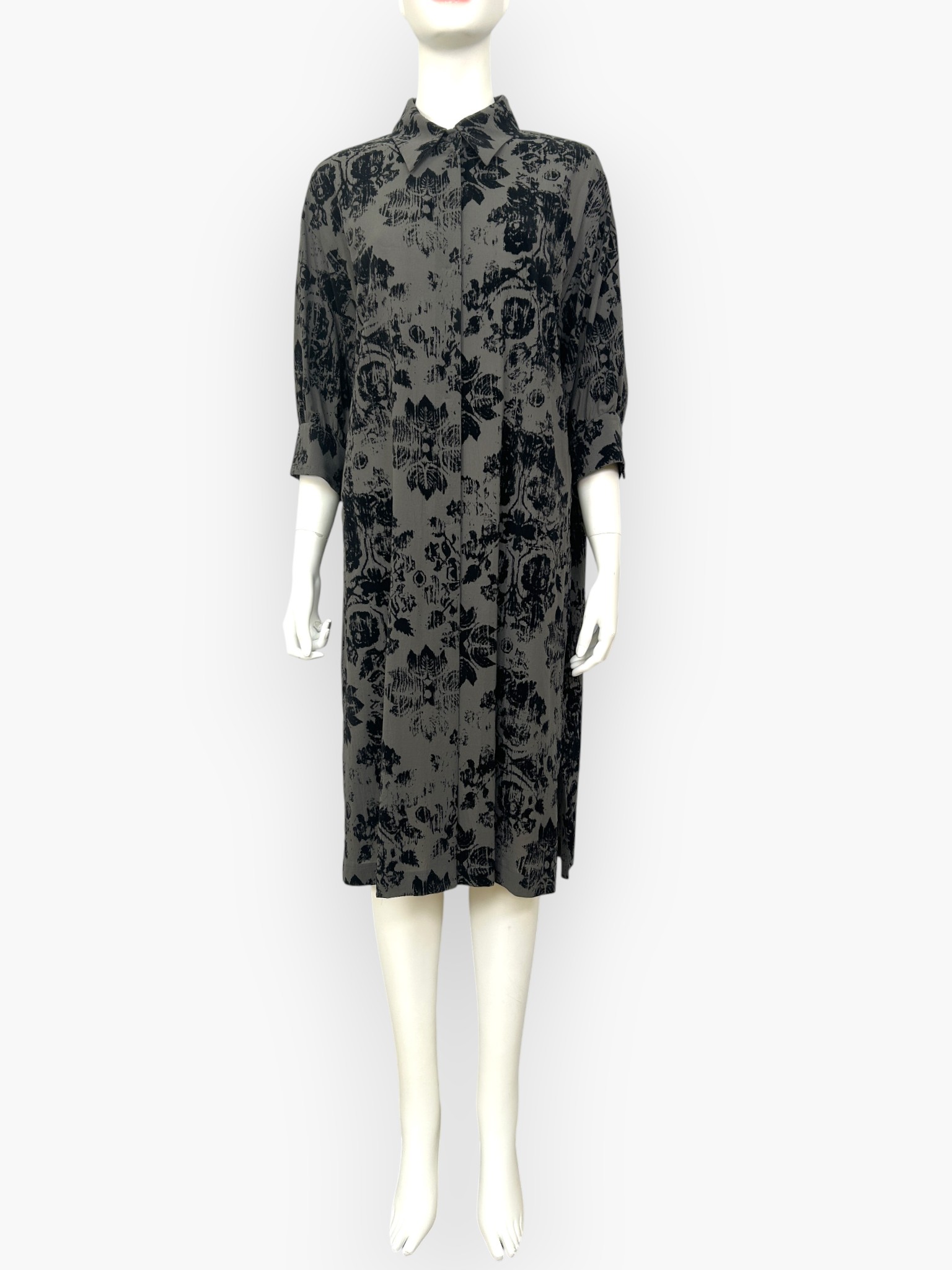 シャビーの効いた壁紙調の美しい柄をフロッキーで表現したロングブラウス。