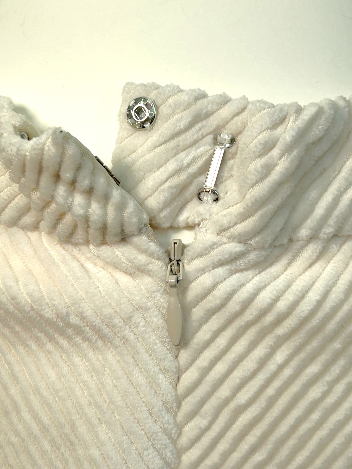 硬くなりがちなコーデュロイ素材をパイル部分に綿・レーヨンの混紡糸、ヨコ糸にポリエステルのストレッチ糸を使用する事で、柔らかな風合いに仕上げた。