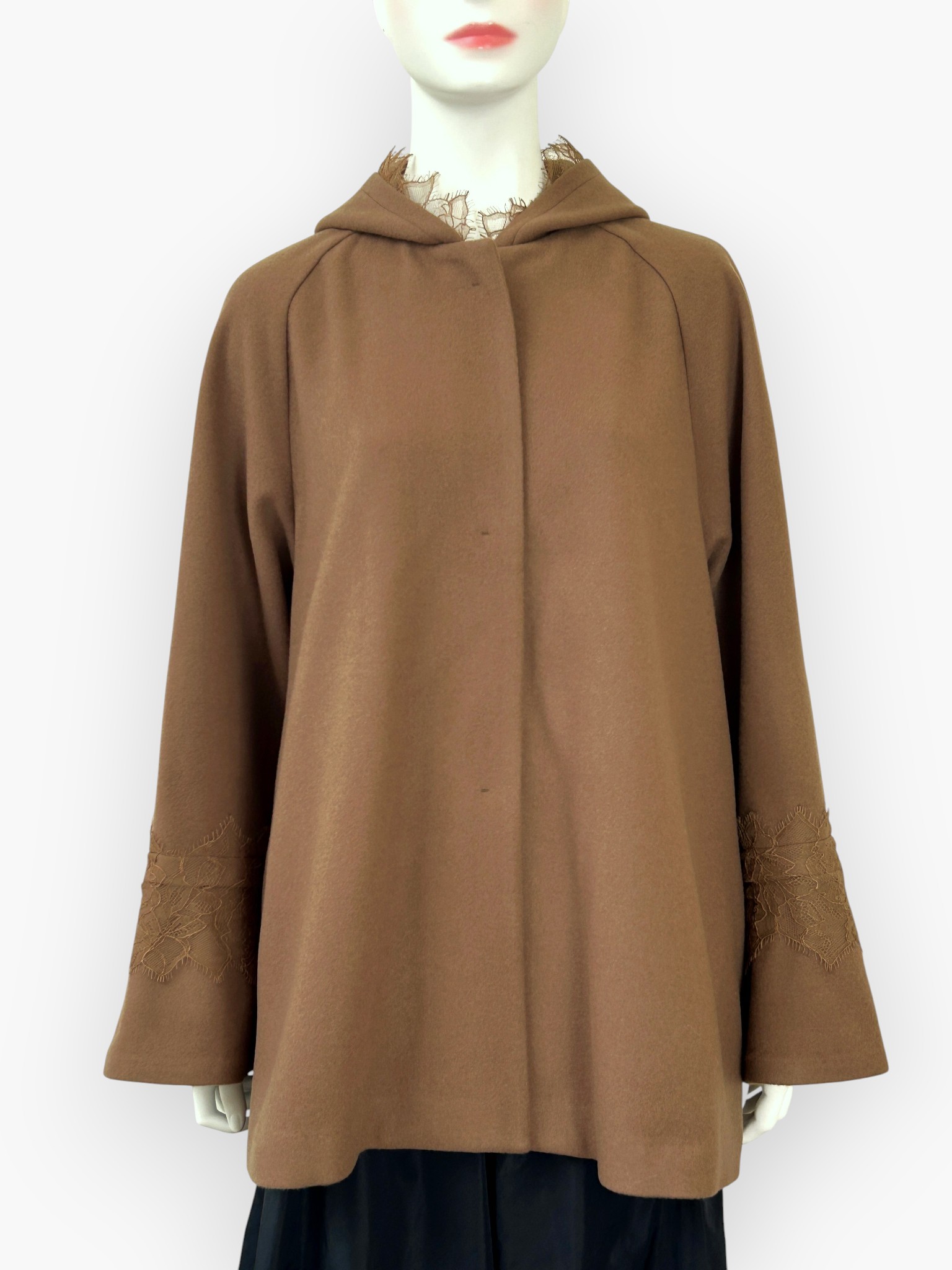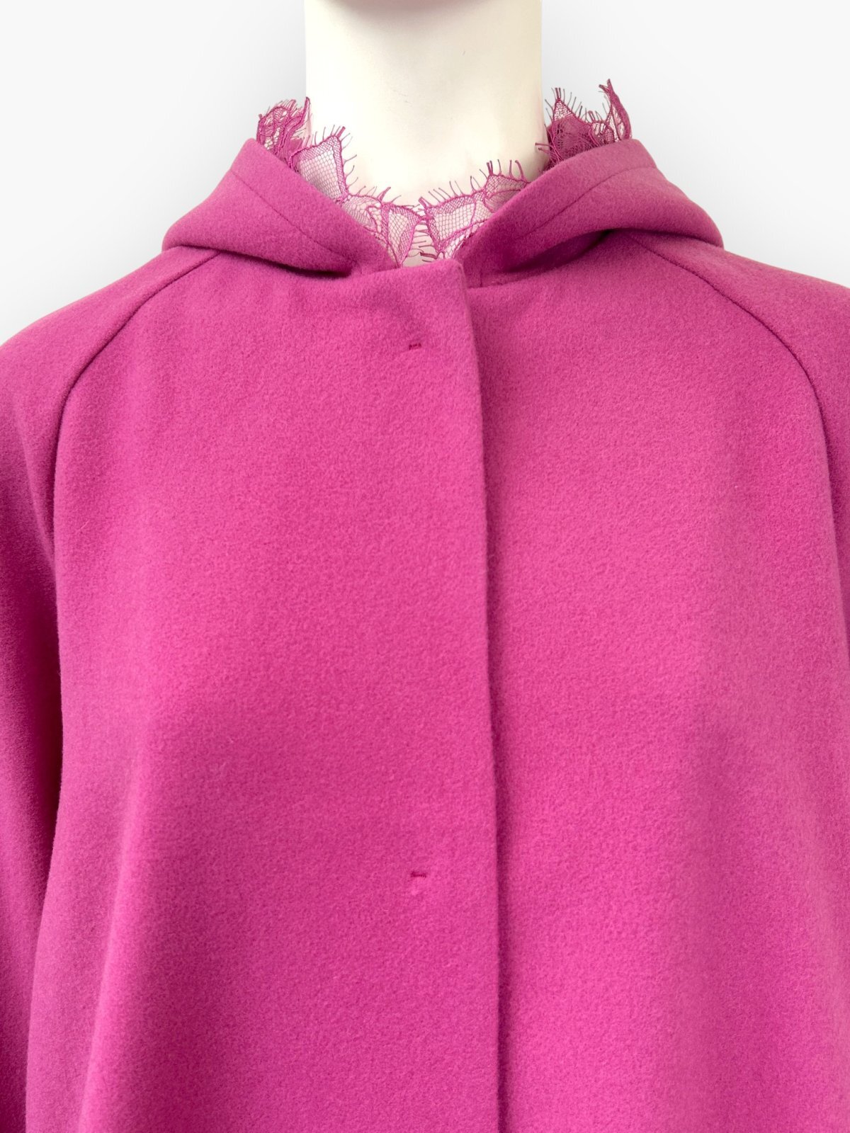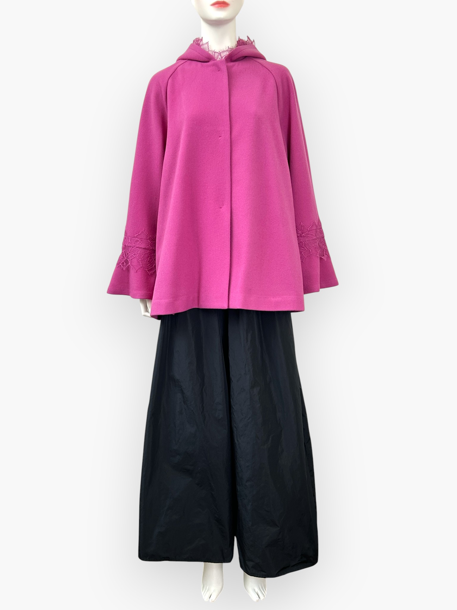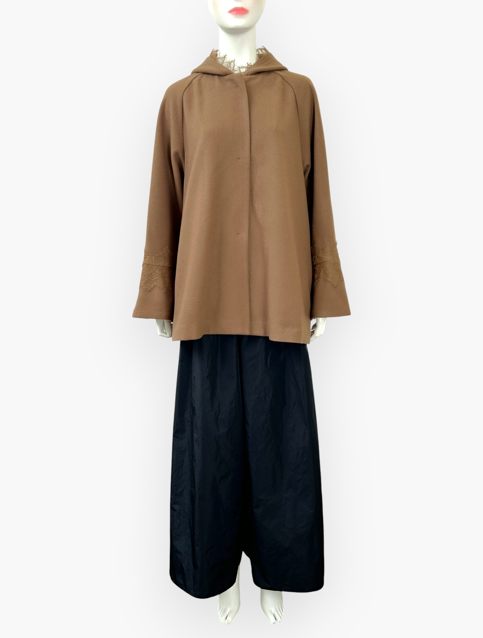 ラムウール100%の柔らかなメルトン生地をふんだんに使用したフード付きコート。