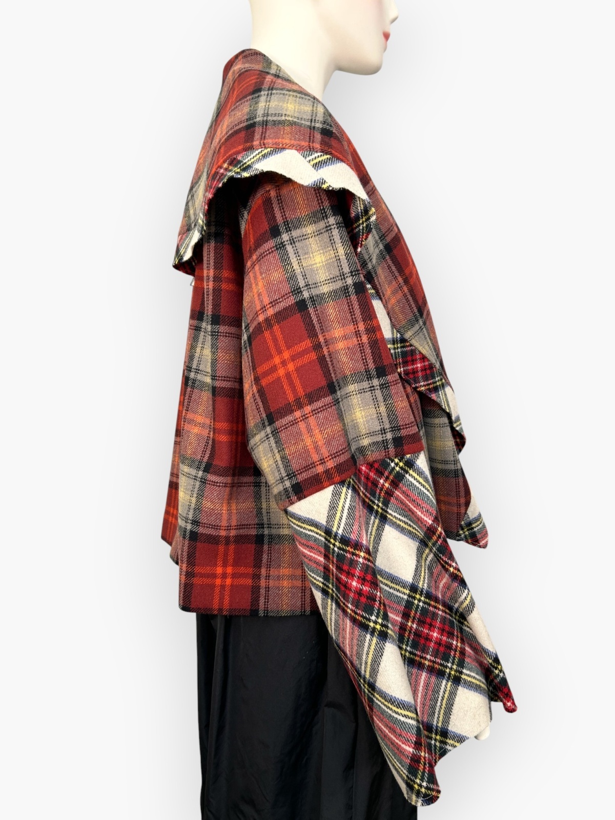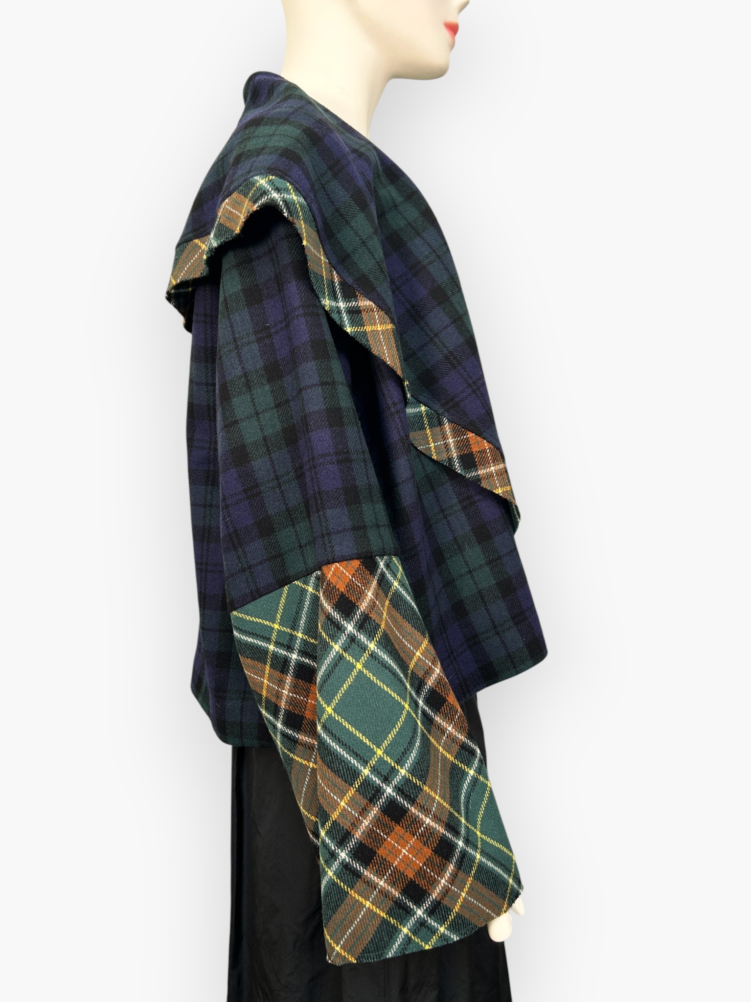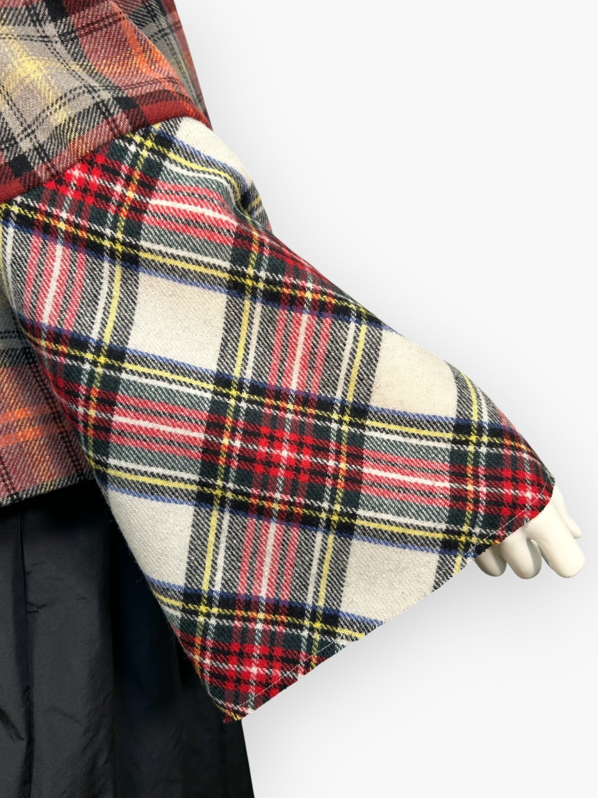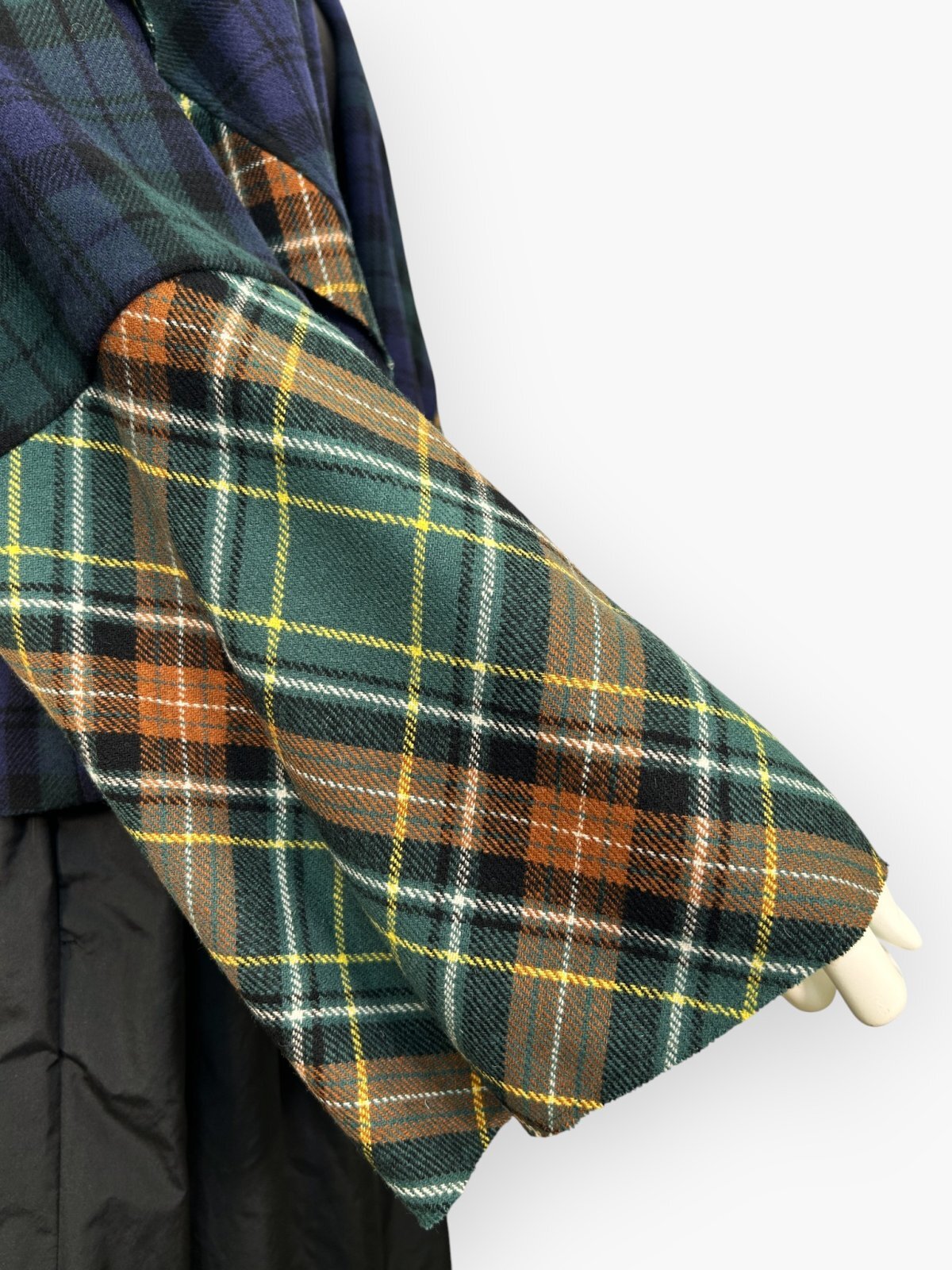 色によって柄の異なる複雑なチェック柄を配色で使用したジャケット。