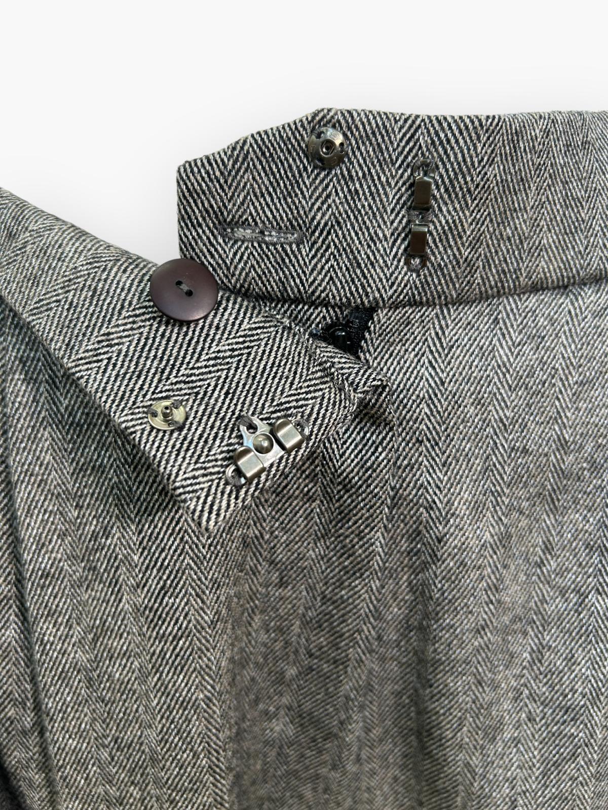 微光沢のレーヨンに梳毛ウール(よく梳くことで滑らかで光沢のあるウール)を巻き付けたつや感のある縦糸を使用する事で品のあるヘリンボーンを表現。