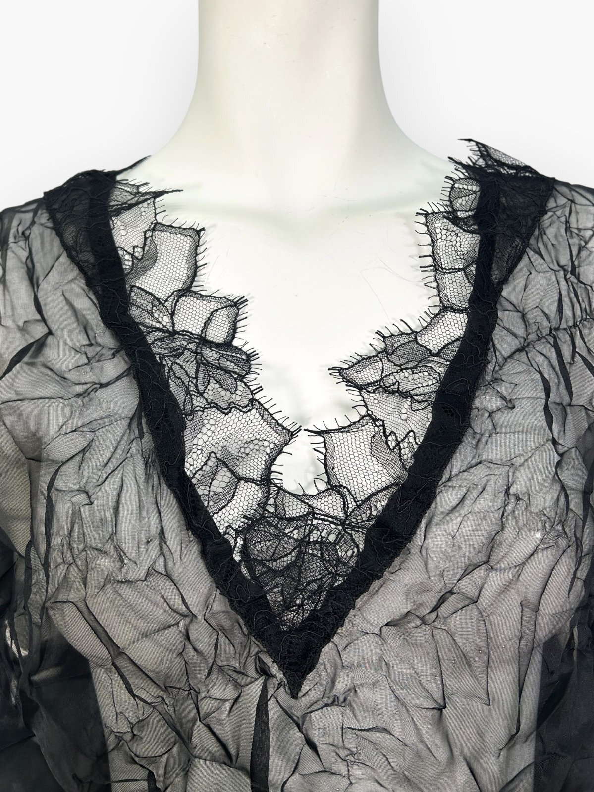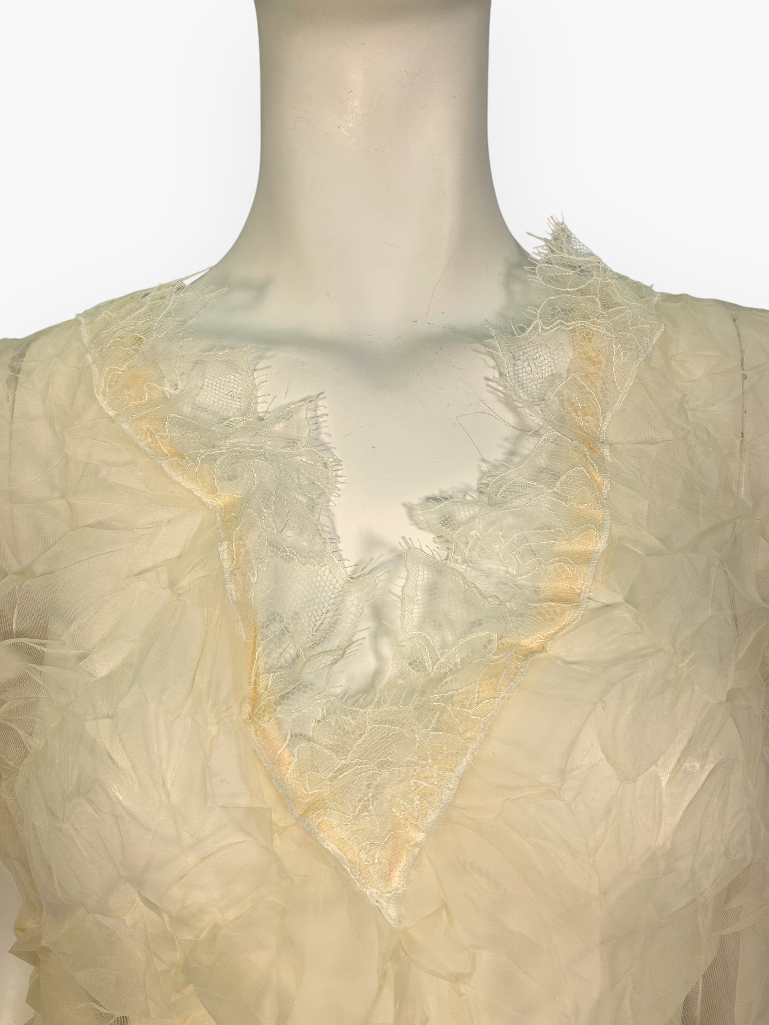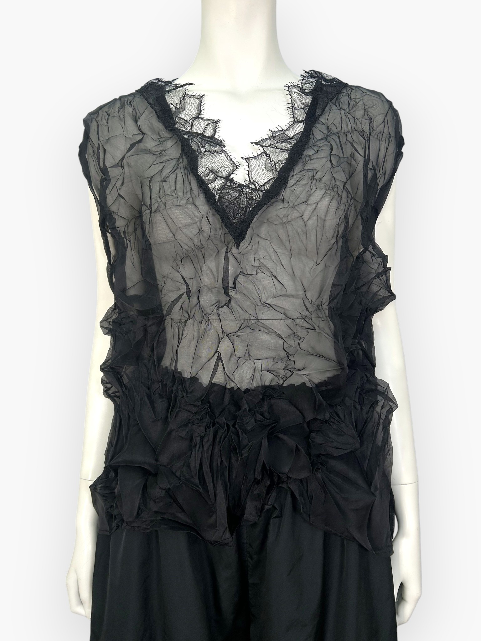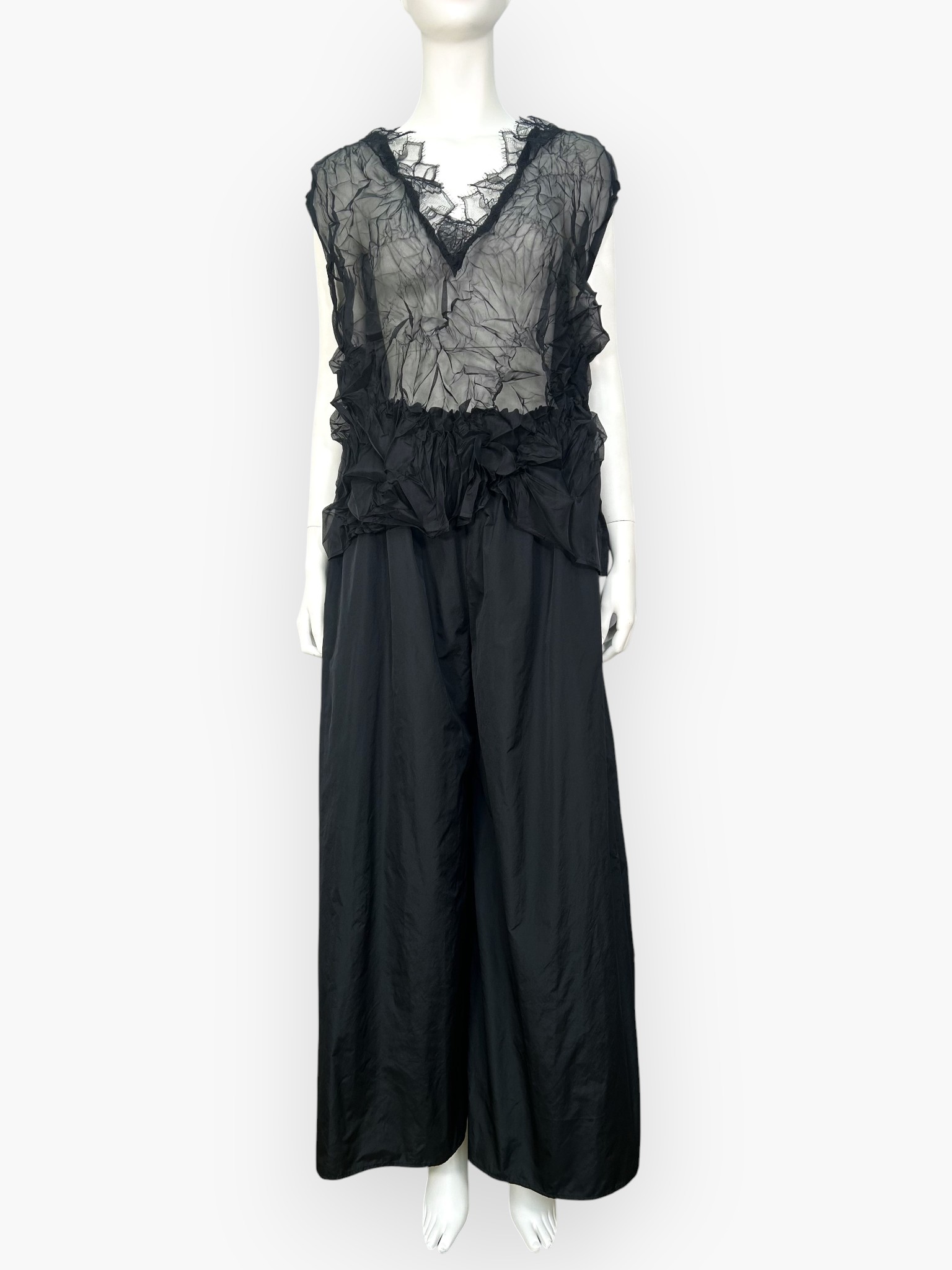 ハンドプリーツならではの不規則な表情と軽さ、レース使いの女性らしい襟元が魅力です。