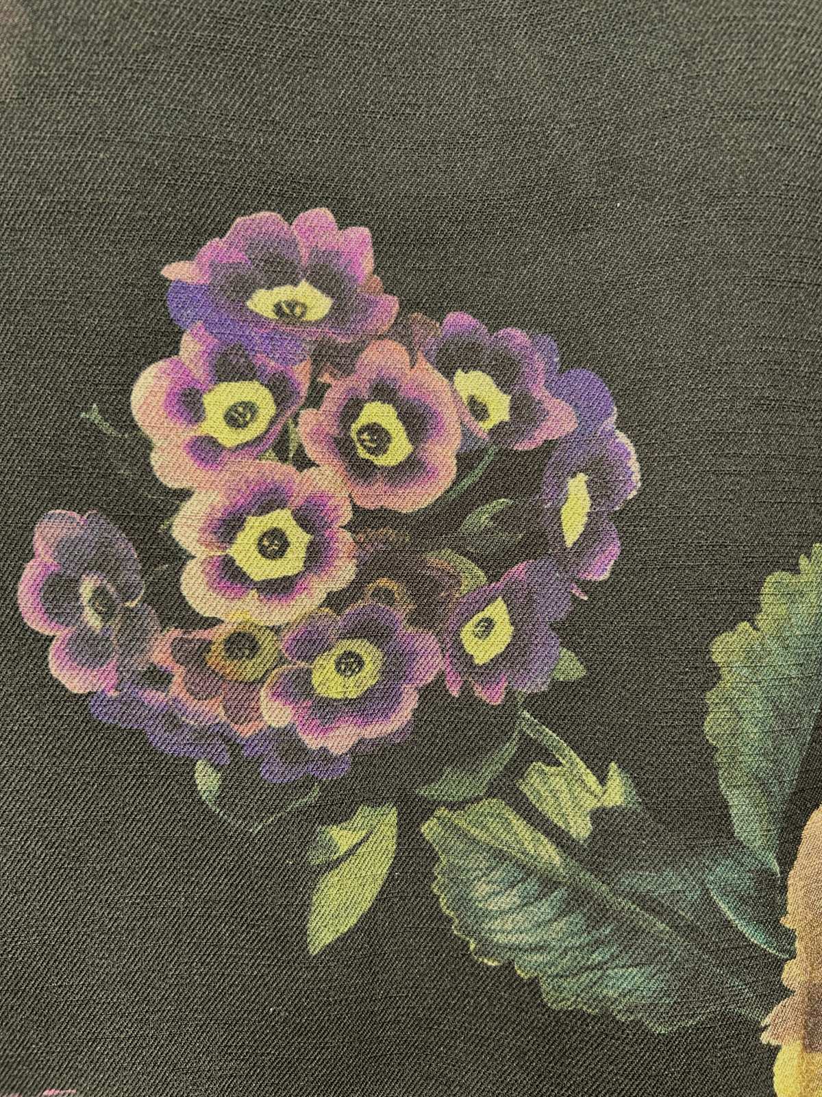 アネモネ、プリムラオーリキュラ、ピオニーといった、鮮やかで個性的な花を集めて散りばめた大胆なオリジナル柄です。